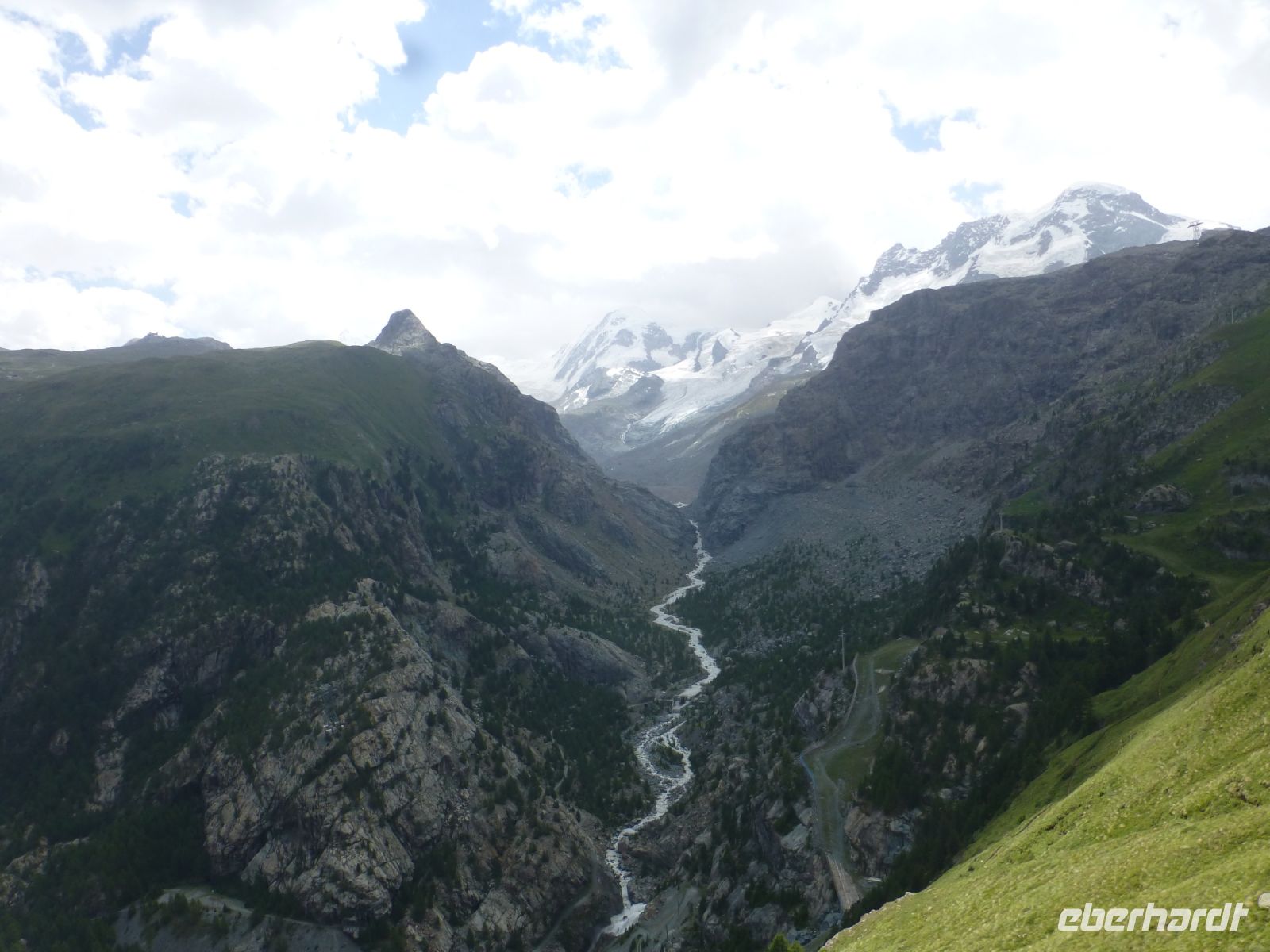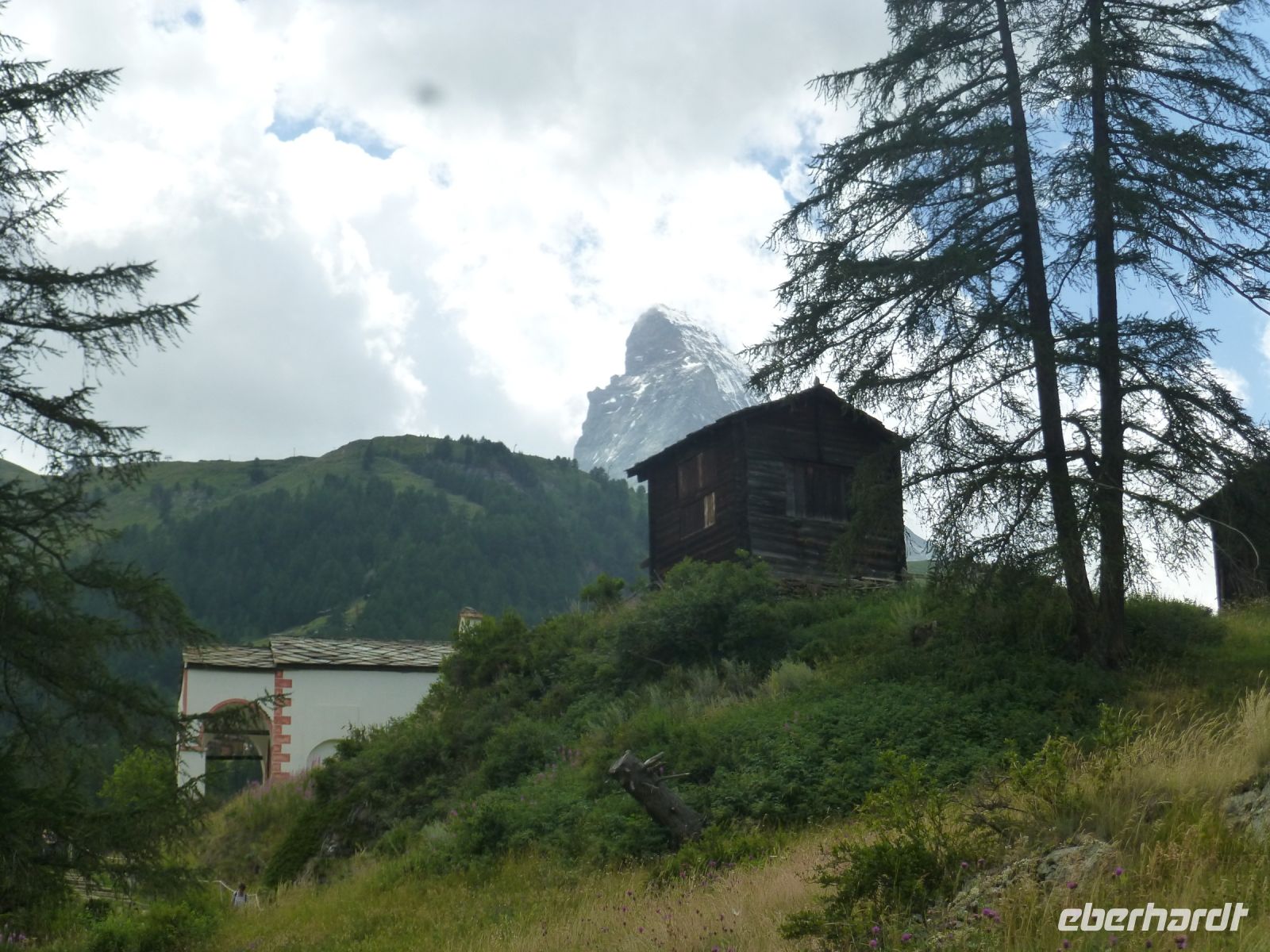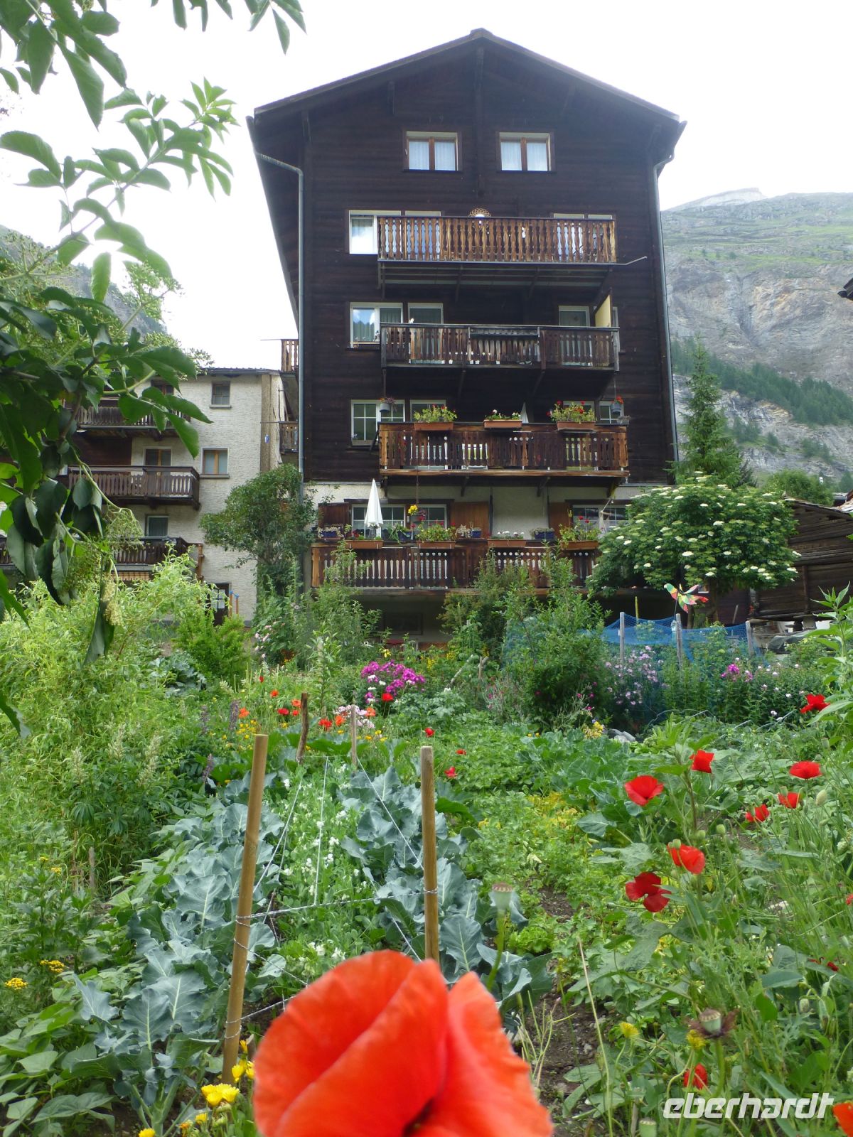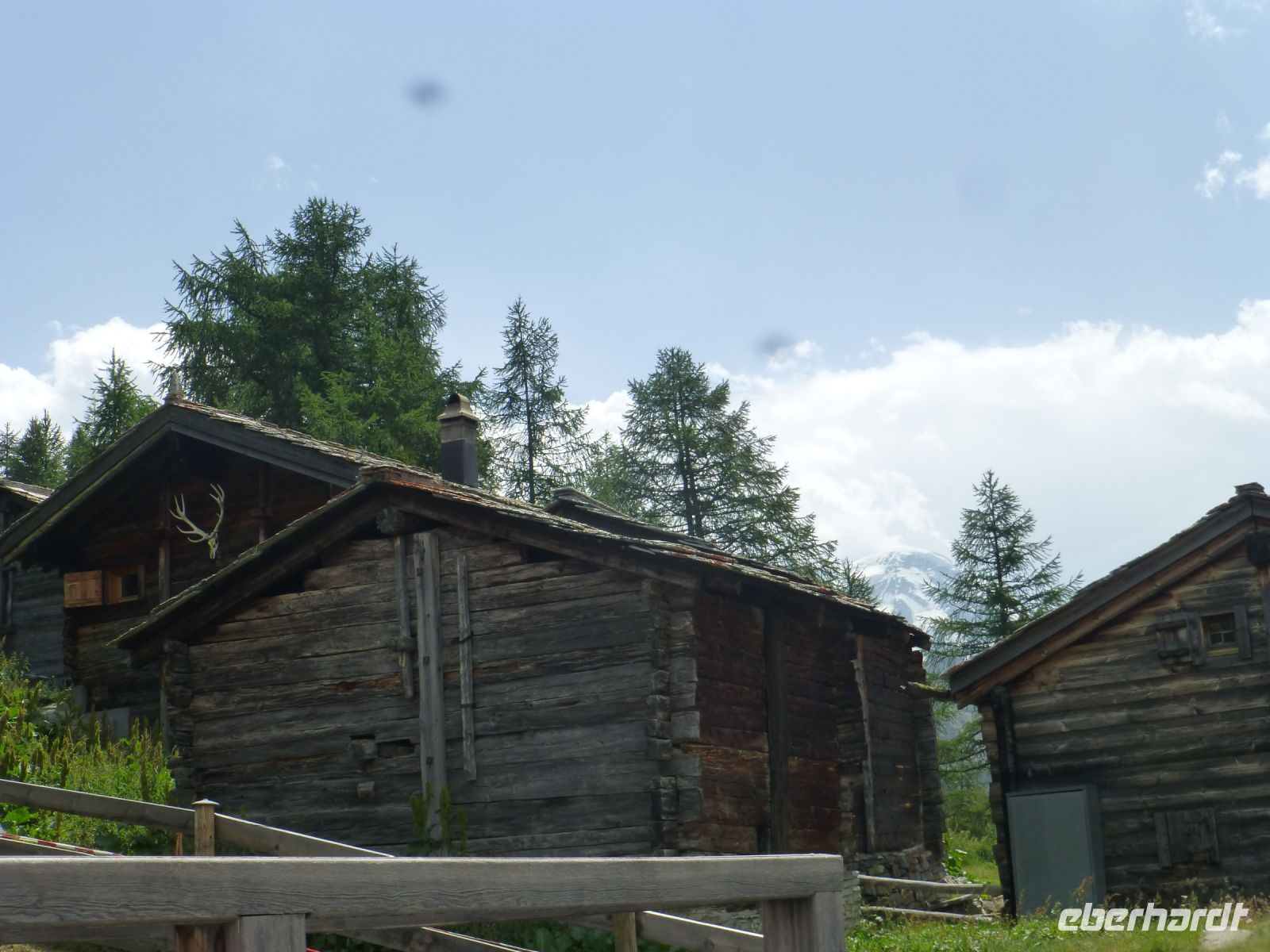 Wir fahren wieder nach unten und steigen bei Furi aus. Hier beginnt unser Wanderweg, der sich durch satte Wiesen schlängelt. In Blatten steht ein Gasthaus wie in einem Museumsdorf. Wir finden zu 18 tätsächlich zur besten Mittagessenszeit Tische und lassen uns verwöhnen mit Aprikosenwähe, Kaffee, Rösti und Bier. Was für ein herrlicher Tag und so hatten wir es uns auch gewünscht, doch am Morgen ließ das Wetter nicht auf diesen Verlauf schließen. Wir wandern runter nach Zermatt und beglückwünschen uns zu diesem gelungenen Ausflug.