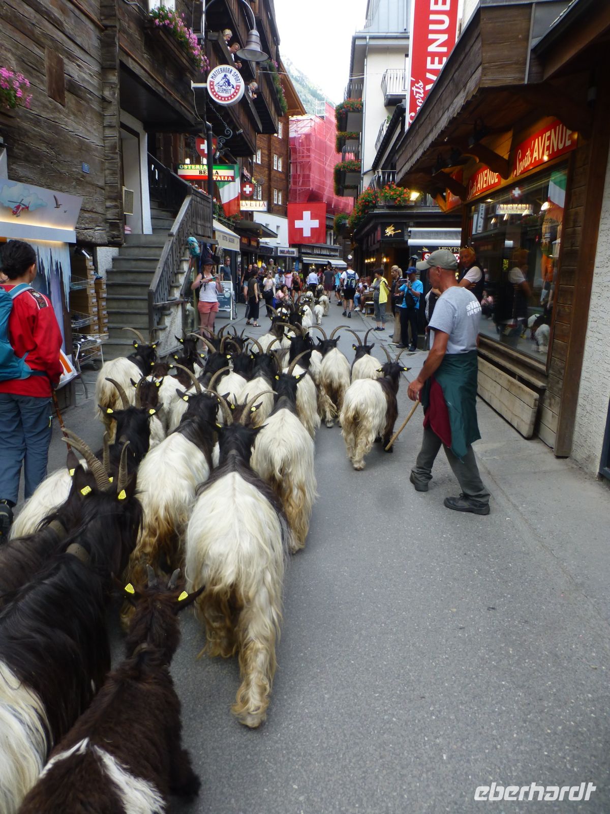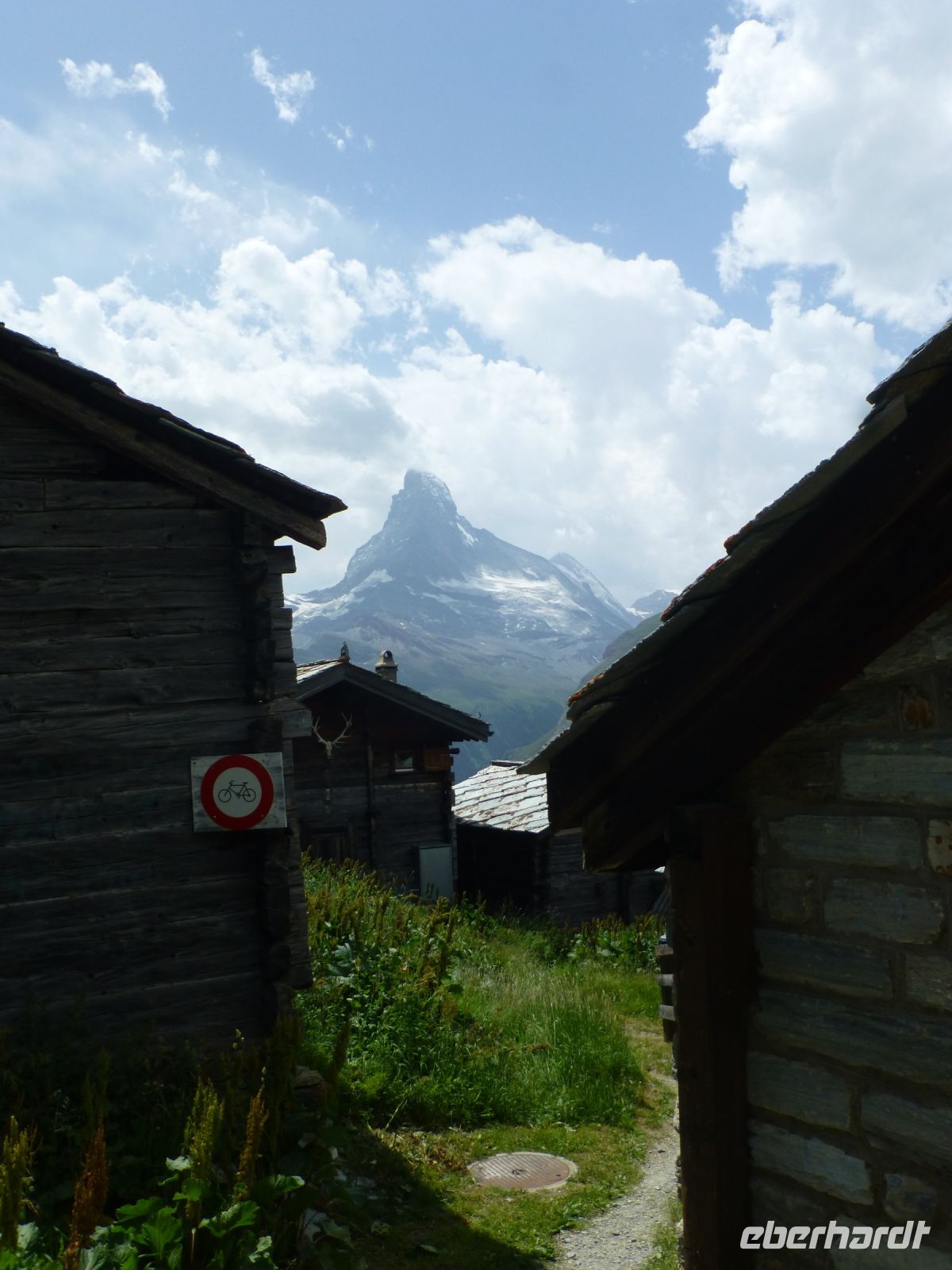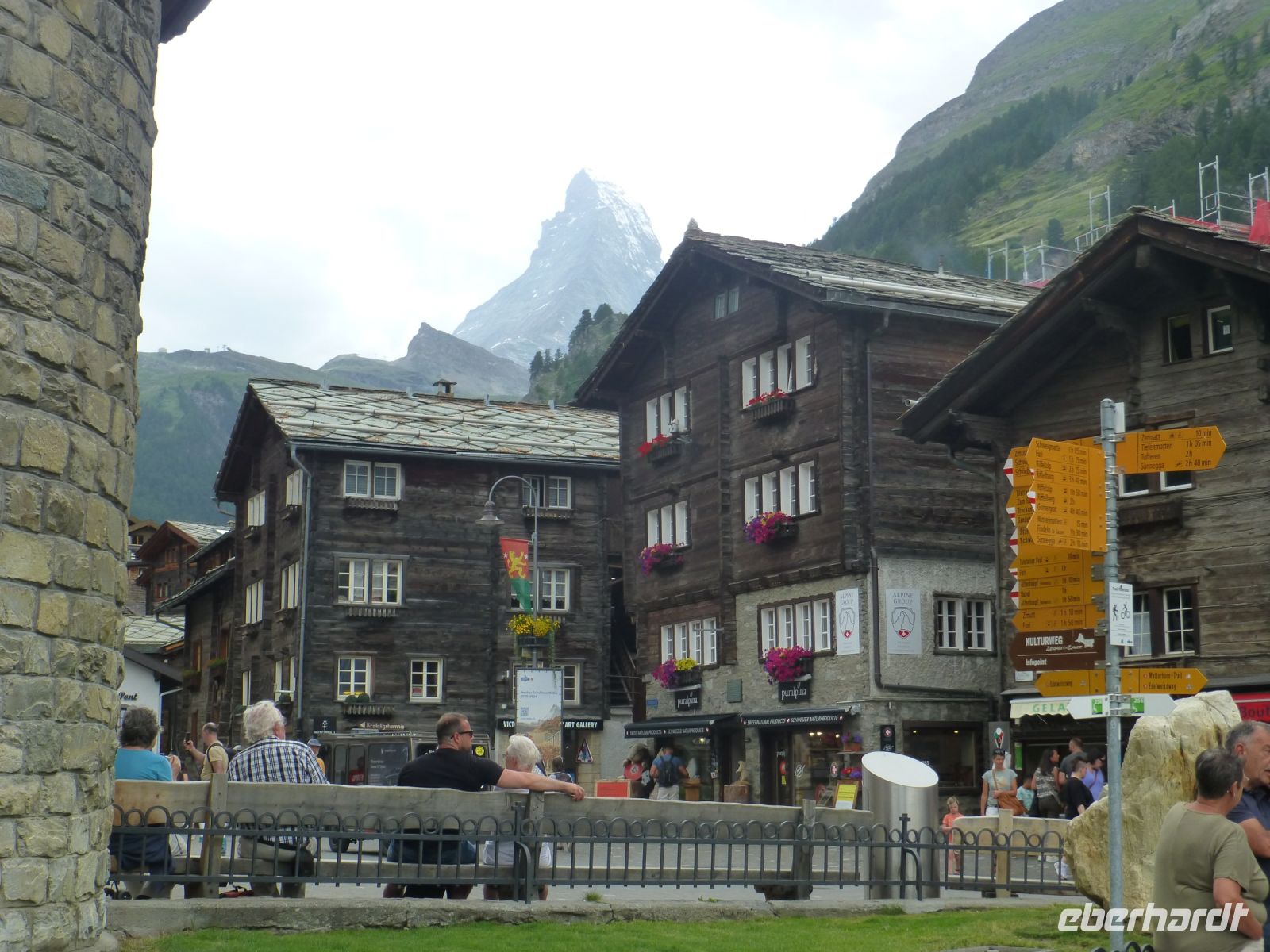 Die Fahrt setzen wir fort nach Täsch. Das Tal hinaus zeigt eine unglaubliche Landschaft. Hinabstürzende Wasserfälle, in der Höhe ein Gletscher, der nach unten zu stürzen scheint und doch sicher hält. Ein großes Felsloch, aus dem auch wieder Wasser sprudelt wie aus einem riesengroßen Brunnen. In Täsch steigen wir auf den Zug um und Jan packt das Gepäck auf einen kleinen Wagen, den wir keine zwei Stunden später vor unserem Hotel Perren sehen. Wir laufen vom Bahnhof eine kurze Strecke zum Hotel, achtpassend auf die vielen Elektrowägelchen, die recht schnell fahren. Und dann halten wir abrupt inne, denn vor unserem Blick erhebt sich das Matterhorn. Im Sommerlook, denn die Werbung wird immer mit dem schneebedeckten Berg gemacht. Vor unserem Hotel rauscht die Visp, wieder ein ungestümes Flüsschen. Wenn man länger hinschaut, kann einem schwindlig werden. Doch soviel Wasser die Schweiz auch hat, die Wiesen werden gesprengt, damit die Kühe auch die gute Milch geben und die Butter schmeckt. Der Geschmacksunterschied wird sehr wohl wahrgenommen von der Gruppe.