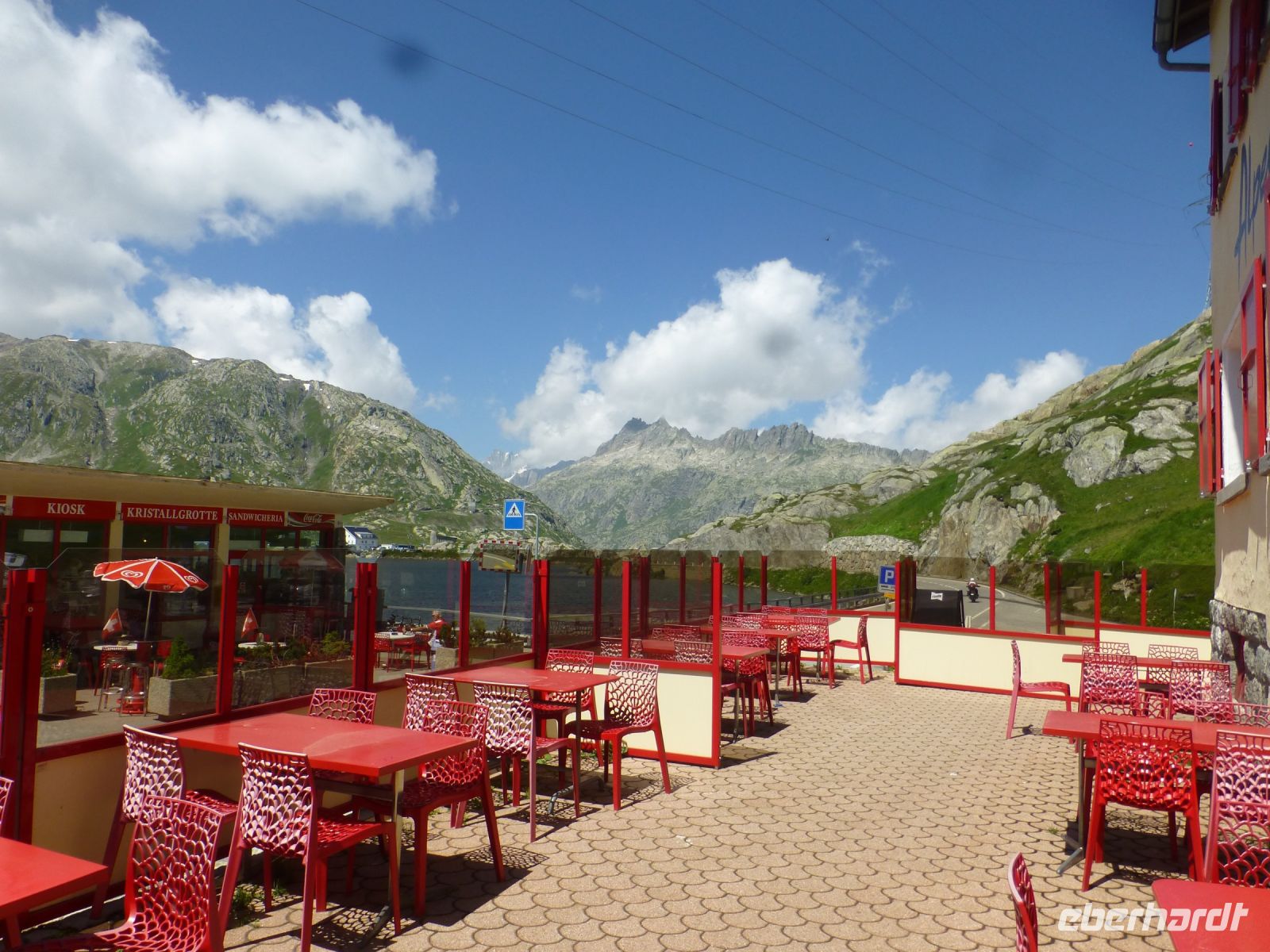 Der Pass ist nun der dritte, nach dem Gotthard und dem Nufenen, und unterscheidet sich von beiden. In Kehren schraubt sich der Bus nach oben. Da die Passstraße erst 1972 durchgängig fertiggestellt worden ist, ist die Straße trotz ihrer Kurven gut zu fahren. Wir schrauben uns nach oben, rechts der Furkapass mit dem Hotel Belvedere. Auf dem Pass kurze Pause, wir grüßen die Murmeltiere und genießen die Aussicht, bevor es wieder nach unten geht. Jan erinnert sich an eine Parkbucht, die er ansteuert. Was für eine grandiose Aussicht, die wir während unserer Mittagspause nun haben.