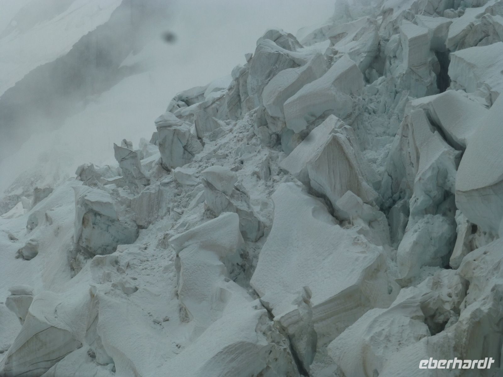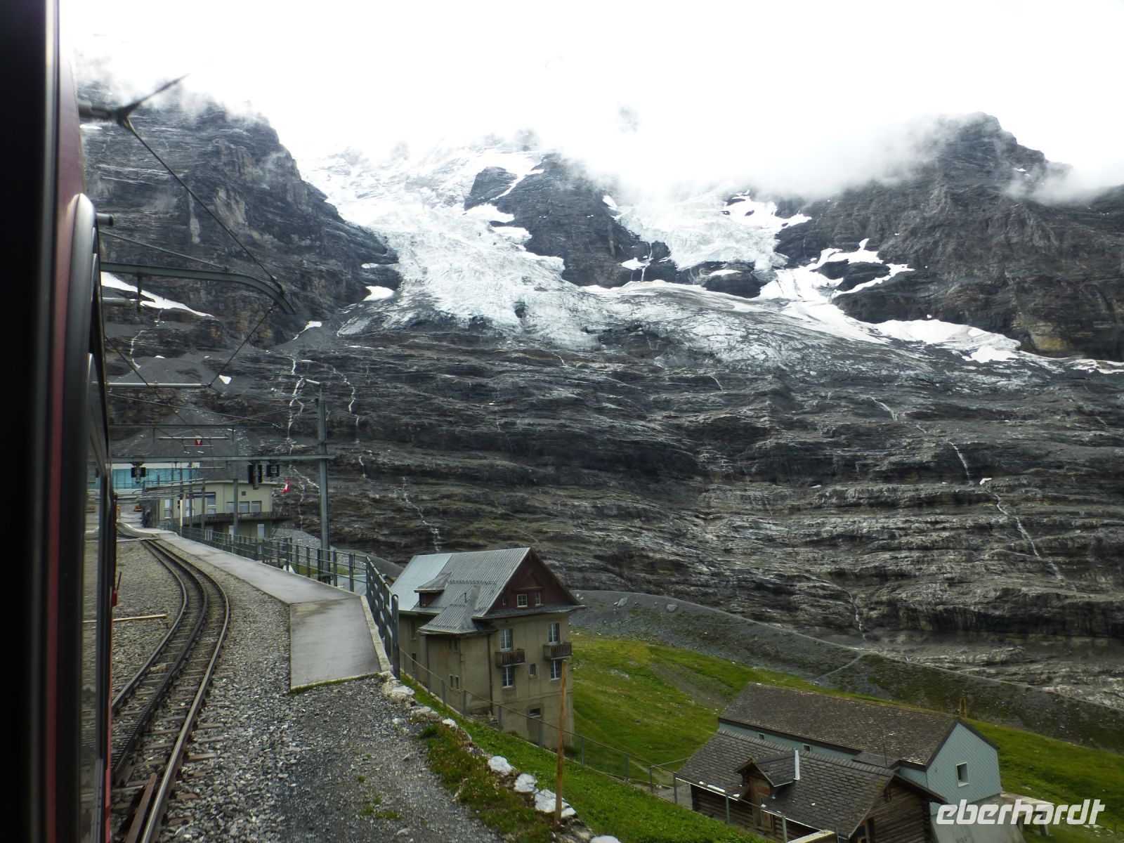 Unverdrossen machen wir uns auf den Weg, fahren von Lauterbrunnen mit der Bahn – in einem für uns reservierten Zugabteil – vorbei an Wengen auf die Kleine Scheidegg. Hier machen wir erst einmal eine Pause, lassen die anderen Reisegäste an uns vorbei und genießen die Stille. Und dann – siehe da – heben sich die Wolken und zeigen uns Eiger, Mönch und Jungfrau fast unverhüllt. Was für ein Schabernack uns das Wetter heute spielt. Wir sind gut gelaunt ob dieser Offenbarung und besteigen den Zug auf die Jungfrau. Am Eismeer machen wir halt und schauen mit Ehrfurcht vom verglasten Balkon aus auf die Gletscherbrocken, die aus dem Verbund brechen. Wie Philadelphia Käse.