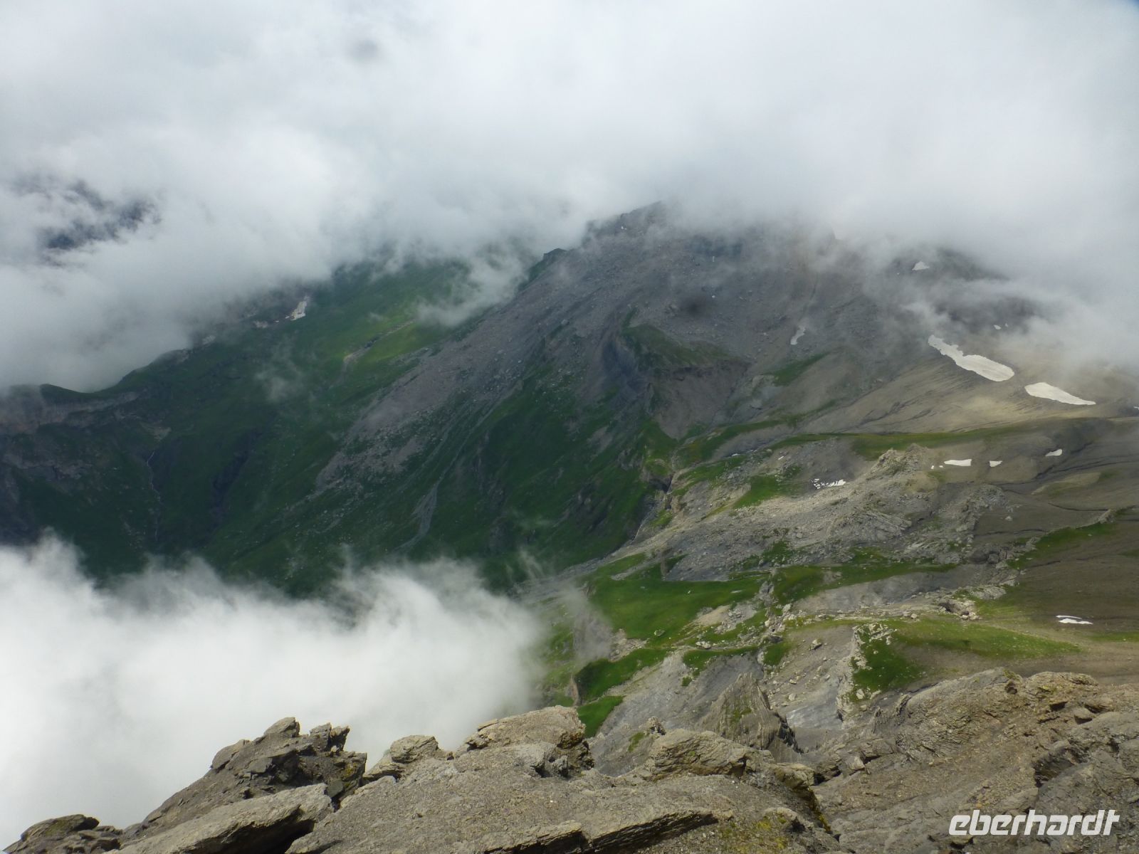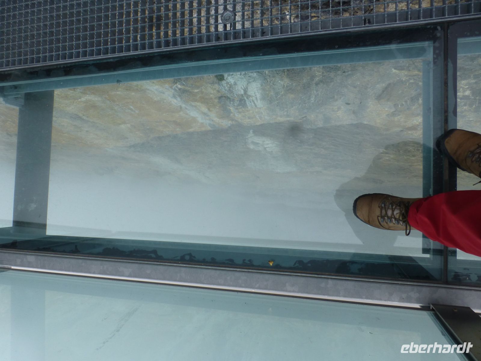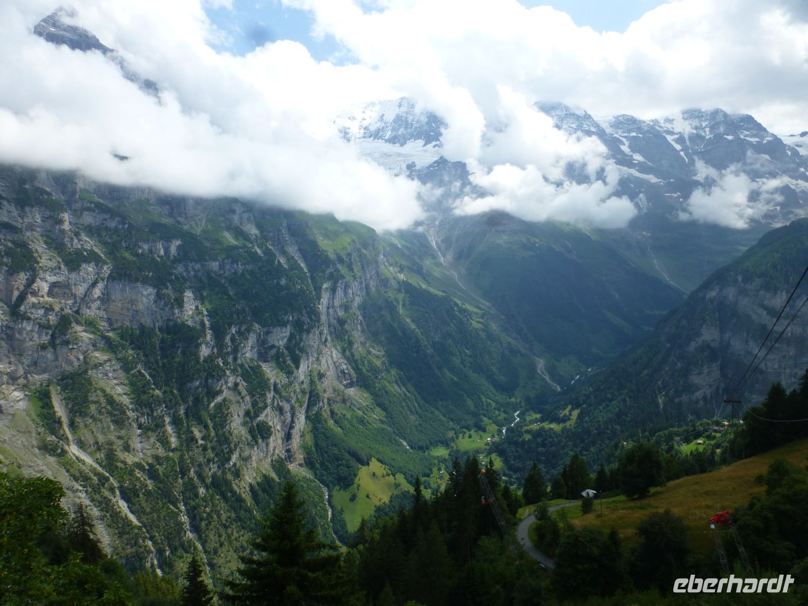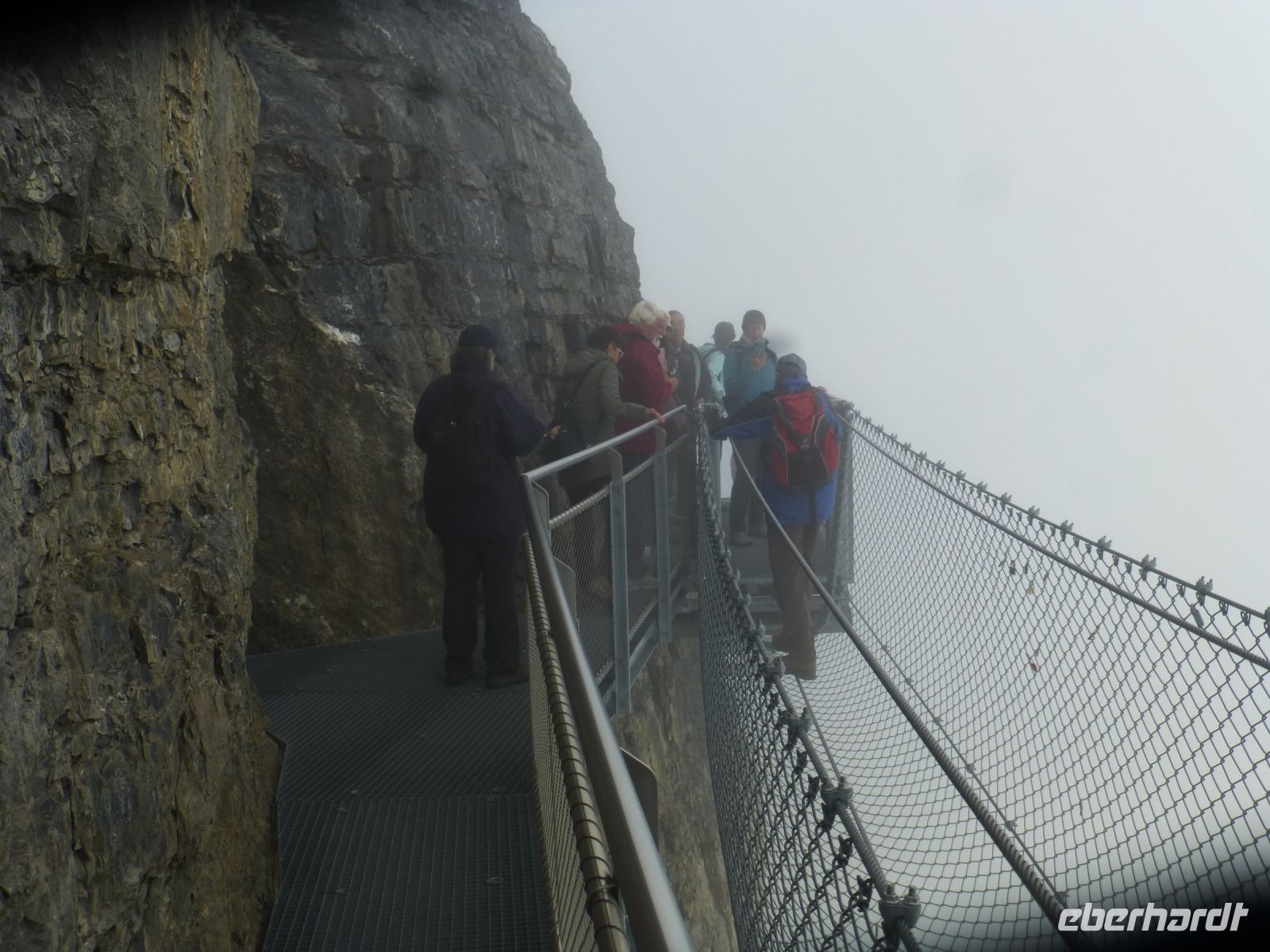 Heute erstürmen wir den letzten Gipfel – das Schilthorn. Wir fahren durch den hübschen Ort Lauterbrunnen und das dahinter liegende liebliche Tal, das nur einen Zugang hat, nach Stechelberg. Dort nehmen wir die Bahn über Gimmelwald und Mürren nach Birg. Es ist zwar hell, doch wir stehen in Wattewolken, so dass der Thrill Walk uns bei schönem Wetter ganz sicher sehr beeindruckt hätte.