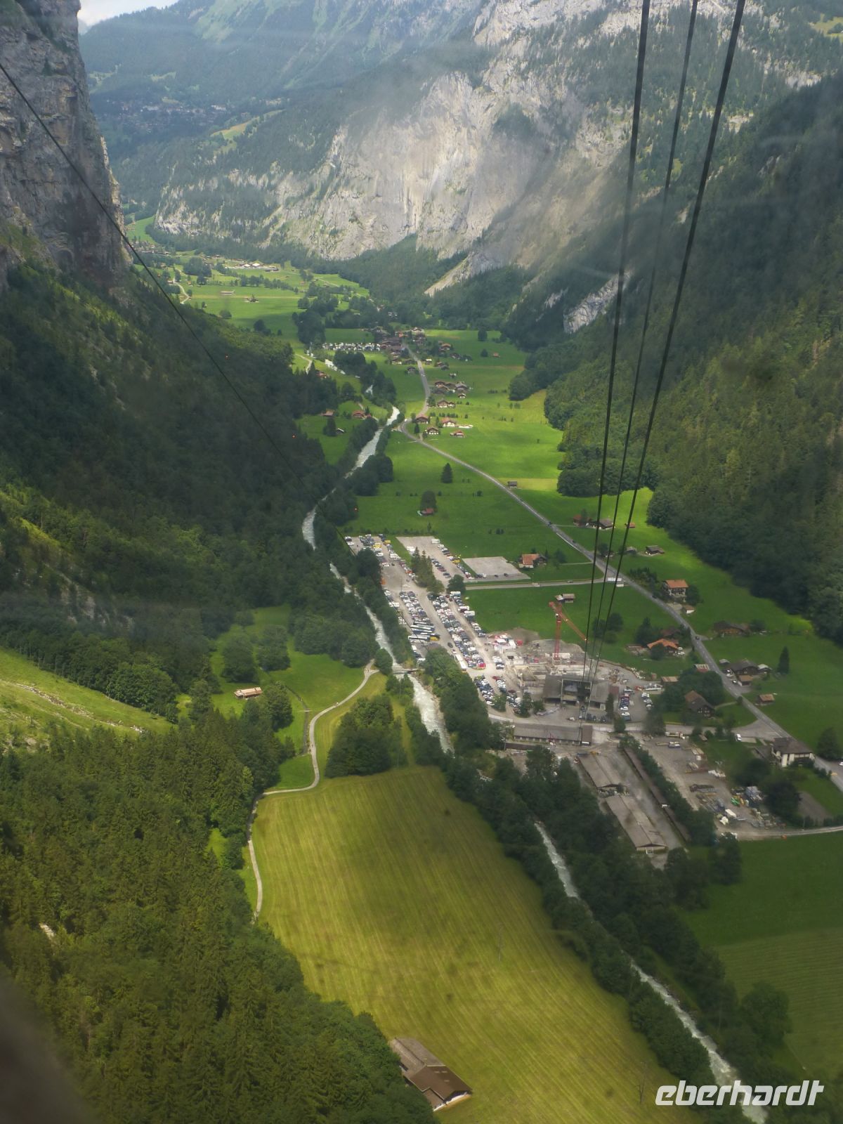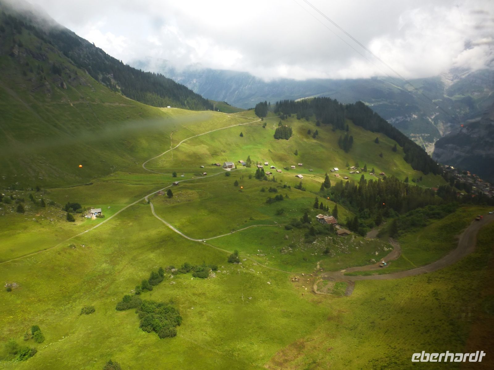 Wir trennen uns vom Berg und fahren über Eigergletscher mit der Gondelbahn nach Grindelwald. Die Gondel fasst unsere gesamte Gruppe – ein hübsches Erlebnis, über die Landschaft zu gondeln, die sich unter uns wie eine Modelleisenbahn ausnimmt.