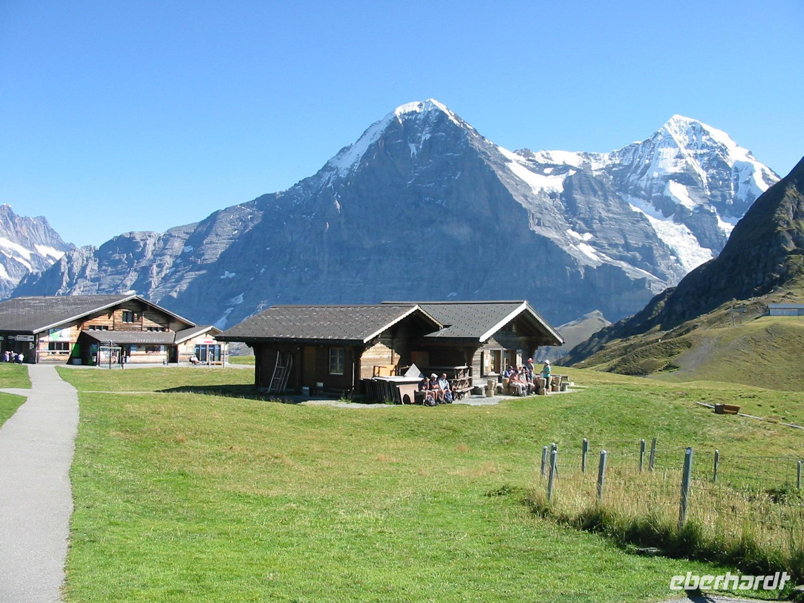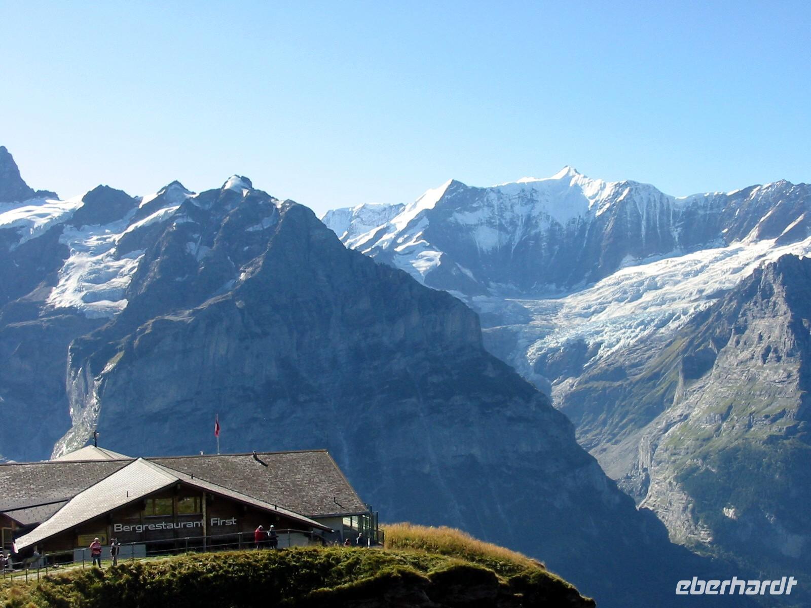 Von Grindelwald aus, kann man bequem hinauf zum First (2168 m) schweben. Mit einer Sechsergondelbahn, die über Bort und Schreckfeld zum First fährt, werden während der 25-minütigen Fahrt 5226 m Streckenlänge und 1100 Höhenmeter überwunden Oben angekommen schweifte unser Blick über ein atemberaubendes Bergpanorama mit einigen der berühmtesten Berge der Welt. Sieben Viertausender, vom Schreckhorn bis zu Eiger, Mönch und Jungfrau begeisterten uns alle. Der First ist zu Recht als einer der schönsten Aussichtspunkte Europas bekannt und ein beliebter Startort für Paraglider und Deltasegler.