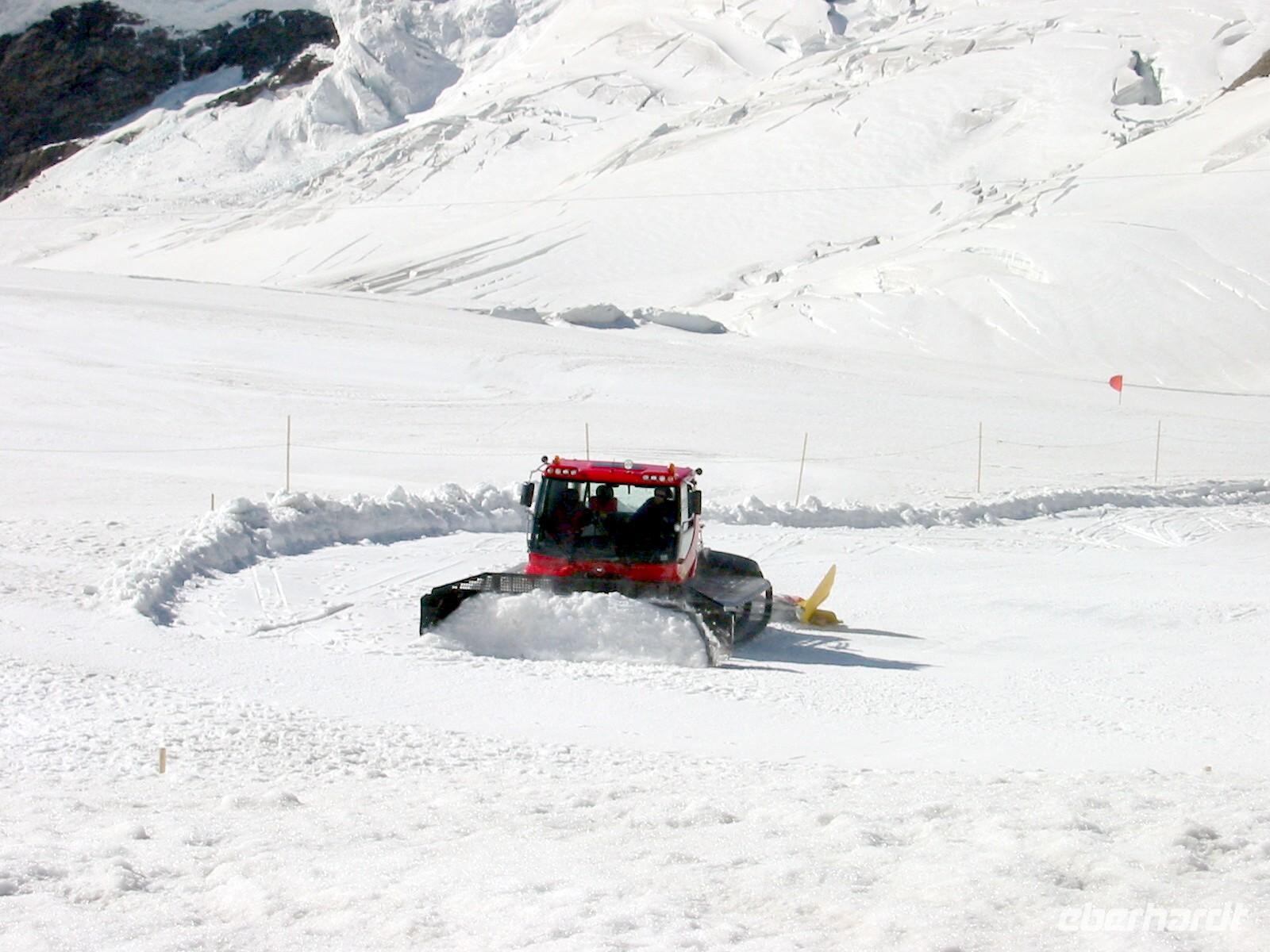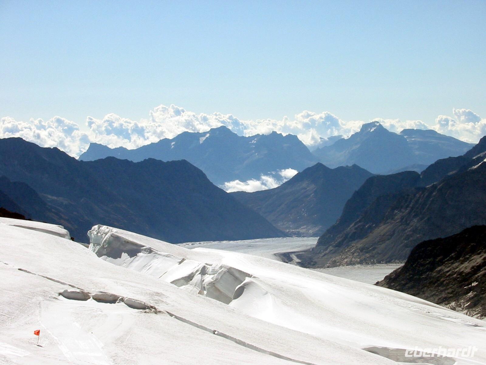 Im Eispalast befanden wir uns 20 Meter unter dem Aussichtsplateau, an der Wasserscheide Europas. Dort türmen sich die Eismassen, die langsam Richtung Norden wandern und deren Wasser einmal in die Nordsee fließen wird. Vor uns öffneten sich lange Gänge höhlenartig, weiten sich zu Räumen und Hallen. In Nischen tauchten die ersten Eisskulpturen auf, bläulich schimmert eine ewige Welt aus Eis. Wieder oben angekommen, wanderten wir noch zur Mönchsjochhütte und zurück.