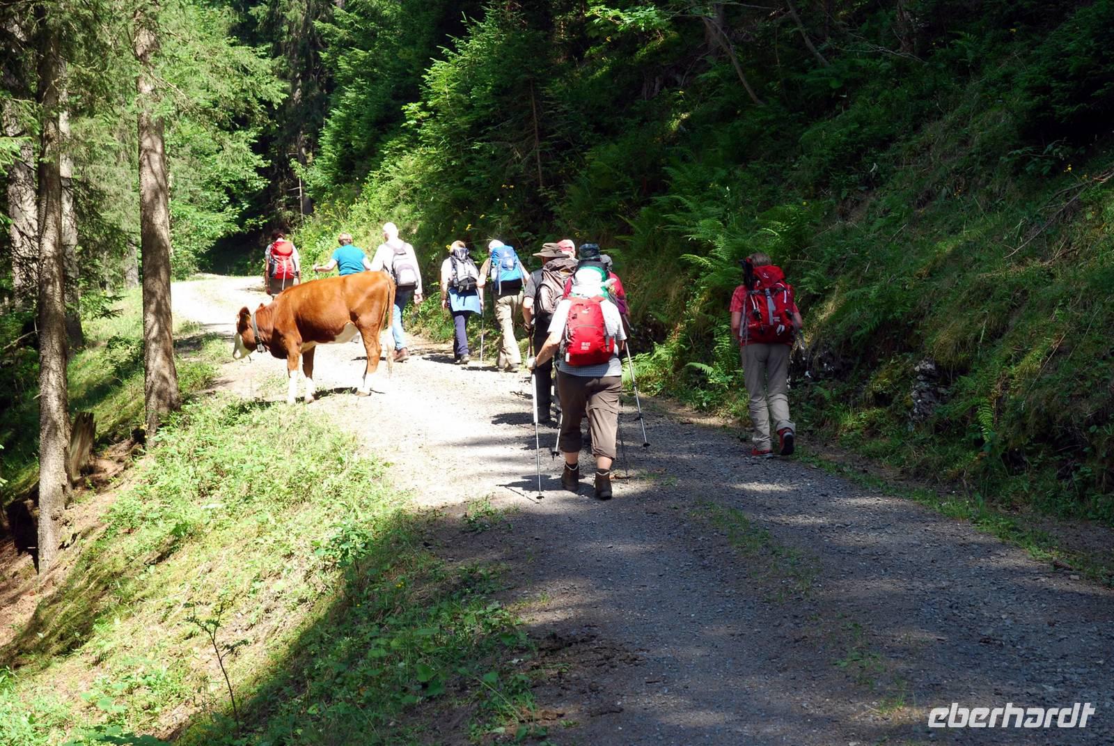 Der vierte Wandertag mit Doris war wieder ein Highlight. Nach einem frühen Start, 8 Uhr, fuhren wir mit der Seilbahn auf die Grütschalp. Hier begann unser Bergwanderweg mit herrlichen Ausblicken auf die Berge, Wengen und Lauterbrunnen. Ein Weg, der nicht vom Massentourismus berührt wurde. Nach ca. einer Stunde eröffnete sich dann der Blick ins Saustal mit seinem ganz eigenen Reiz. Unterwegs erzählte uns Doris viel über Ihre Heimat, über Pflanzen und auch die Seilbahn von Isenfluh nach Sulwald, die entweder 8 Personen oder eine Kuh befördern darf. Auch eine Sage hörten wir, die von einer Liebesgeschichte zweier junger Menschen handelt, die am Ende doch nicht zusammenkamen und sich an einem gegenüberliegenden Felsen abspielte.