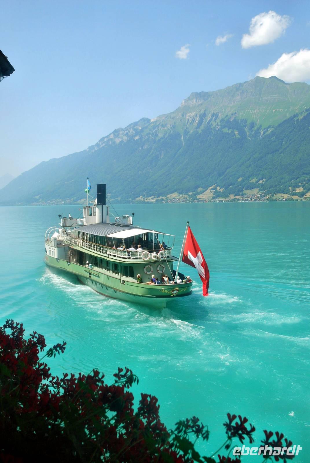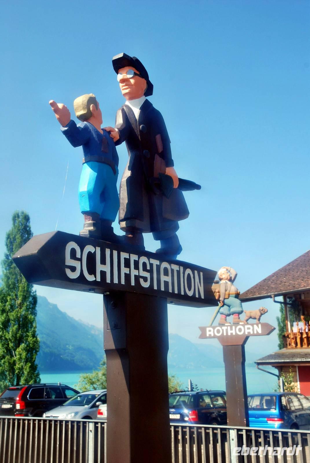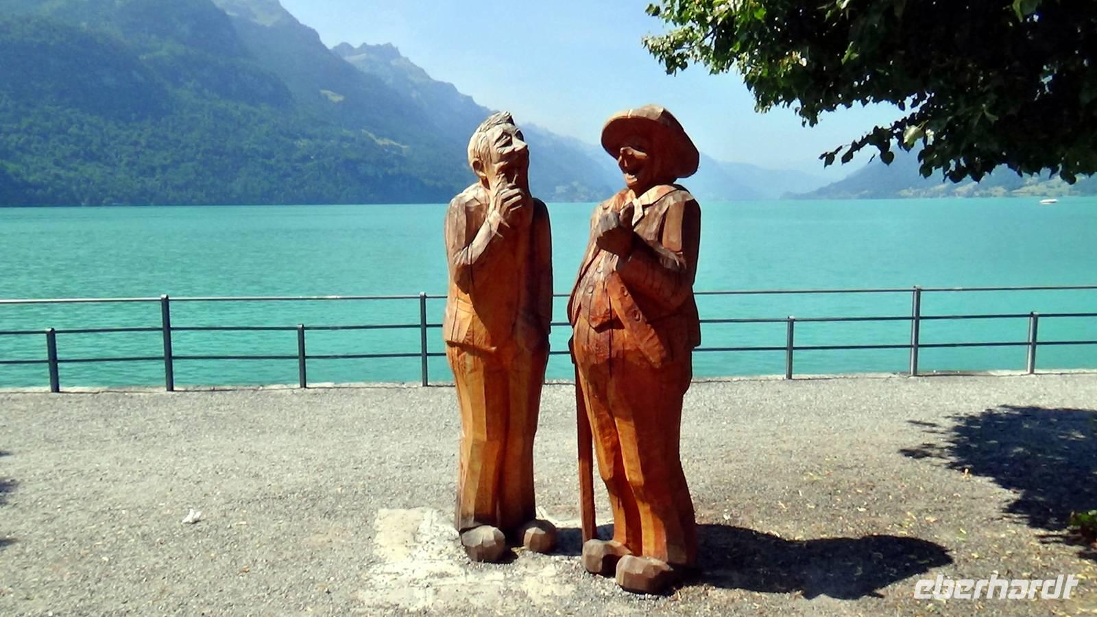 Gemeinsam mit der Rundreisegruppe, deren Ziel Luzern war, fuhren wir mit unserem Bus nach Brienz, dem Schnitzerdorf am Brienzer See. Nach dem Besuch des Holzbildhauerei-Museums besichtigten wir den alte Dorfteil von Brienz mit der legendären Brunngasse. Anschaulich erklärte uns Doris die Bauweise der alten Holzhäuser aus dem 18. Jahrhundert, an vielen Details wären wir sicherlich achtlos vorbei gegangen. Die Zeit bis zur Abfahrt des Dampfschiff "Lötschberg" verbrachten wir mit einem individuellen Dorfrundgang. Das Dampfschiff brachte uns quer über den türkisfarbenen Brienzer See nach Giessbach. Die Giessbachbahn, eine der ältesten Standseilbahnen Europas, brachte uns zum Hotel Giessbach. Das war nicht unser Ziel, sondern die naheliegenden Giessbachfälle. Ein imposanter Wasserfall, welcher sich in Kaskaden fast 500 Meter tief in den Brienzer See ergießt. Wir konnten der Zeit halber jedoch nur den Teil des Wasserfalls in Hotelnähe erkunden. Unser Weg führte uns weiter durch schattigen Wald entlang des Brienzer Sees in Richtung Iseltwald. Ein romantischer Uferweg, immer den türkisfarbenen See und das Brienzer Rothorn mit seiner Bergbahn im Blick, näherten wir uns Iseltwald. Vorher jedoch gab uns Doris eine weitere Kostprobe ihrer Vortagskunst mit der Geschichte der Sage um die „Iseltwalder Zwerge". Eine Ählichkeit mit unseren Heinzelmännchen war zu erkennen. Dann erreichten wir Iseltwald, um von dort mit dem Dampfschiff" Lötschberg" mit Halt in Ringgenberg und Börnigen nach Interlaken-Ost zu fahren. Eine herrliche Fahrt mit kühlenden Seewind. Die Schweizer Bahnen brachten uns wieder gut und pünktlich zurück nach Wengen.