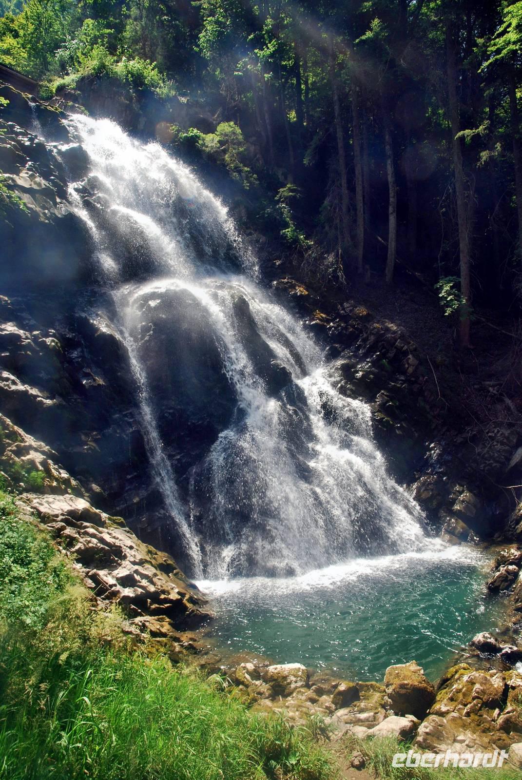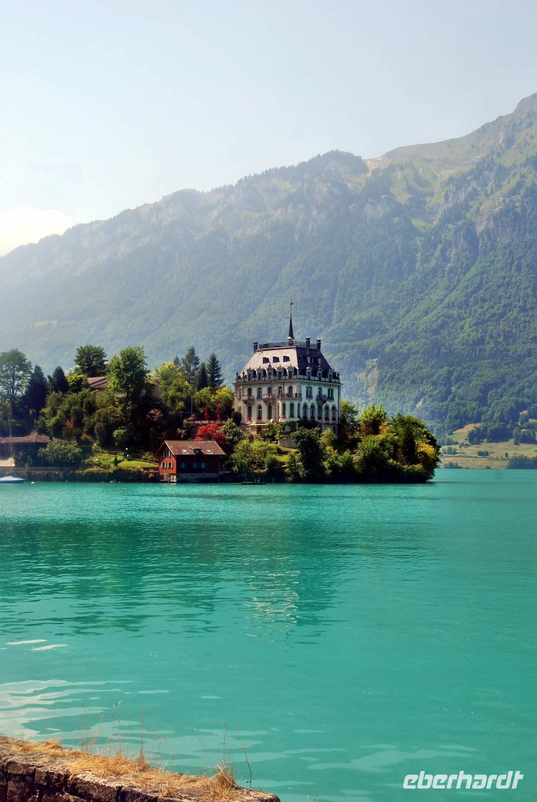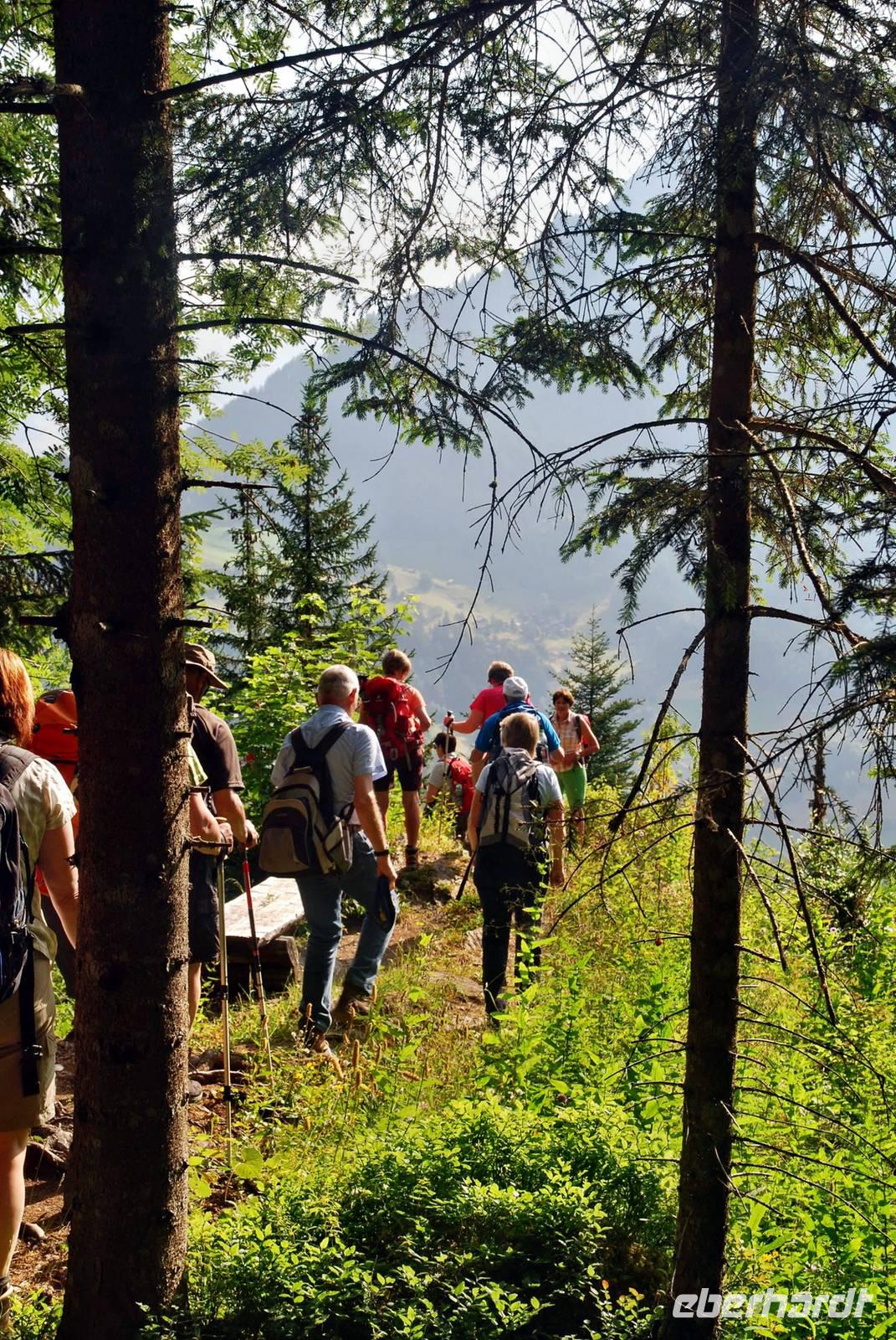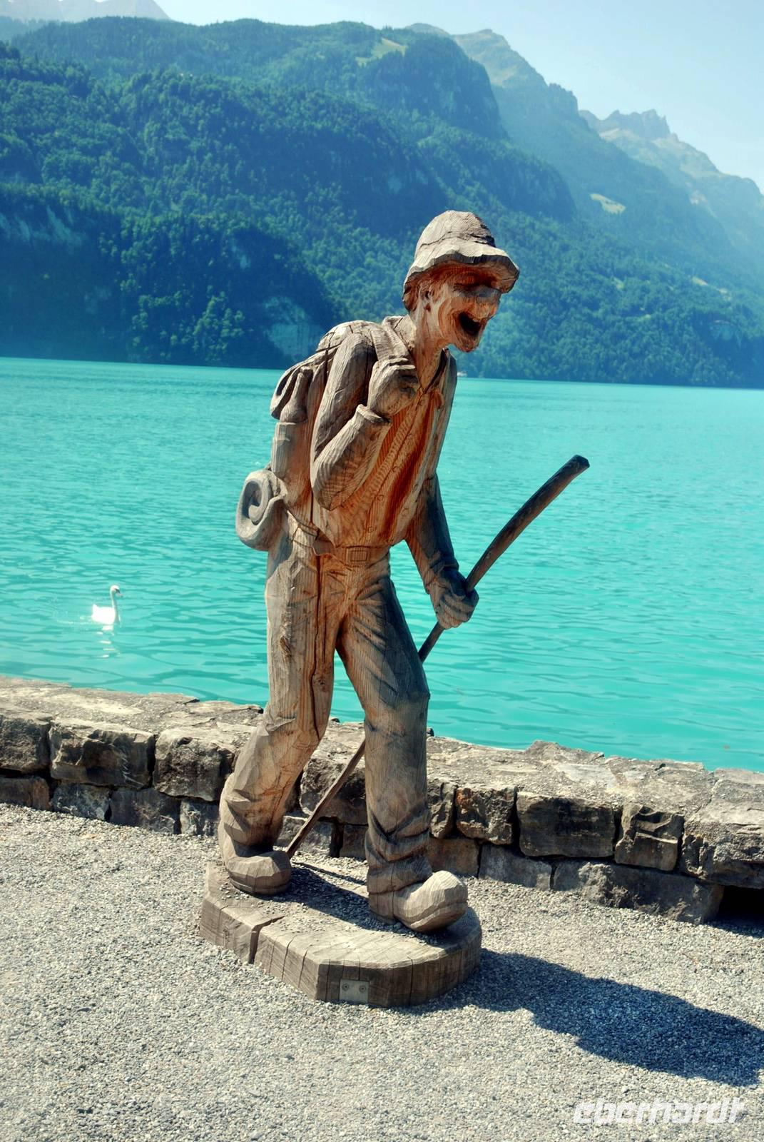 Gemeinsam mit der Rundreisegruppe, deren Ziel Luzern war, fuhren wir mit unserem Bus nach Brienz, dem Schnitzerdorf am Brienzer See. Nach dem Besuch des Holzbildhauerei-Museums besichtigten wir den alte Dorfteil von Brienz mit der legendären Brunngasse. Anschaulich erklärte uns Doris die Bauweise der alten Holzhäuser aus dem 18. Jahrhundert, an vielen Details wären wir sicherlich achtlos vorbei gegangen. Die Zeit bis zur Abfahrt des Dampfschiff "Lötschberg" verbrachten wir mit einem individuellen Dorfrundgang. Das Dampfschiff brachte uns quer über den türkisfarbenen Brienzer See nach Giessbach. Die Giessbachbahn, eine der ältesten Standseilbahnen Europas, brachte uns zum Hotel Giessbach. Das war nicht unser Ziel, sondern die naheliegenden Giessbachfälle. Ein imposanter Wasserfall, welcher sich in Kaskaden fast 500 Meter tief in den Brienzer See ergießt. Wir konnten der Zeit halber jedoch nur den Teil des Wasserfalls in Hotelnähe erkunden. Unser Weg führte uns weiter durch schattigen Wald entlang des Brienzer Sees in Richtung Iseltwald. Ein romantischer Uferweg, immer den türkisfarbenen See und das Brienzer Rothorn mit seiner Bergbahn im Blick, näherten wir uns Iseltwald. Vorher jedoch gab uns Doris eine weitere Kostprobe ihrer Vortagskunst mit der Geschichte der Sage um die „Iseltwalder Zwerge". Eine Ählichkeit mit unseren Heinzelmännchen war zu erkennen. Dann erreichten wir Iseltwald, um von dort mit dem Dampfschiff" Lötschberg" mit Halt in Ringgenberg und Börnigen nach Interlaken-Ost zu fahren. Eine herrliche Fahrt mit kühlenden Seewind. Die Schweizer Bahnen brachten uns wieder gut und pünktlich zurück nach Wengen.