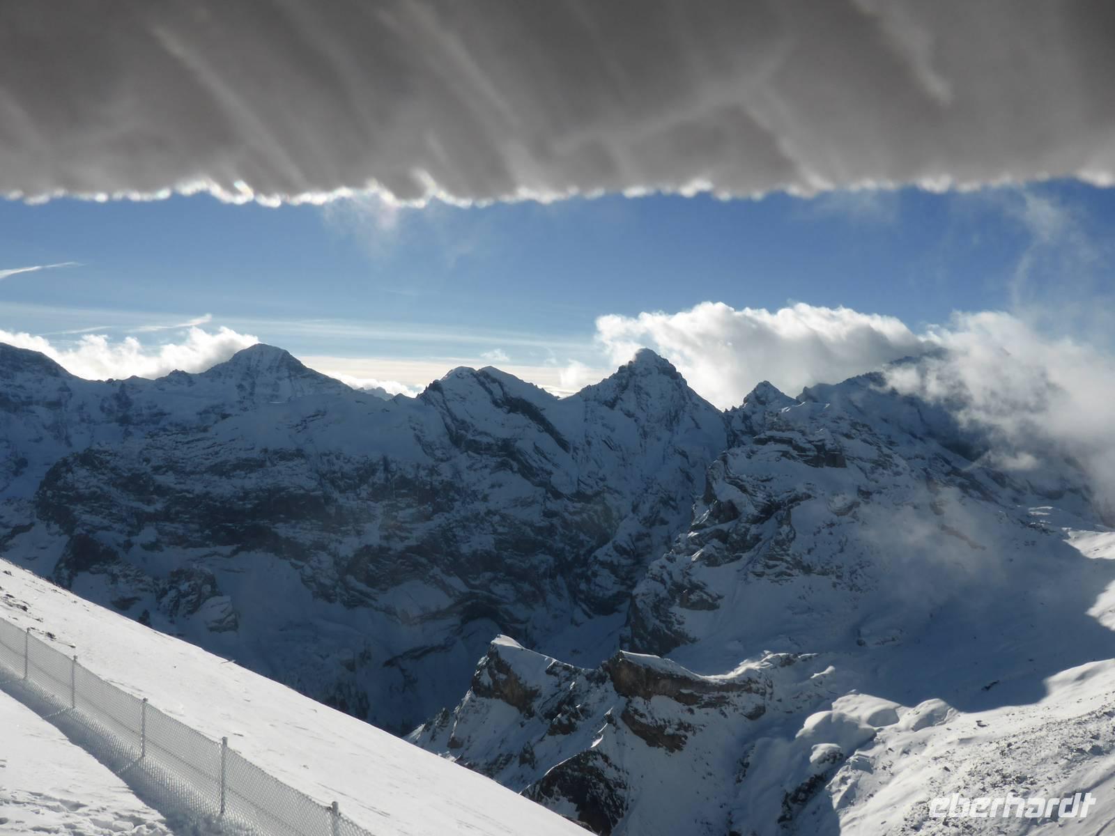Nach der recht guten Wetterprognose für das Schilthorn starteten wir in das Tal der Lütschine nach Stechelberg. Die Wolken verzogen sich immer mehr, sodass wir uns auf die Auffahrt freuten. An der Kasse kam die große Ernüchterung - oben war keine Sicht. Aber es sollte gegen 11:00 Uhr aufziehen. Also wagten wir die Auffahrt. Vier Seilbahnen brachten uns auf 2970 m Höhe. Anfangs sahen wir noch gar nichts, doch dann zog es wirklich immer mehr auf bis wir eine schöne Sicht auf das Dreigestirn sowie die umliegenden Berge hatten.Den Beinamen Piz Gloria erhielt das Schilthorn während der Dreharbeiten zum James Bond Film „Im Geheimdienst Ihrer Majestät". In der 007-Ausstellung informierten wir uns über die Dreharbeiten und im Drehrestaurant ließen wir das Panorama an uns vorbei ziehen.