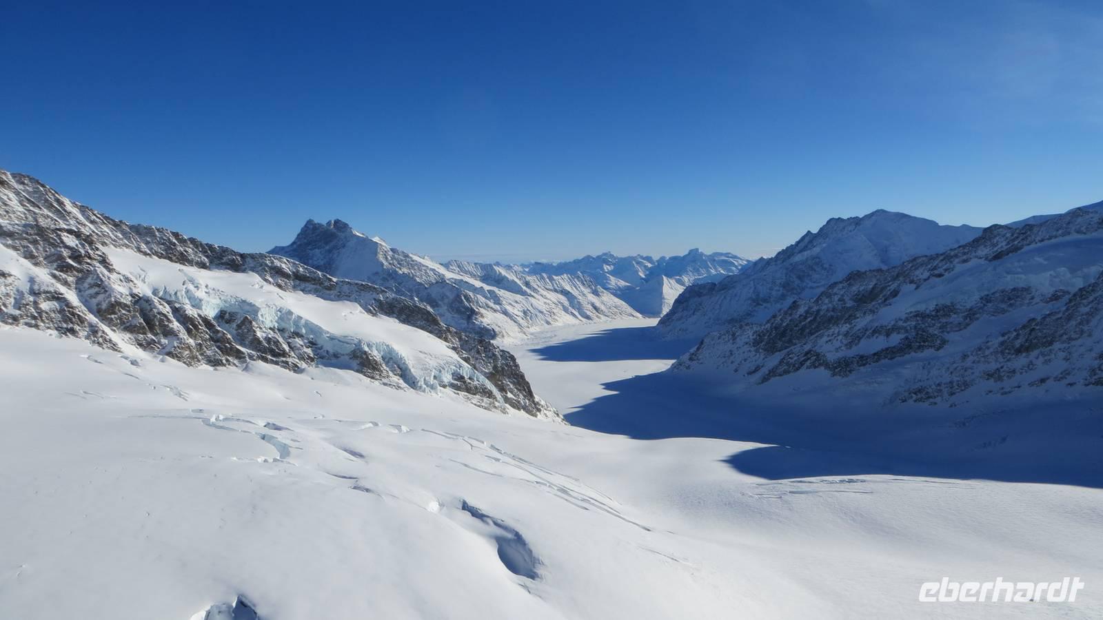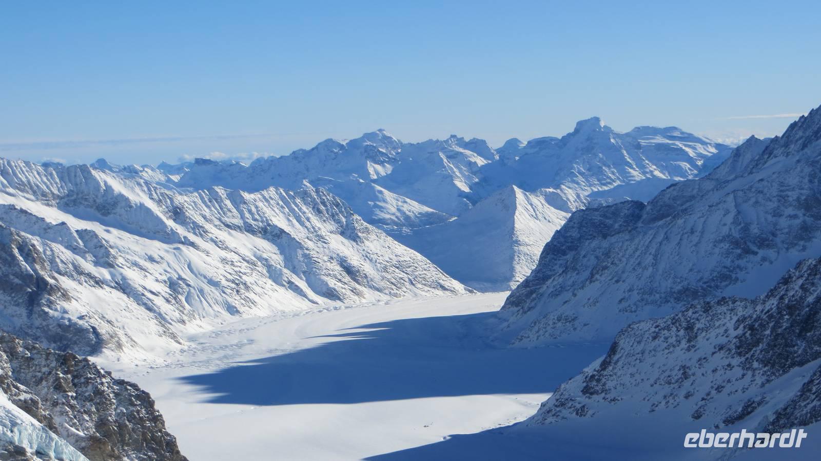 Am Morgen begrüßte uns in Interlaken bei strahlendem Sonnenschein und glasklarer Sicht. Also beschlossen wir bereits heute auf das Jungfraujoch zu fahren. Nach einigen Telefonaten konnten wir unseren Ausflug beginnen. Wir fuhren zunächst mit dem Bus nach Lauterbrunnen. Mit der Jungfraubahn fuhren wir auf die Kleine Scheidegg. Dabei boten sich uns schon jetzt schöne Ausblicke zum Schilthorn, zum Lauberhorn und zum Silberhorn. Auf der Kleinen Scheidegg stiegen wir in den Zug Richtung Jungfraujoch. Nun ging es durch den Eiger hinauf. Unterwegs legte der Zug einen Stopp in der Eigerwand und am Eismeer ein. Im Felsen sind große Fester eingebaut, durch die wir einen Blick in die Eiger-Nordwand, zur Kleinen Scheidegg und in den Gletscherabbruch des Eismeeres wagen konnten. Auf dem Jungfraujoch in 3.454 Metern Höhe angekommen, eröffnete sich uns ein fantastisches Bild. Die Jungfrau, der Mönch und die anderen Berge bis ins Wallis zeigten sich in ihrer vollen Pracht. Wir genossen die Aussicht von der Sphinx in 3.571 Metern Höhe auf den Aletschgletscher. Dieser ist mit 23 Kilometern der längste Gletscher der Alpen. Wir besuchten das Plateu, von dem wir einen schönen Blick in die Ferne bis zum Schwarzwald und ins Wallis hatten. Im Eispalast fühlten wir den Gletscher hautnah und sahen die schönen Eisplastiken. In der Alpinen Sensation konnten wir die Geschichte des Baues der Jungfraubahn erleben. Mit einzigartigen Eindrücken fuhren wir wieder mit Zug zurück nach Grindelwald-Grund. Am Bus erwartete uns Günther, unser Chauffeur, bereits mit einem Becher Glühwein. Anschließend ging es wieder nach Interlaken zurück. Wir waren uns einig: Wir durften einen perfekten Tag erleben.