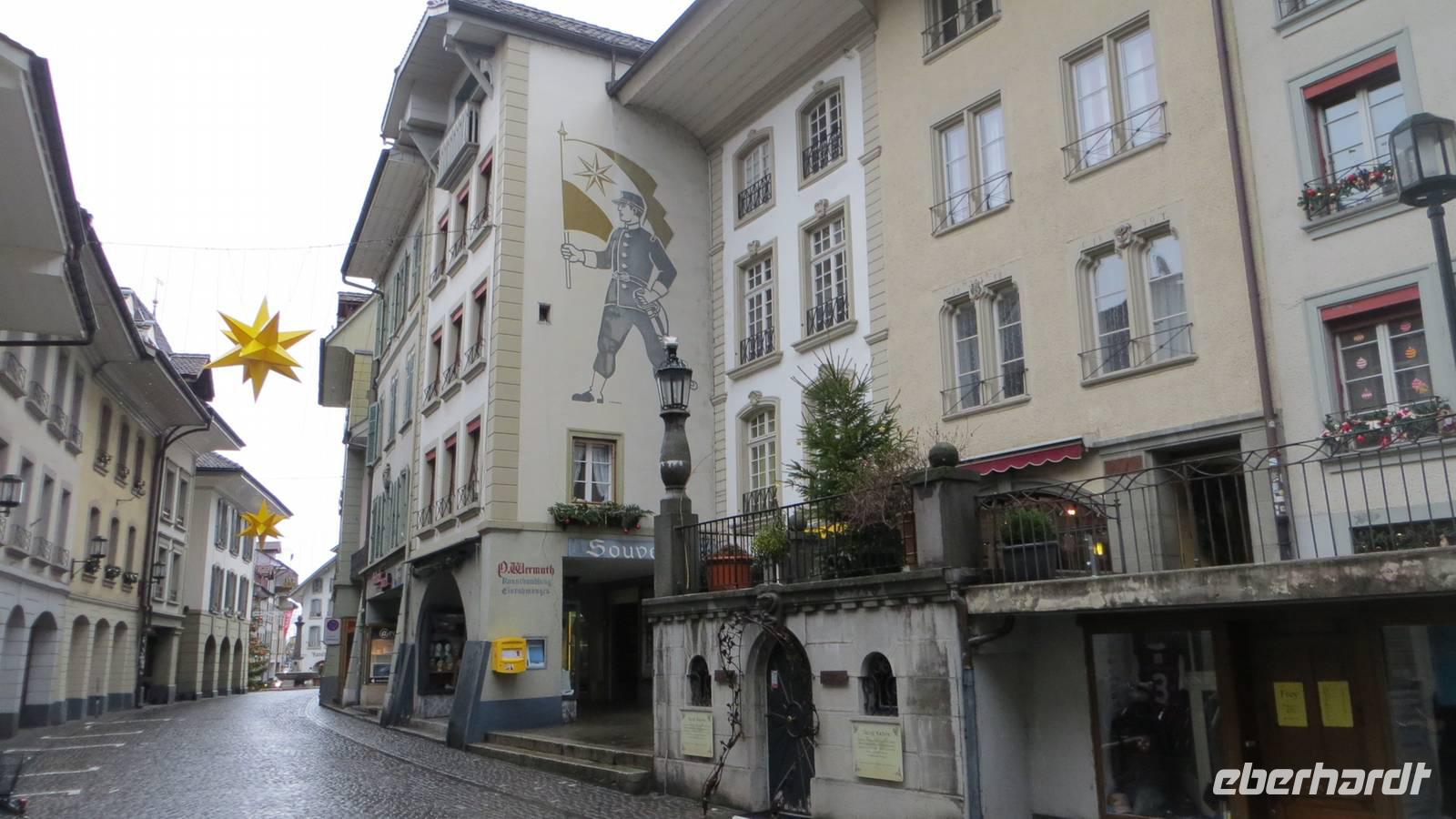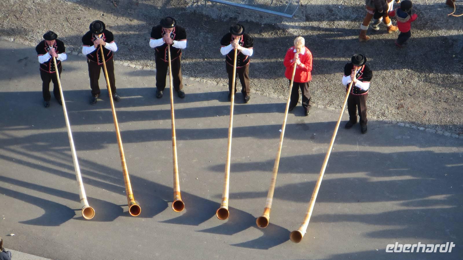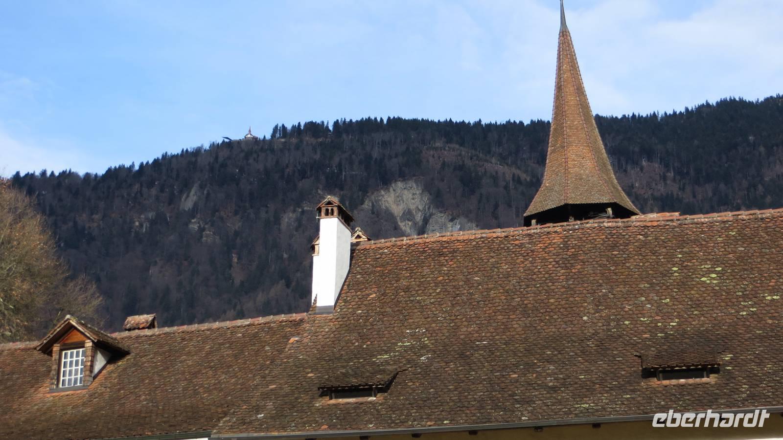 Nach dem Frühstück fuhren nach Thun. Leider regnete es sehr stark. Am Bahnhof in Thun erwarteten unsere Stadtführerinnen. Sie vermittelten uns sehr anschaulich die Geschichte der alten Zähringerstadt. Wir spazierten in zwei Gruppen durch die schöne Altstadt. Wir sahen die Hauptgasse mit den Laubengängen, den Rathausplatz mit den majestätischen Bürgerhäusern. Eine Gruppe stieg zum Schloss hinauf und besuchte die Stadtkirche. Am Mühlenplatz erfuhren wir die Geschichte der alten Mühlen. Nun waren wir ordentlich durchgefroren, denn der Regen hatte zwar aufgehört aber inzwischen blies ein ganz kalter Wind. Günther erwartete uns bereits mit Glühwein am Bus. Entlang des Nordufers des Thuner Sees kehrten wir nach Interlaken zurück. Am Nachmittag fand in Interlaken ein besonderes Spektakel statt: die Harder-Potschete. Dieser alte Brauch geht zum einen auf die Sage vom Hadermannl zurück. Demnach soll ein Mönch aus dem Kloster Interlaken einem jungen Mädchen, welches auf dem Hader Holz sammelte, nachgestellt sein. In ihrer Not sprang das Mädchen in die Tiefe. Zur Strafe wurde der Mönch zu Stein und muss nun für immer auf den Ort seiner Schandtat hinabschauen. In der Felswand am Hader kann man das Gesicht des Hadermännli erkennen. Diese Sage und heidnische Bräuche zum Neuen Jahr bildeten die Grundlage für die heutige Harder-Potschete. Mit kunstvoll geschnitzten Masken und Kostümen aus Fellen und Naturmaterialien zog das Hardermännli mit seinem Wybl begleitet von Kindern mit selbst gebastelten Masken und Kostümen durch Interlaken. Trychler-Gruppen und Gugge-Musi begleiteten den Zug. Auf dem Marktplatz wurden die Gruppen nochmal präsentiert. Wir konnten Brauchtum und die Begeisterung dafür hautnah erleben. Am späten Nachmittag unternahmen wir entlang der Ache einen gemütlichen Fackelspaziergang. Ganz romantisch tauchten die Berge und der Ort ins Dämmerlicht bis es endgültig dunkel wurde. Im Hotel wärmten wir uns bei Glühwein und Punsch auf, bevor uns wieder ein ausgezeichnetes Abendessen gereicht wurde.