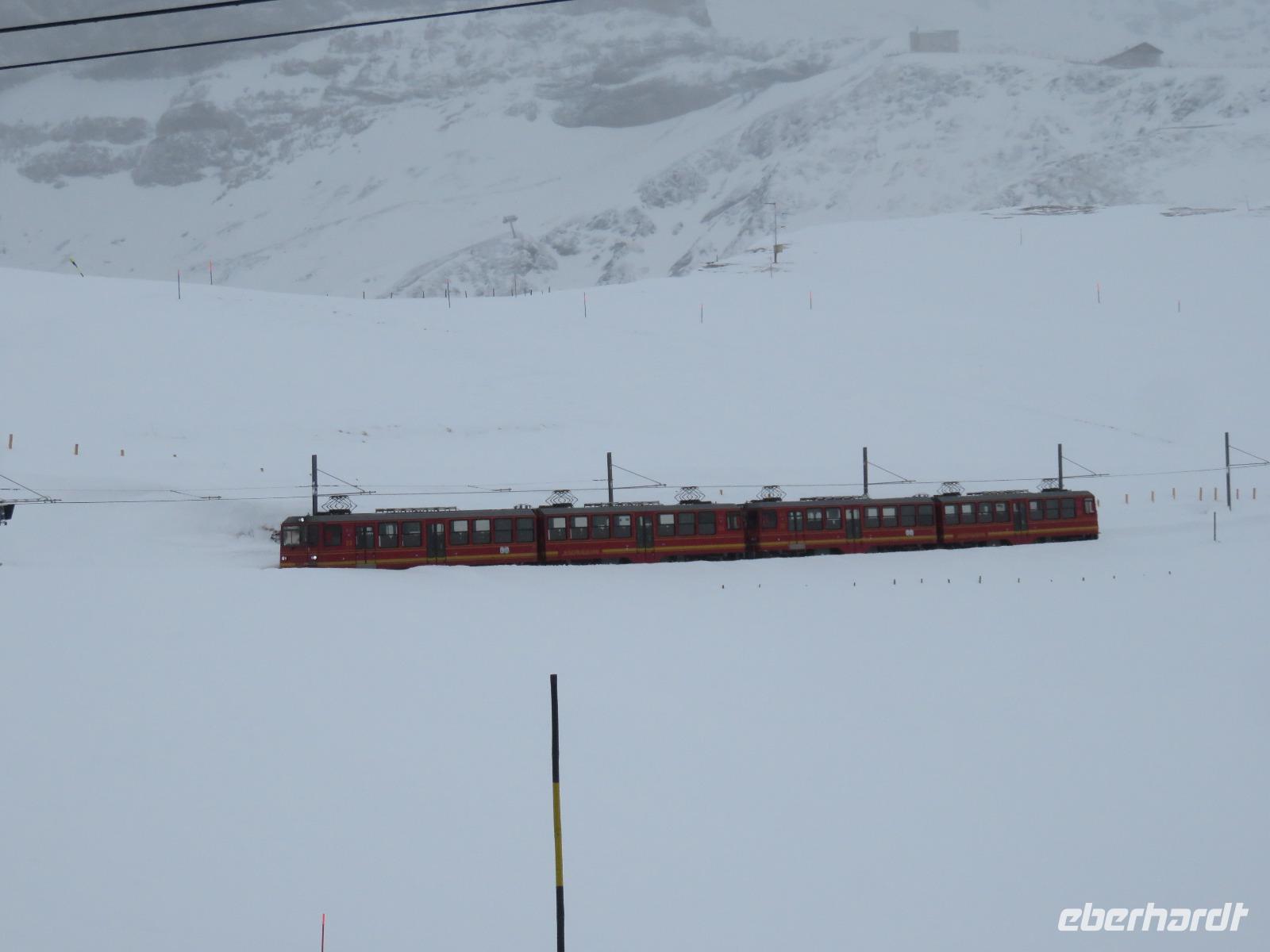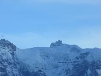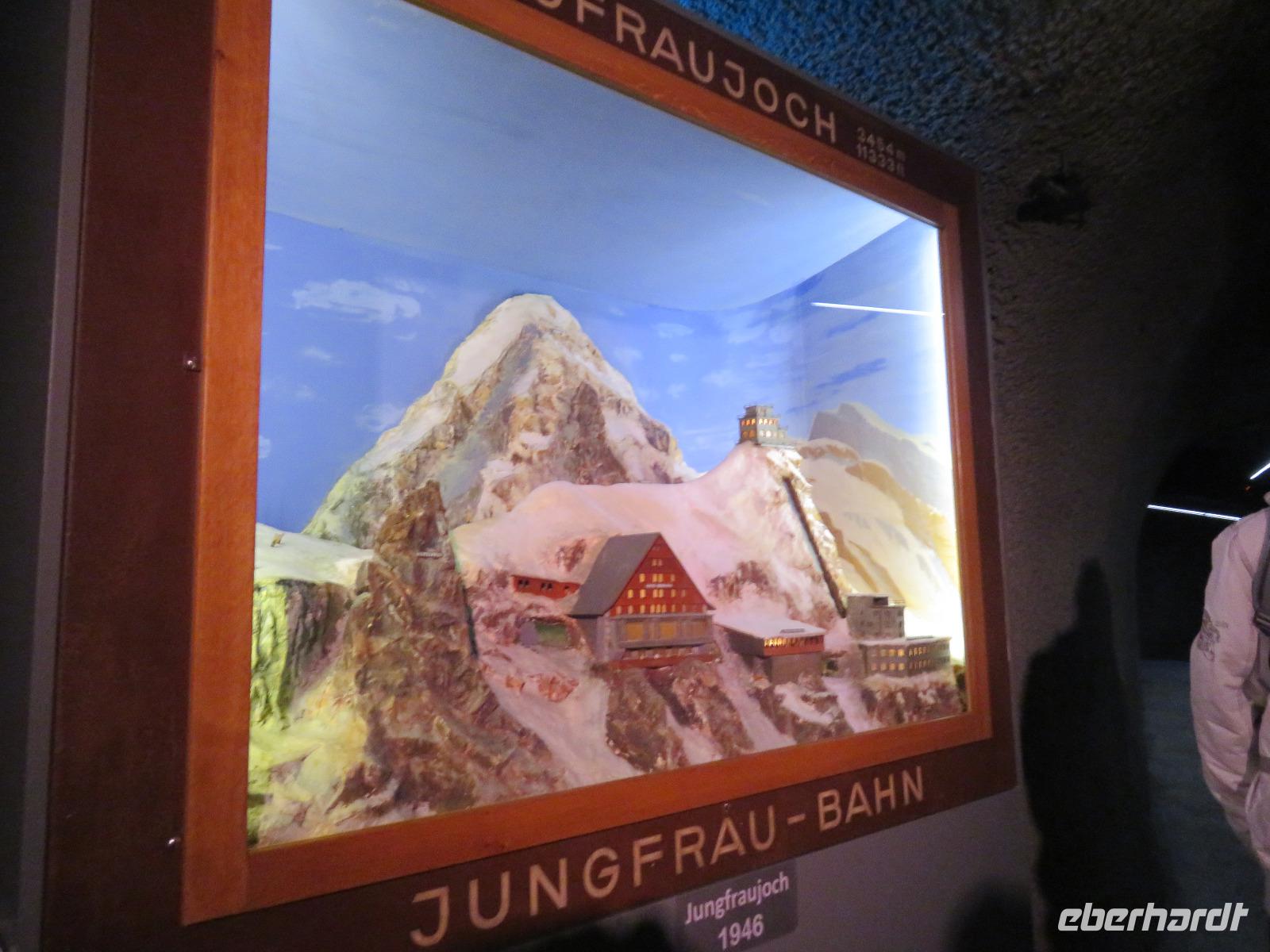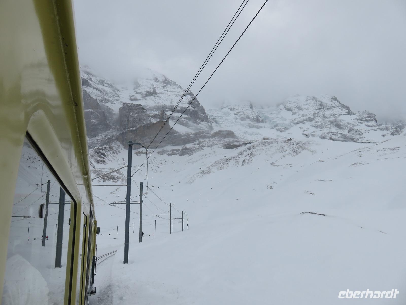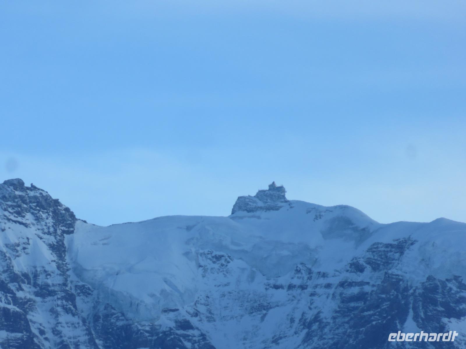 Nach dem Frühstück beginnen wir unseren Ausflug auf das Jungfraujoch. Wir fahren zunächst mit dem Bus nach Lauterbrunnen. Mit der Wengeralp-Bahn reisen wir durch ein wirkliches Winterwunderland auf die Kleine Scheidegg. Dabei bieten sich uns immer wieder schöne Blicke in die tief verschneite Landschaft. Leider sind die Berge jedoch in dicken Wolken versteckt. Auf der Kleinen Scheidegg war viel Schnee gefallen und wir müssen zunächst warten, bis die Bahn für uns zum Jungfraujoch für uns abfahren kann. Wir besteigen die Bahn Richtung Jungfraujoch mit etwas Verspätung. Nun geht es durch den Eiger hinauf in den ewigen Schnee. Unterwegs legt die Bahn einen Stopp am Eismeer ein. Im Felsen sind große Fenster eingebaut. Leider versperrt Schneetreiben und Nebel den Blick auf den Gletscherabbruch des Eismeeres. Auf dem Jungfraujoch in 3.454 Metern Höhe angekommen, bleibt uns leider die Sicht auf Jungrfau, Mönch und die anderen Berge bis ins Wallis versagt. Auf der Aussichtsplattform der Sphinx in 3.571 Metern Höhe lassen wir uns kurz den Wind um die Nase blasen. In der Alpinen Sensation können wir die Geschichte des Baues der Jungfraubahn von der Idee durch Adolf Geyer-Zeller bis zur Fertigstellung 1912 erleben. Wir setzen unseren Rundgang im Eispalast fort. Hier fühlen wir den Gletscher hautnah und sehen die schönen Eisplastiken. Dabei können wir eine faszinierende Entdeckung machen: im klaren Eis sehen wir eine Schicht Sägespäne. Diese wurden im Sommer 1947 als Schutz vor der starken Sonneneinstrahlung und Hitze auf den Gletscher aufgebracht. Jetzt können wir diese Schicht 40 Meter unter der Gletscheroberfläche im Eispalast wieder sehen. Mit einzigartigen Eindrücken fahren wir mit Zug zurück auf die Kleine Scheidegg und nach Grindelwald-Grund. Am Bus erwartet uns Maik, unser Chauffeur, bereits mit einem Becher Glühwein. Anschließend kehren wir nach Interlaken zurück.