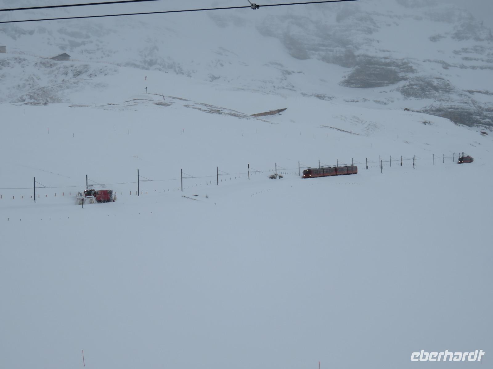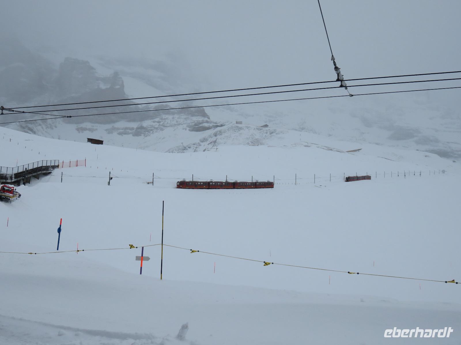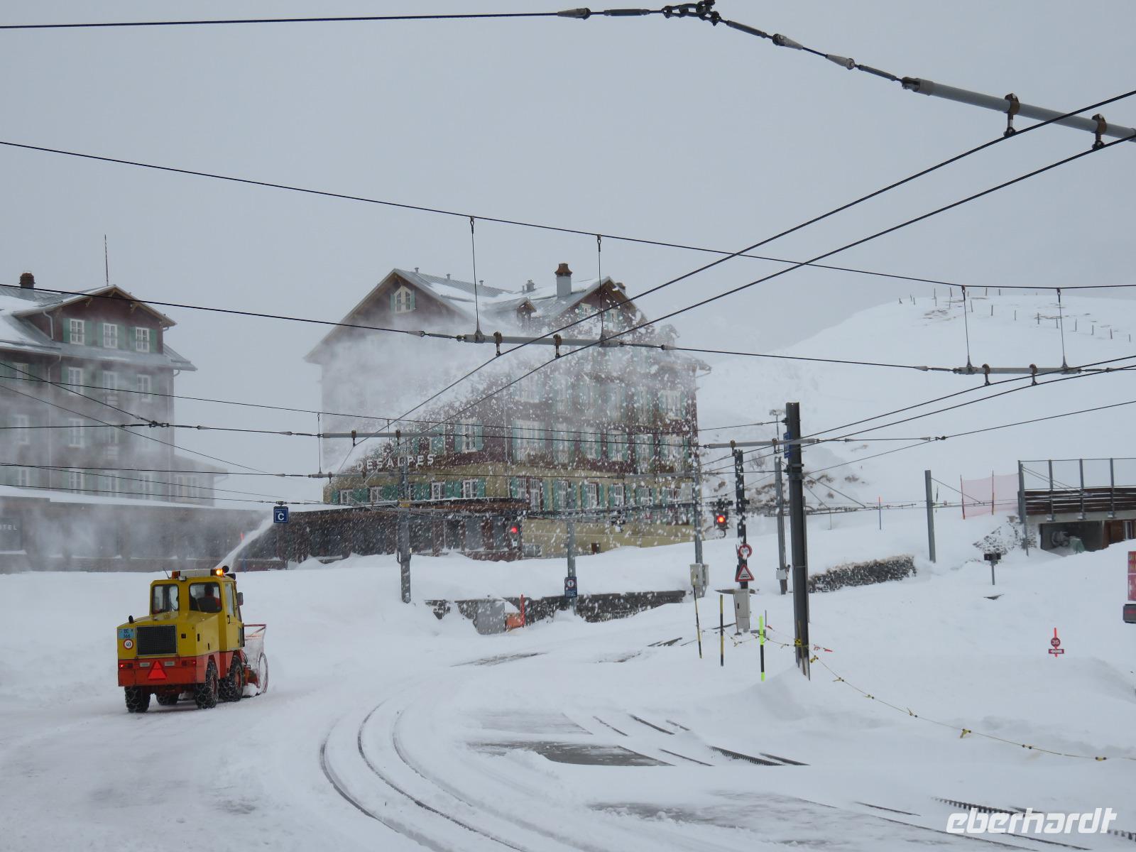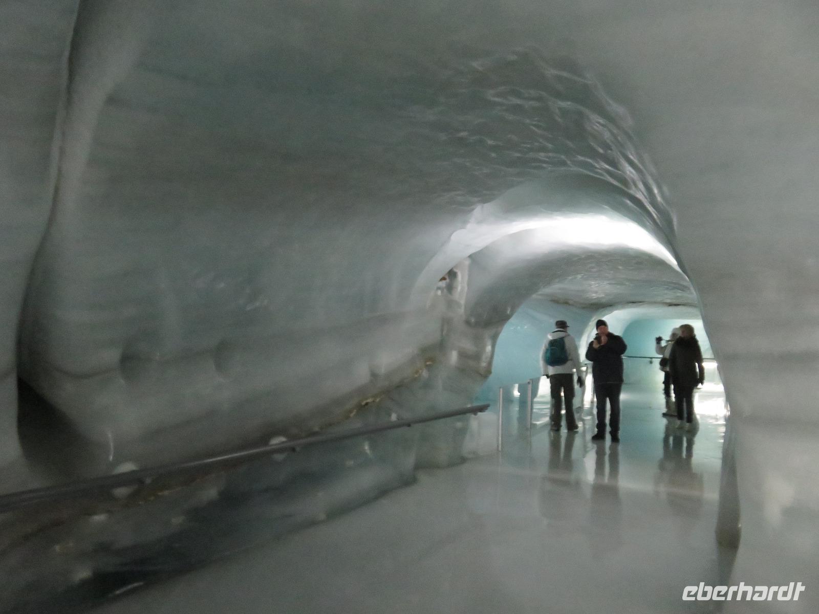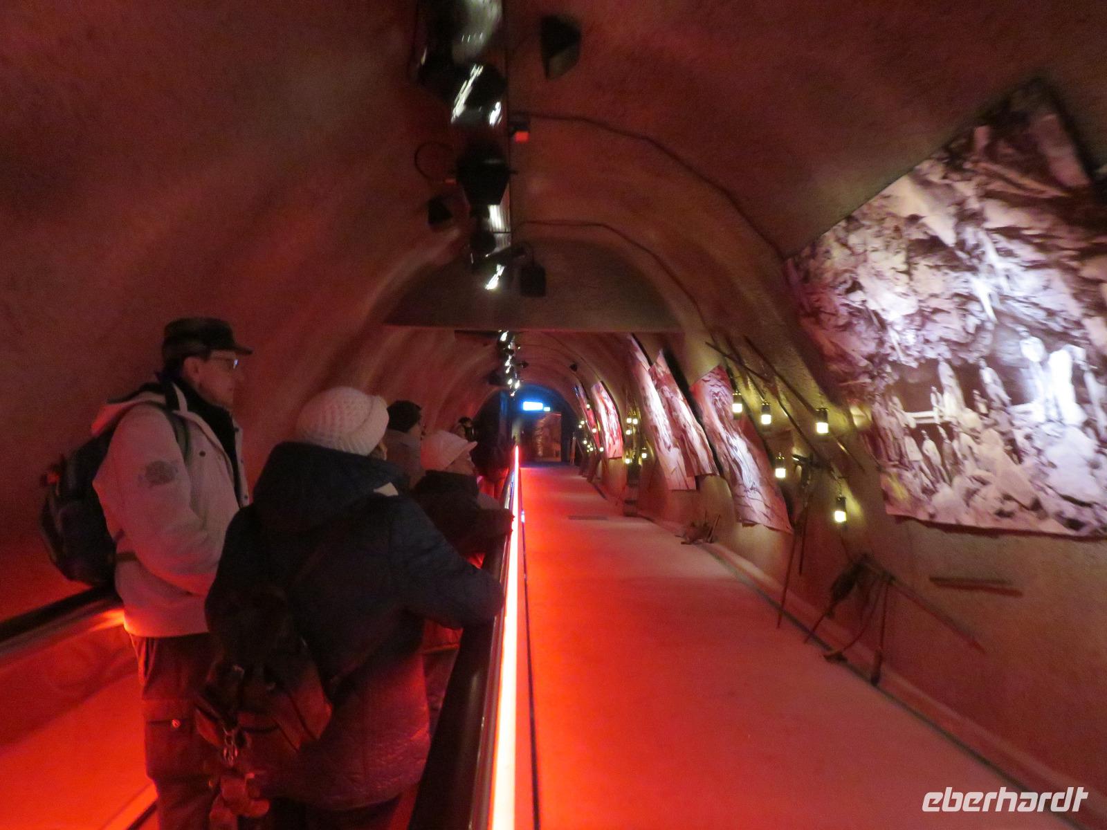 Nach dem Frühstück beginnen wir unseren Ausflug auf das Jungfraujoch. Wir fahren zunächst mit dem Bus nach Lauterbrunnen. Mit der Wengeralp-Bahn reisen wir durch ein wirkliches Winterwunderland auf die Kleine Scheidegg. Dabei bieten sich uns immer wieder schöne Blicke in die tief verschneite Landschaft. Leider sind die Berge jedoch in dicken Wolken versteckt. Auf der Kleinen Scheidegg war viel Schnee gefallen und wir müssen zunächst warten, bis die Bahn für uns zum Jungfraujoch für uns abfahren kann. Wir besteigen die Bahn Richtung Jungfraujoch mit etwas Verspätung. Nun geht es durch den Eiger hinauf in den ewigen Schnee. Unterwegs legt die Bahn einen Stopp am Eismeer ein. Im Felsen sind große Fenster eingebaut. Leider versperrt Schneetreiben und Nebel den Blick auf den Gletscherabbruch des Eismeeres. Auf dem Jungfraujoch in 3.454 Metern Höhe angekommen, bleibt uns leider die Sicht auf Jungrfau, Mönch und die anderen Berge bis ins Wallis versagt. Auf der Aussichtsplattform der Sphinx in 3.571 Metern Höhe lassen wir uns kurz den Wind um die Nase blasen. In der Alpinen Sensation können wir die Geschichte des Baues der Jungfraubahn von der Idee durch Adolf Geyer-Zeller bis zur Fertigstellung 1912 erleben. Wir setzen unseren Rundgang im Eispalast fort. Hier fühlen wir den Gletscher hautnah und sehen die schönen Eisplastiken. Dabei können wir eine faszinierende Entdeckung machen: im klaren Eis sehen wir eine Schicht Sägespäne. Diese wurden im Sommer 1947 als Schutz vor der starken Sonneneinstrahlung und Hitze auf den Gletscher aufgebracht. Jetzt können wir diese Schicht 40 Meter unter der Gletscheroberfläche im Eispalast wieder sehen. Mit einzigartigen Eindrücken fahren wir mit Zug zurück auf die Kleine Scheidegg und nach Grindelwald-Grund. Am Bus erwartet uns Maik, unser Chauffeur, bereits mit einem Becher Glühwein. Anschließend kehren wir nach Interlaken zurück.