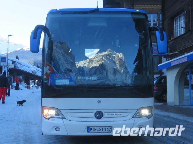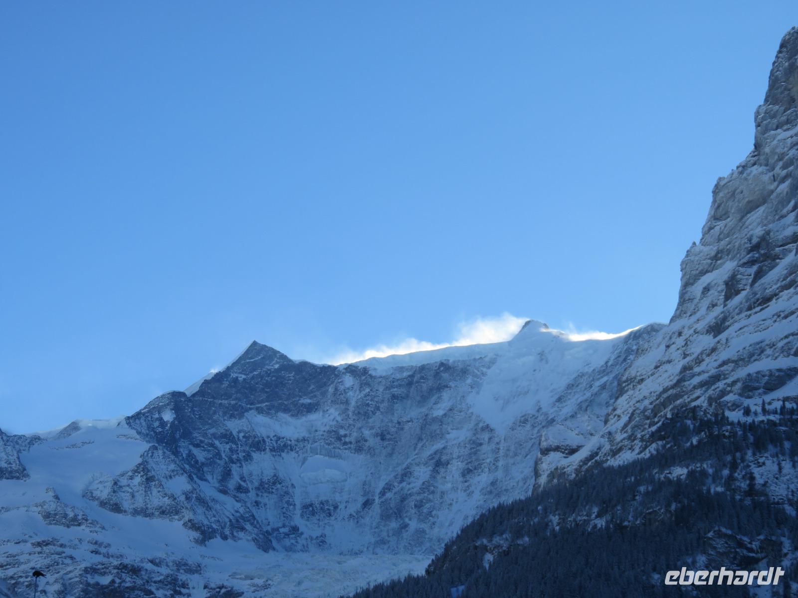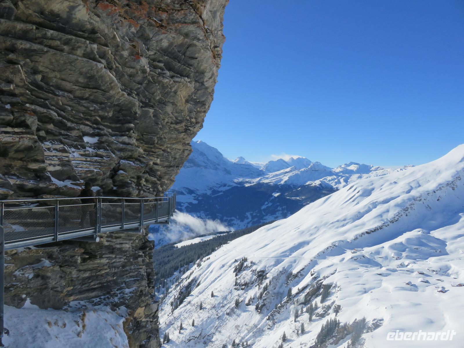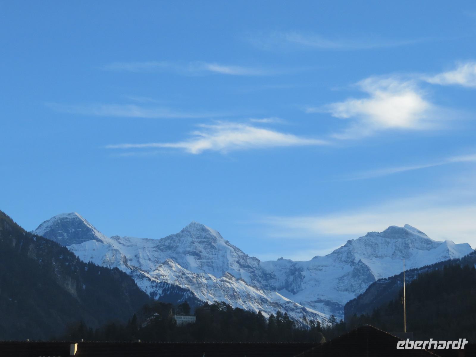 Nach dem Frühstück fahren wieder bei Traumwetter nach Grindelwald. Die Gondelbahn bringt uns auf den First in 2.168 Metern Höhe. Während der 25minütigen Bahnfahrt genießen wir die herrliche, dick verschneite Winterlandschaft genießen. Sogar Gämsen können wir entdecken. Auf dem First angekommen bietet sich uns ein schönes Panorama der Berner Alpen. Wir sehen den Eiger mit seiner imposanten Nordwand, die Jungfrau, das Schreckhorn, das Wetterhorn und viele weitere der einmaligen Berge. Wir begeben uns auf den Cliff Walk. Dieser führt direkt über dem Abgrund entlang der Felswand über Stege und eine Hängebrücke zur Aussichtsplattform mit einem Glasboden. Uns bieten sich spektakuläre Blicke in die Tiefe. Wir genießen die Sonne und beobachten die Skifahrer auf den Pisten am Berg. Anschließend fahren wir mit der Gondelbahn nach Grindelwald zurück. Unser Chauffeur Maik erwartet. Nach einer Mittags- und Glühweinpause bringt uns Maik nach Interlaken zurück. Den Nachmittag verbringen alle Gäste ganz individuell in Interlaken. Hier findet Touch The Mountain statt - ein Open-Air-Konzert mit namhaften Schweizer Künstlern. Es sorgt für Stimmung und wir sehen Alphornbläser und eine Guggemusi-Gruppe.
