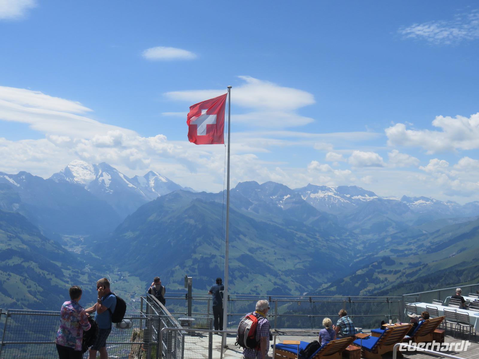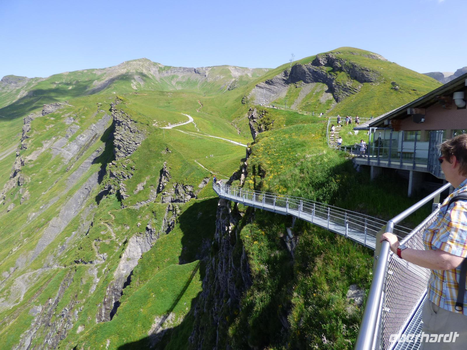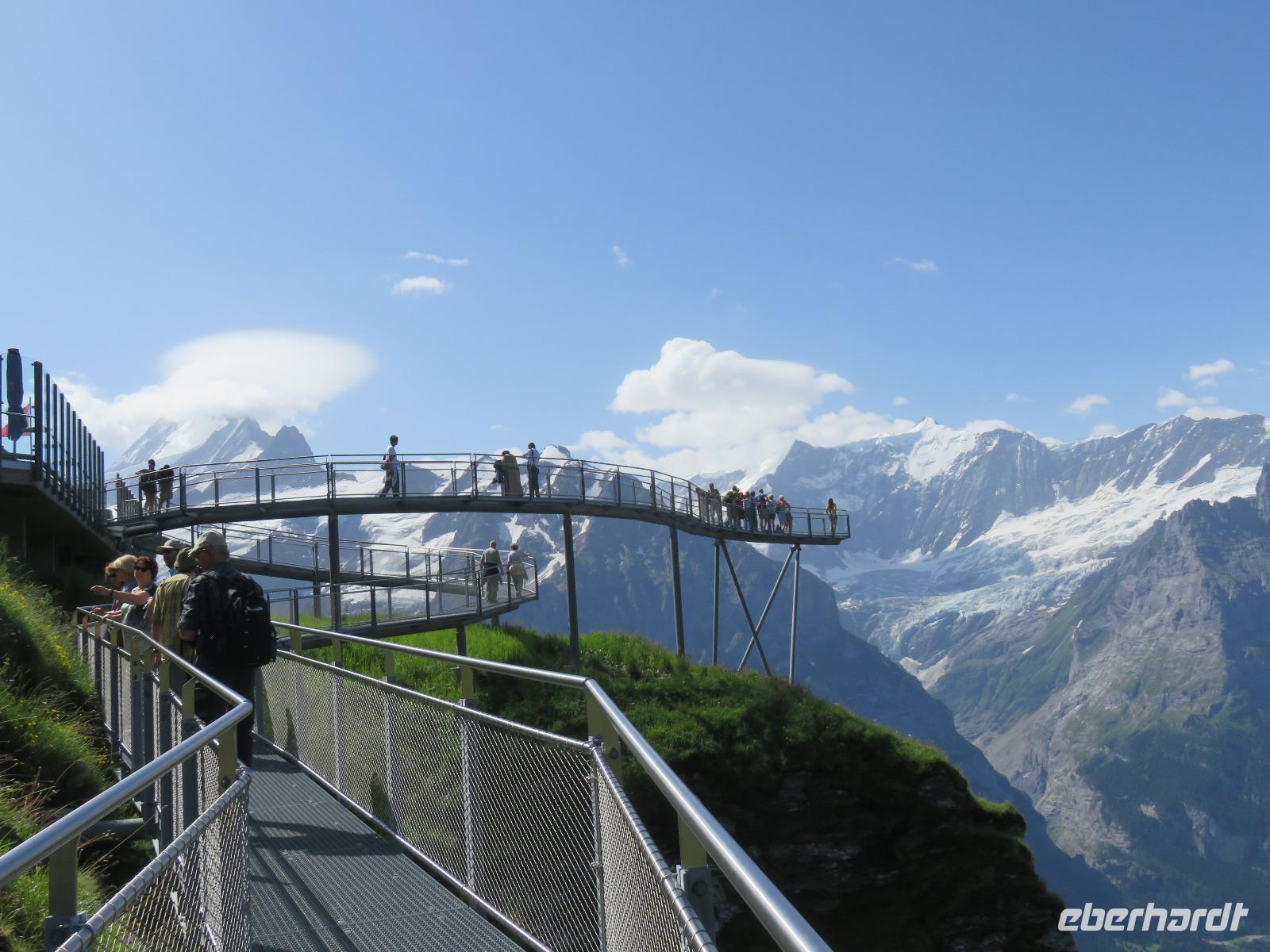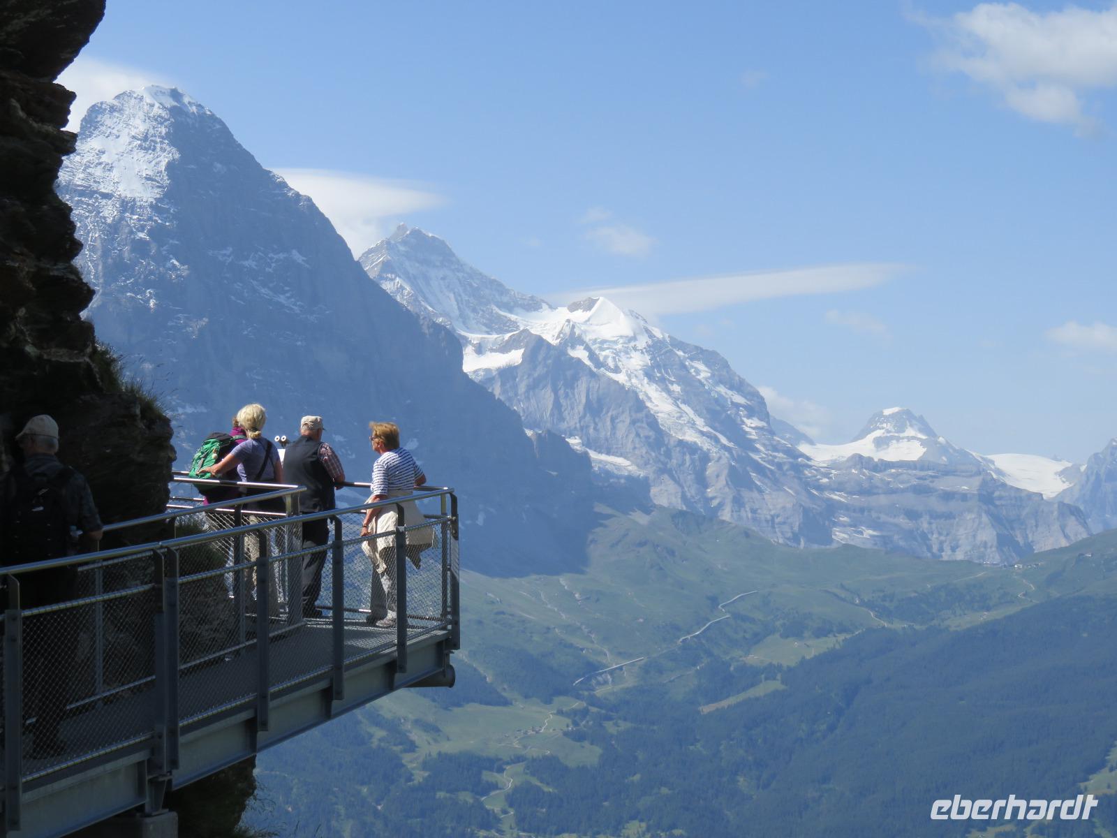 Wieder erwartet uns am Morgen strahlender Sonnenschein. Mit dem Bus geht es für uns nach Grindelwald. Wir fahren mit der Gondel-Umlaufbahn auf den First auf 2.168 Meter. Von der schönen Aussichtsterrasse auf dem Gipfel eröffnet sich uns ein beeindruckender Blick auf die Welt der Drei- und Viertausender. Wir sehen das Wetterhorn (3.701 Meter), das Schreckhorn (4.078 Meter), den Eiger (3.970 Meter) mit seiner riesigen Nordwand und die Jungfrau (4.158 Meter). Uns bleibt genügend Zeit zum Staunen und Genießen. Einen besonderen Nervenkitzel bietet uns der Cliff-Walk. Direkt unterhalb des Gipfels des Firstes an einer steilen Felswand führt uns der aus Stahlgittern gebaute Weg über den Abgrund. Zahlreiche tolle Fotomotive animieren uns immer wieder dazu, den Auslöser unserer Kameras zu betätigen. Am Mittag kehren wir nach Interlaken zurück. Den Nachmittag nutzen wir zu einem Besuch auf dem Hausberg von Interlaken, den Hader Kulm. Die Talstation der Standseilbahn, die uns auf den 1.350 Meter hohen Berg bringt, befindet sich nur wenige Minuten von unserem Hotel entfernt. Uns bleibt aber nicht viel Zeit, die Aussicht zu genießen, denn ein heftiges Gewitter entlädt sich am späten Nachmittag über Interlaken. Aber nach dem Abendessen zieht es weg und wir bummeln durch den bekannten Ferienort mit seinen vielen Geschäften, Restaurants und Cafés.