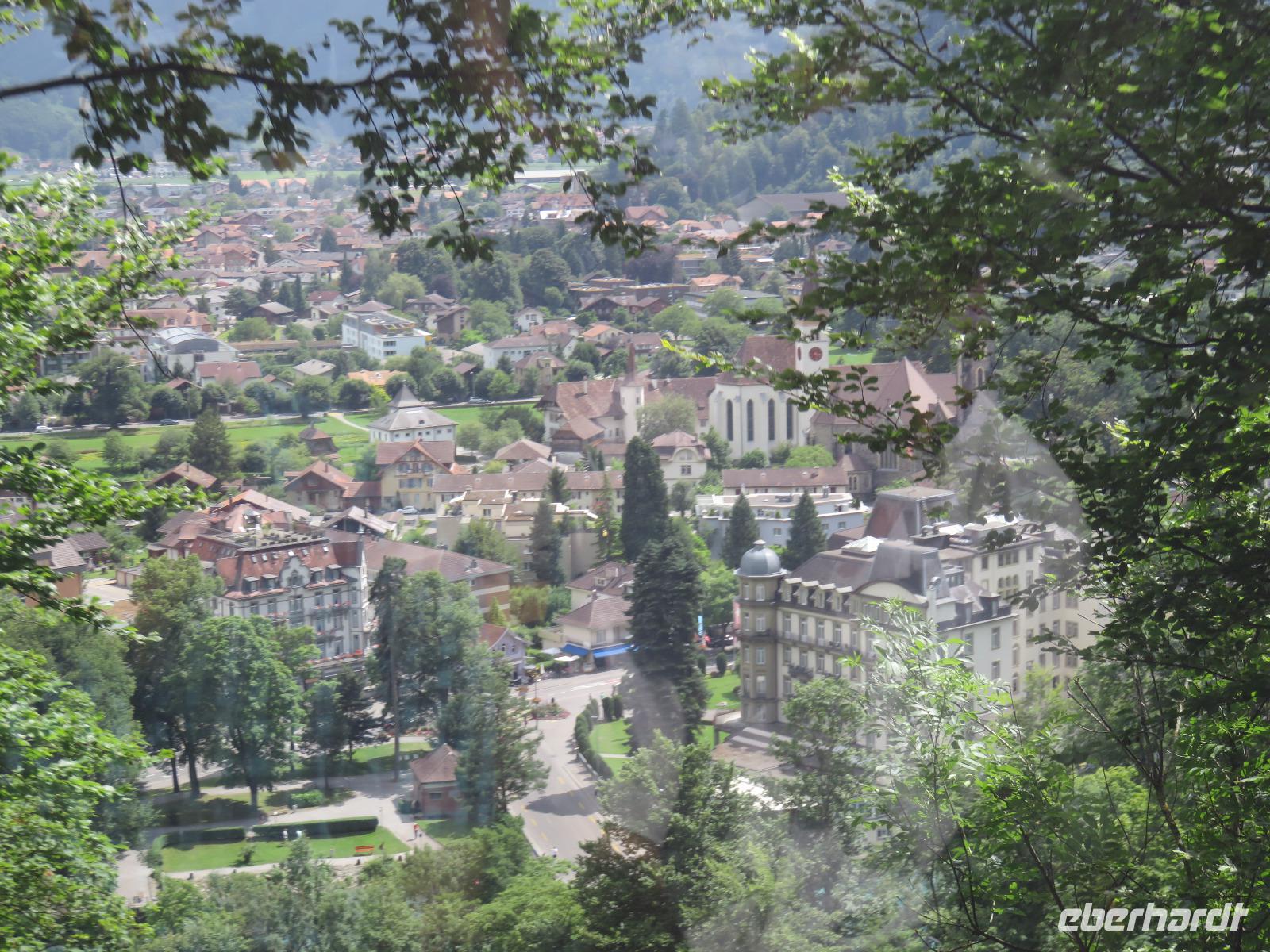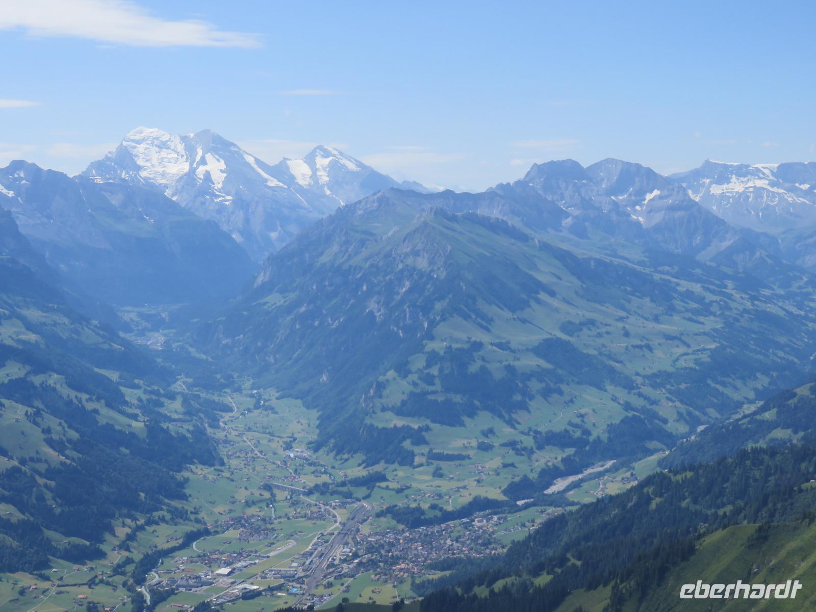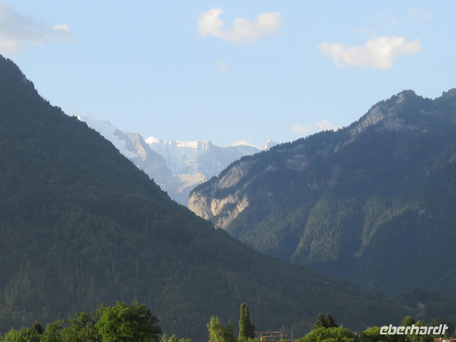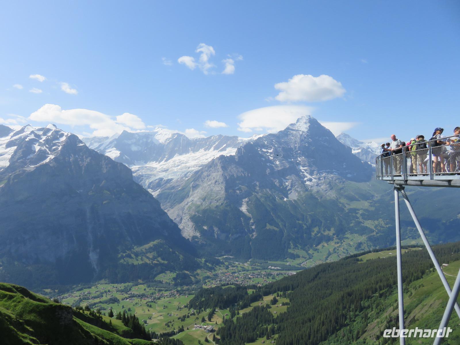 Wieder erwartet uns am Morgen strahlender Sonnenschein. Mit dem Bus geht es für uns nach Grindelwald. Wir fahren mit der Gondel-Umlaufbahn auf den First auf 2.168 Meter. Von der schönen Aussichtsterrasse auf dem Gipfel eröffnet sich uns ein beeindruckender Blick auf die Welt der Drei- und Viertausender. Wir sehen das Wetterhorn (3.701 Meter), das Schreckhorn (4.078 Meter), den Eiger (3.970 Meter) mit seiner riesigen Nordwand und die Jungfrau (4.158 Meter). Uns bleibt genügend Zeit zum Staunen und Genießen. Einen besonderen Nervenkitzel bietet uns der Cliff-Walk. Direkt unterhalb des Gipfels des Firstes an einer steilen Felswand führt uns der aus Stahlgittern gebaute Weg über den Abgrund. Zahlreiche tolle Fotomotive animieren uns immer wieder dazu, den Auslöser unserer Kameras zu betätigen. Am Mittag kehren wir nach Interlaken zurück. Den Nachmittag nutzen wir zu einem Besuch auf dem Hausberg von Interlaken, den Hader Kulm. Die Talstation der Standseilbahn, die uns auf den 1.350 Meter hohen Berg bringt, befindet sich nur wenige Minuten von unserem Hotel entfernt. Uns bleibt aber nicht viel Zeit, die Aussicht zu genießen, denn ein heftiges Gewitter entlädt sich am späten Nachmittag über Interlaken. Aber nach dem Abendessen zieht es weg und wir bummeln durch den bekannten Ferienort mit seinen vielen Geschäften, Restaurants und Cafés.