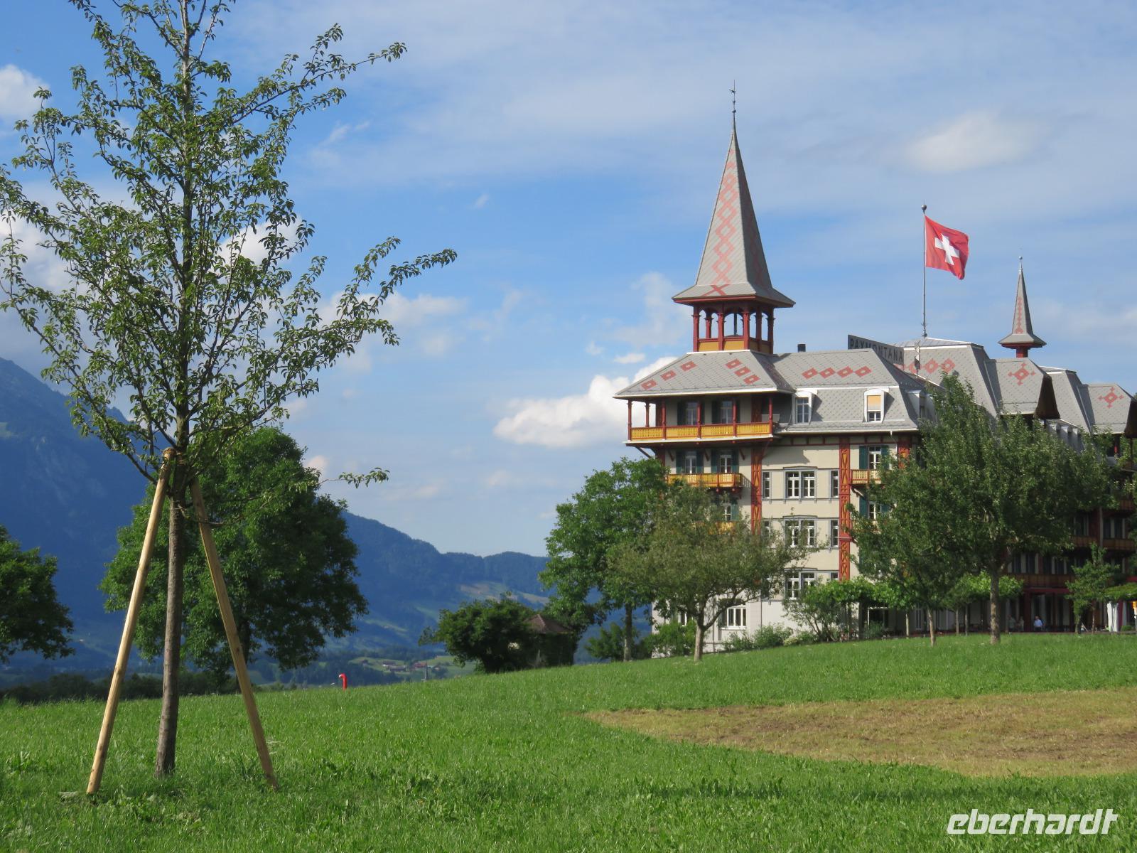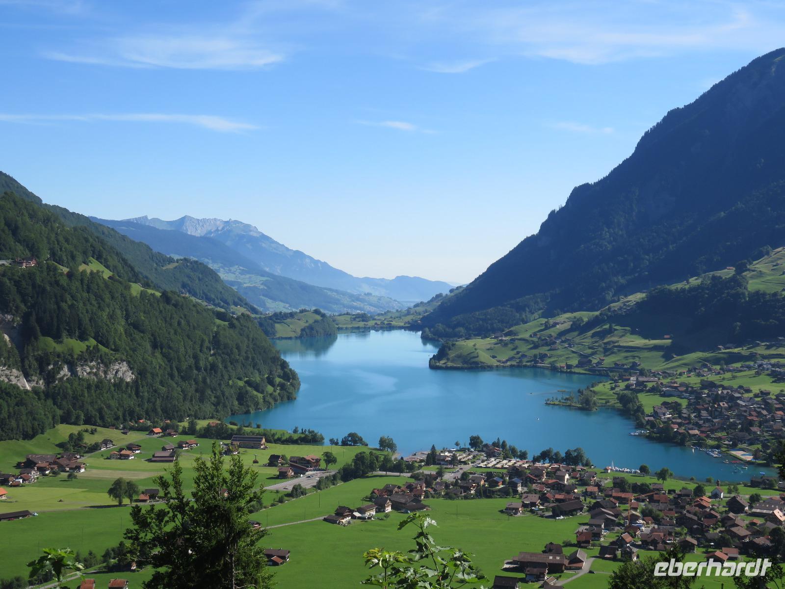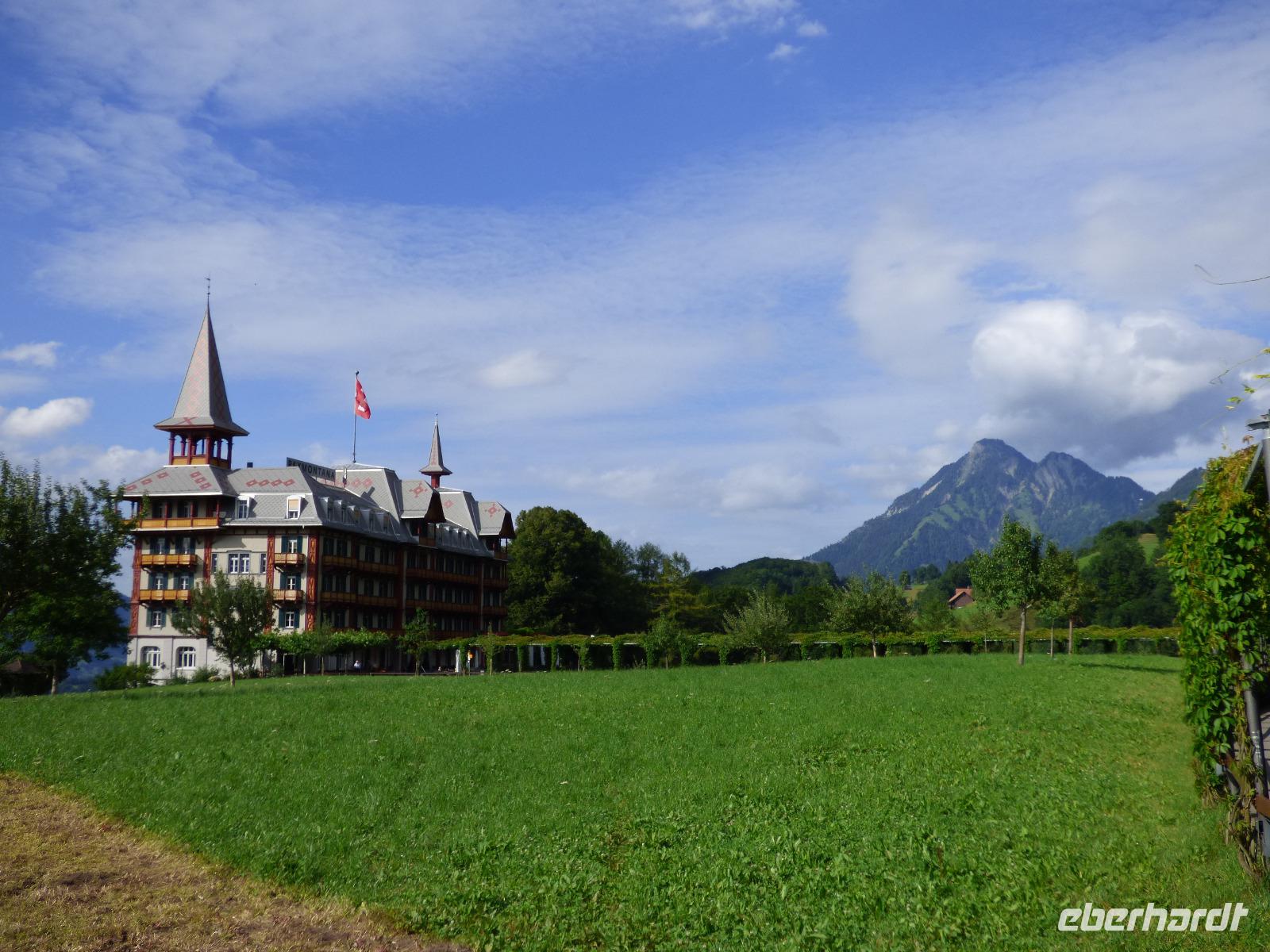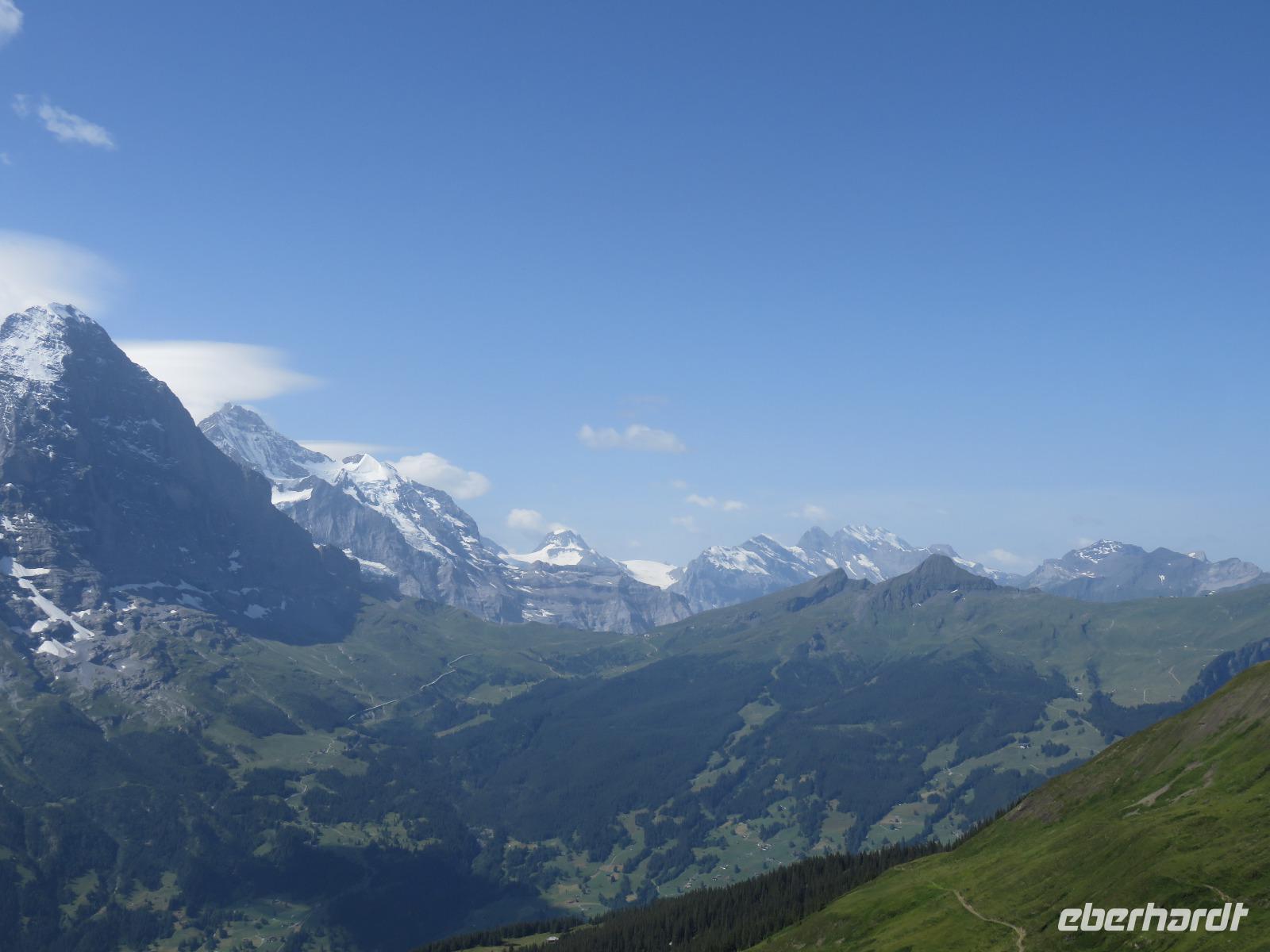 Wieder erwartet uns am Morgen strahlender Sonnenschein. Mit dem Bus geht es für uns nach Grindelwald. Wir fahren mit der Gondel-Umlaufbahn auf den First auf 2.168 Meter. Von der schönen Aussichtsterrasse auf dem Gipfel eröffnet sich uns ein beeindruckender Blick auf die Welt der Drei- und Viertausender. Wir sehen das Wetterhorn (3.701 Meter), das Schreckhorn (4.078 Meter), den Eiger (3.970 Meter) mit seiner riesigen Nordwand und die Jungfrau (4.158 Meter). Uns bleibt genügend Zeit zum Staunen und Genießen. Einen besonderen Nervenkitzel bietet uns der Cliff-Walk. Direkt unterhalb des Gipfels des Firstes an einer steilen Felswand führt uns der aus Stahlgittern gebaute Weg über den Abgrund. Zahlreiche tolle Fotomotive animieren uns immer wieder dazu, den Auslöser unserer Kameras zu betätigen. Am Mittag kehren wir nach Interlaken zurück. Den Nachmittag nutzen wir zu einem Besuch auf dem Hausberg von Interlaken, den Hader Kulm. Die Talstation der Standseilbahn, die uns auf den 1.350 Meter hohen Berg bringt, befindet sich nur wenige Minuten von unserem Hotel entfernt. Uns bleibt aber nicht viel Zeit, die Aussicht zu genießen, denn ein heftiges Gewitter entlädt sich am späten Nachmittag über Interlaken. Aber nach dem Abendessen zieht es weg und wir bummeln durch den bekannten Ferienort mit seinen vielen Geschäften, Restaurants und Cafés.