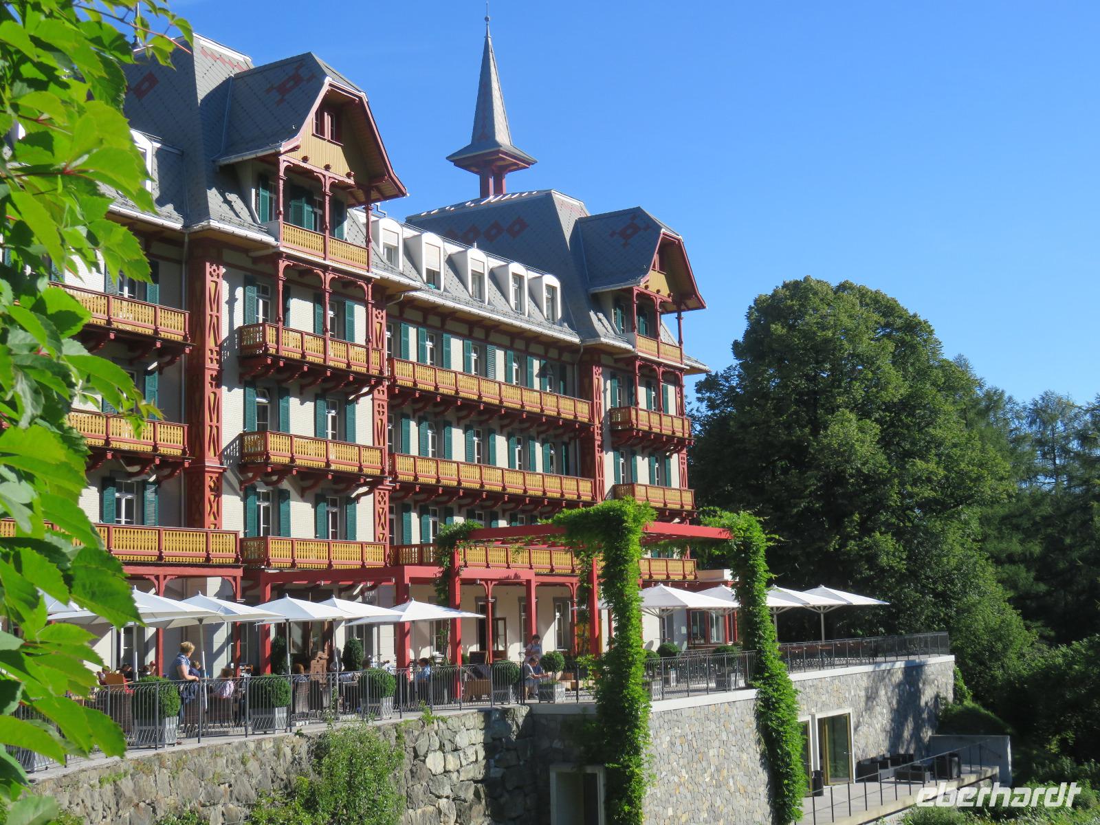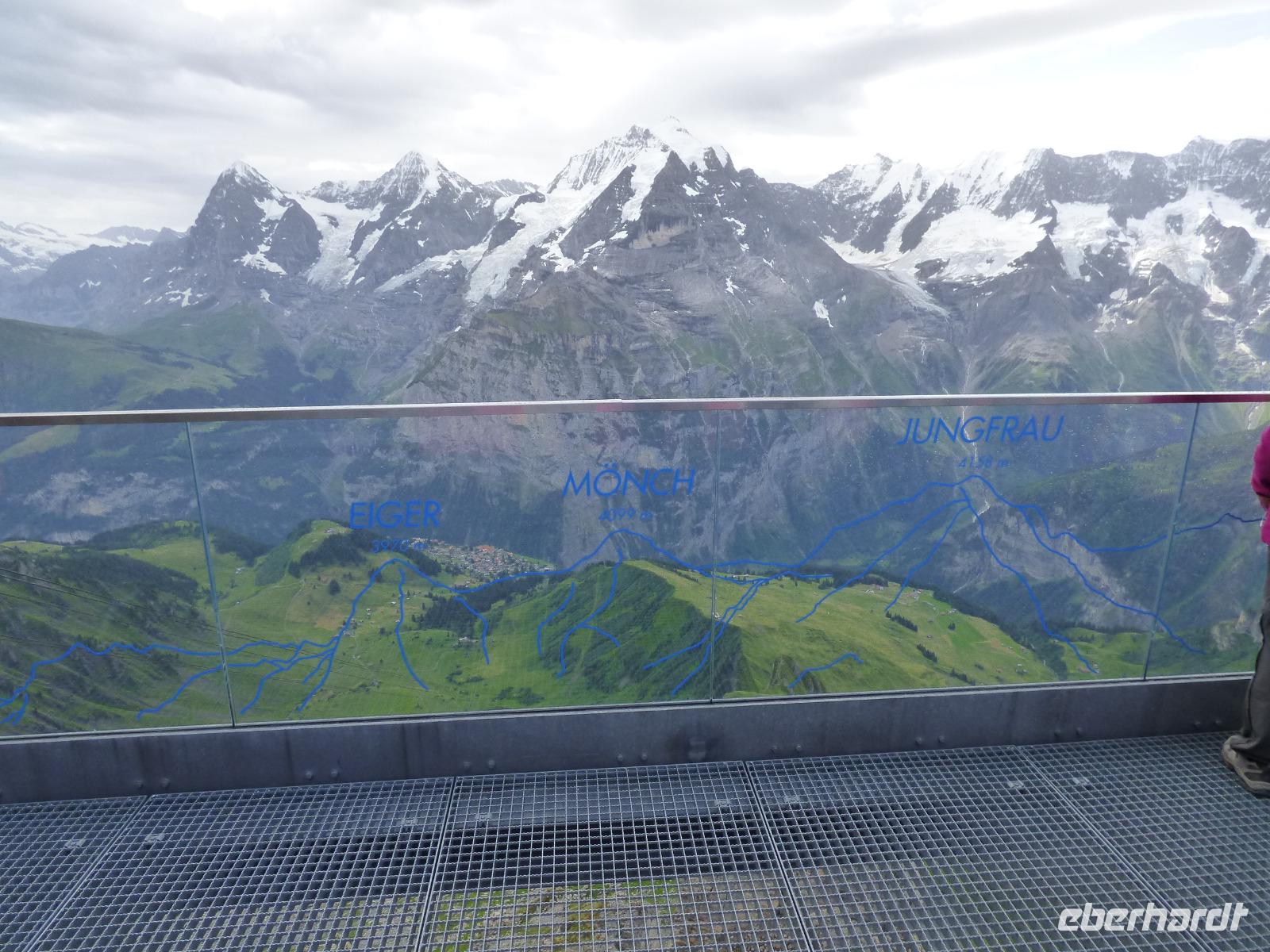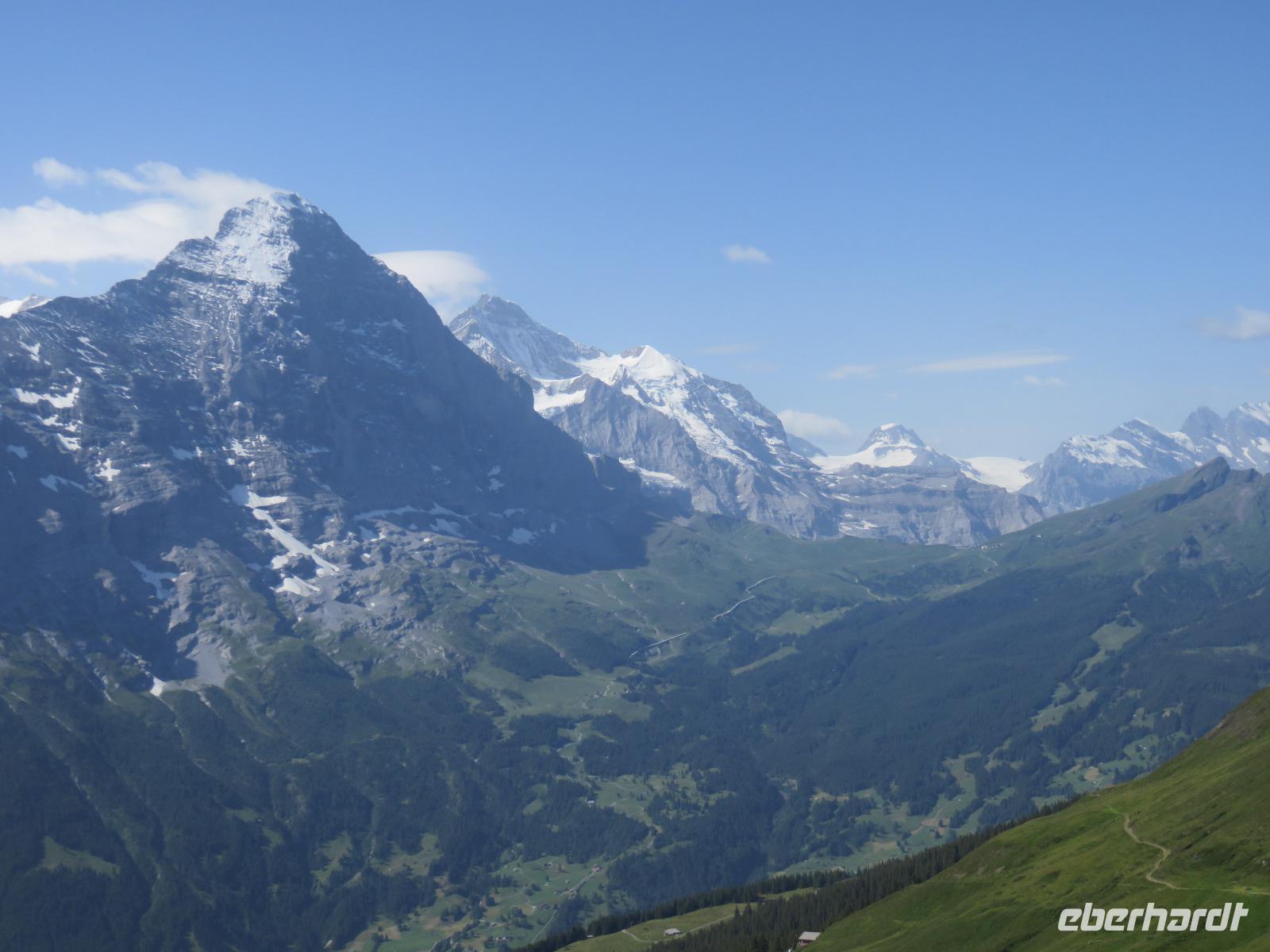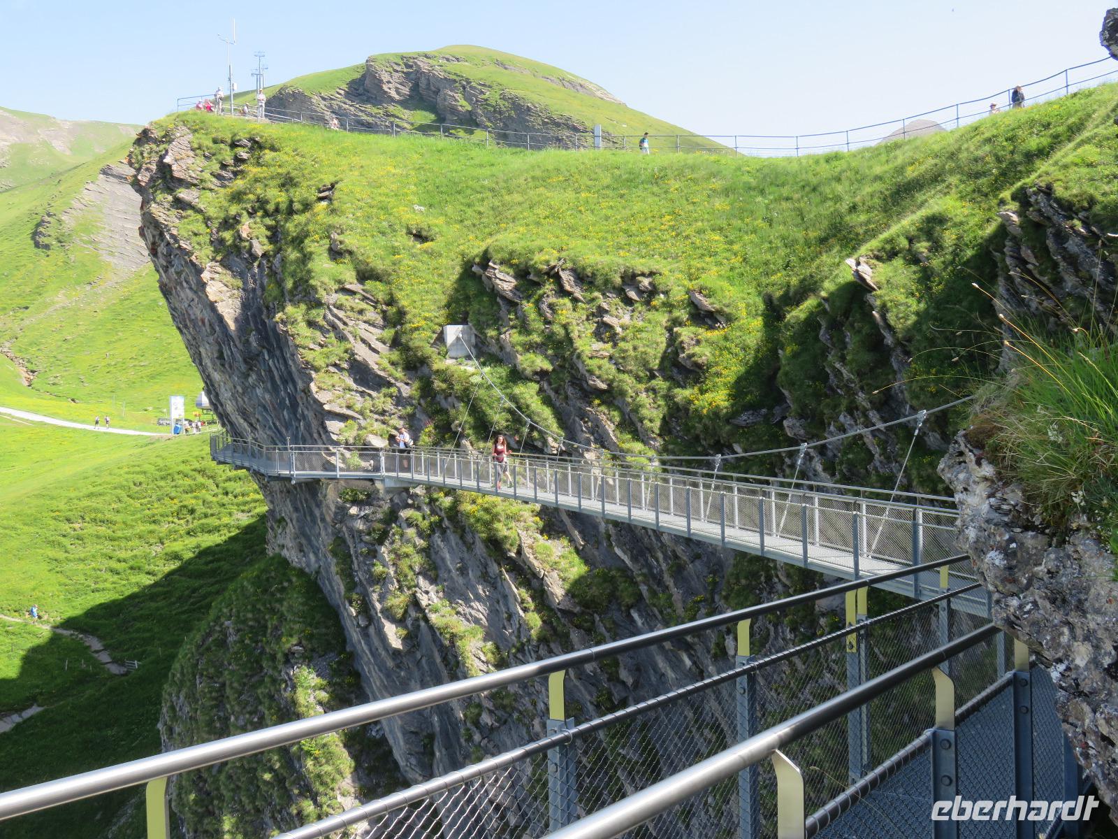 Wieder erwartet uns am Morgen strahlender Sonnenschein. Mit dem Bus geht es für uns nach Grindelwald. Wir fahren mit der Gondel-Umlaufbahn auf den First auf 2.168 Meter. Von der schönen Aussichtsterrasse auf dem Gipfel eröffnet sich uns ein beeindruckender Blick auf die Welt der Drei- und Viertausender. Wir sehen das Wetterhorn (3.701 Meter), das Schreckhorn (4.078 Meter), den Eiger (3.970 Meter) mit seiner riesigen Nordwand und die Jungfrau (4.158 Meter). Uns bleibt genügend Zeit zum Staunen und Genießen. Einen besonderen Nervenkitzel bietet uns der Cliff-Walk. Direkt unterhalb des Gipfels des Firstes an einer steilen Felswand führt uns der aus Stahlgittern gebaute Weg über den Abgrund. Zahlreiche tolle Fotomotive animieren uns immer wieder dazu, den Auslöser unserer Kameras zu betätigen. Am Mittag kehren wir nach Interlaken zurück. Den Nachmittag nutzen wir zu einem Besuch auf dem Hausberg von Interlaken, den Hader Kulm. Die Talstation der Standseilbahn, die uns auf den 1.350 Meter hohen Berg bringt, befindet sich nur wenige Minuten von unserem Hotel entfernt. Uns bleibt aber nicht viel Zeit, die Aussicht zu genießen, denn ein heftiges Gewitter entlädt sich am späten Nachmittag über Interlaken. Aber nach dem Abendessen zieht es weg und wir bummeln durch den bekannten Ferienort mit seinen vielen Geschäften, Restaurants und Cafés.