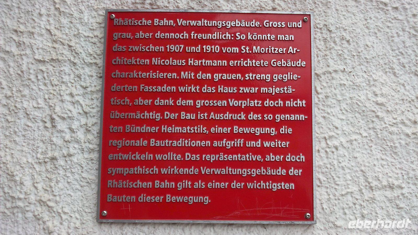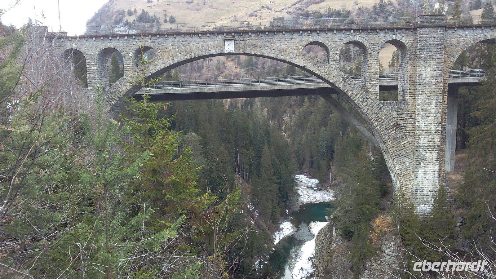 durch Chur, vorbei an Stadtmauer, Malteserturm und Obertor, dem Wahrzeichen der Bündner Hauptstadt. Doch schon bald ist's vorbei mit dem Stadtbummel auf Schienen. An der Stadtgrenze wandelt sich der Express nämlich zur Gebirgsbahn und windet sich durchs wilde Schanfigger Tal hinauf nach Arosa. Dabei durchfahren wir 19 Tunnel und 20 große Brücken. Das Langwieser Viadukt, das die Plessur überquert, ist auf der Strecke besonders hervorzuheben. War es doch die erste Großbrücke aus Eisenbeton mit einer Länge von 287 m und Höhe von 62 m.