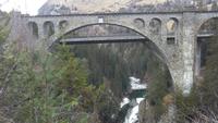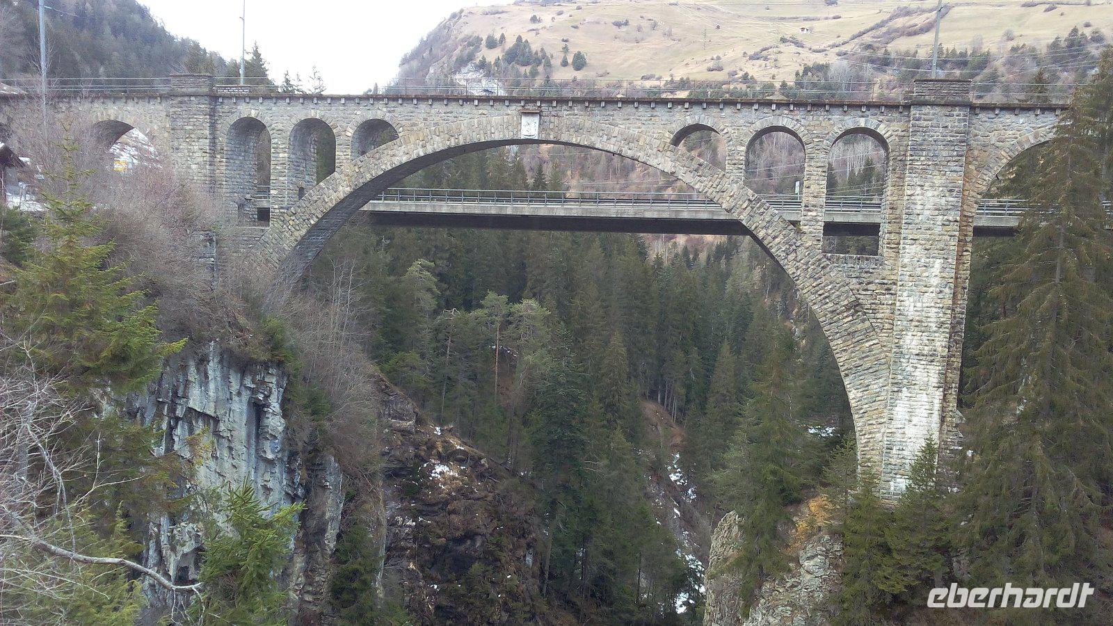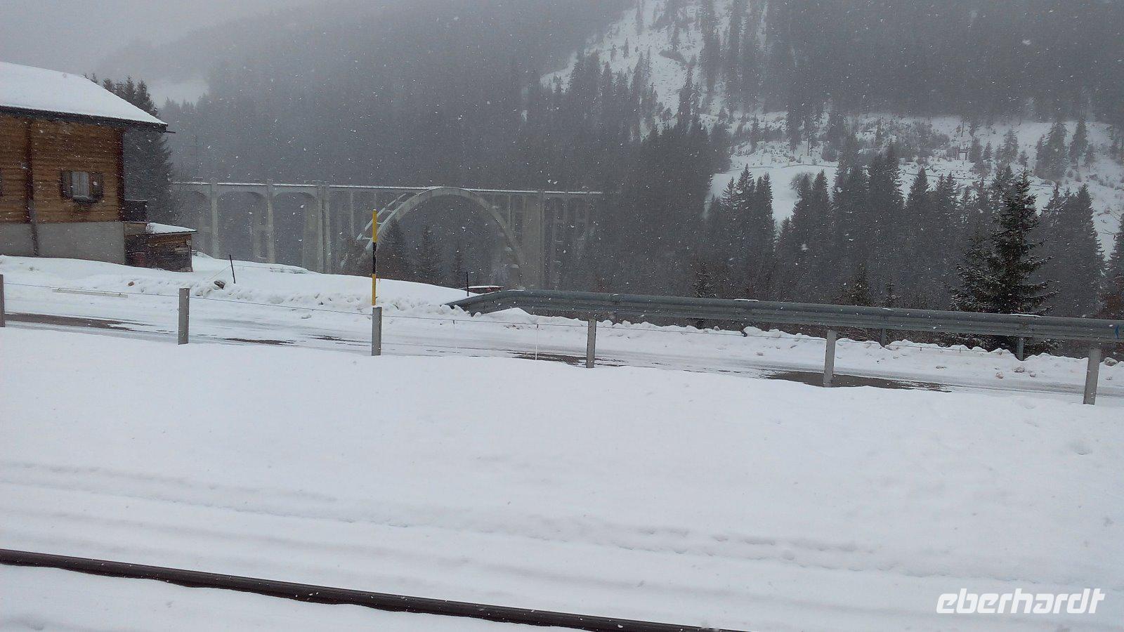 Nach rund vier Stunden fahren wir mit dem Arosa-Express zurück nach Chur. Mit dem Bus geht es wieder nach Tiefencastel. Auf dem Weg zum Hotel stoppen wir am Solis Viadukt, das 1901-1903 erbaut wurde und mit seiner Höhe von 87 m die höchste Brücke der Rhätischen Bahn ist. Das Foto gehört in die Sammlung des Wintertraums und Andreas hat uns einen Glühwein erwärmt, mit dem wir ganz geduldig auf den Zug warten können. Nach dem alles im "Kasten" ist, kommen wir noch rechtzeitig am Hotel an, um noch die Kirche hoch auf dem Berg aufzusuchen, bevor wir uns zum leckeren Abendessen treffen.