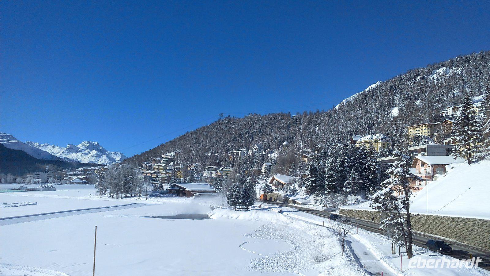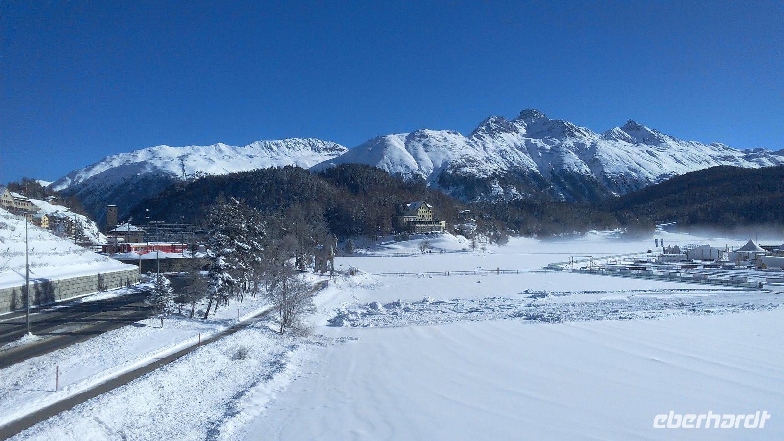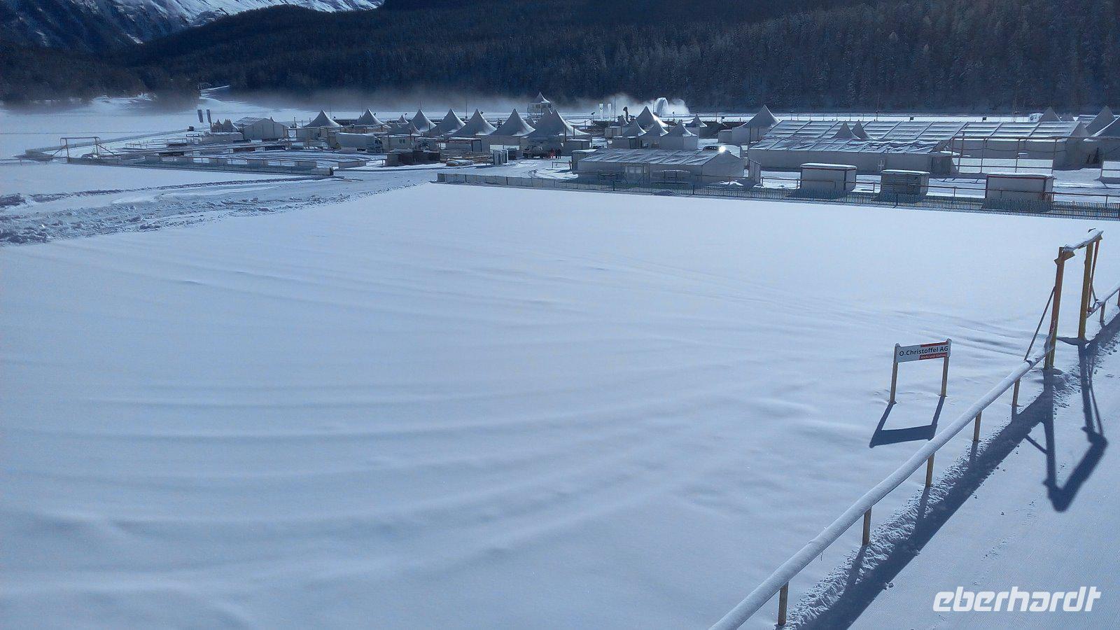 Das internationale Pferderennen, das bereits seit 1907 mit Spektakulärem aufwartet. Bei dieser Sicht müssen wir den See im Foto festhalten. Leider sehen wir heute nur die Vorbereitungen. Ein Rennen findet erst am 14.02. statt. Nachdem wir wieder am Bus sind, fährt Andreas mit uns noch durch den Ort. Wir wollen die Bobbahn noch sehen. Dabei fahren wir am Badrutt's Palace Hotel vorbei. Wie sehen die Boutiquen, den schiefen Turm, das Wahrzeichen des Ortes, der Mauritius Kirche. Danach haben wir auch einen Blick auf die älteste Natur-Bobbahn der Welt. Seit über hundert Jahren wird die Bahn jeden Winter nur aus Wasser und Schnee gefertigt.