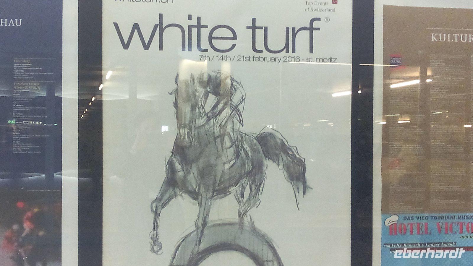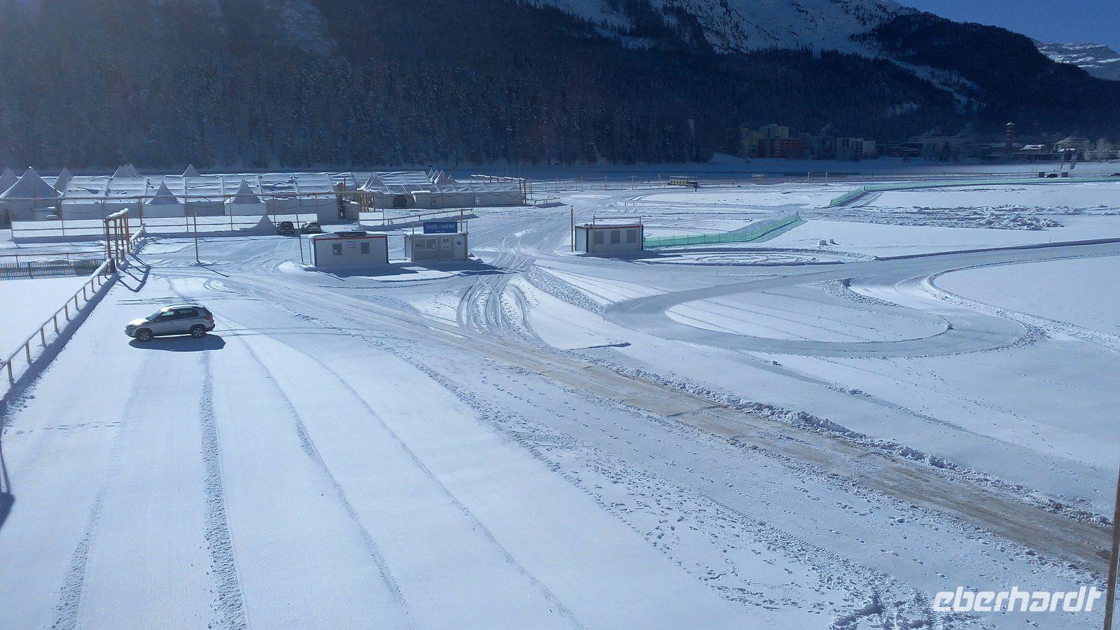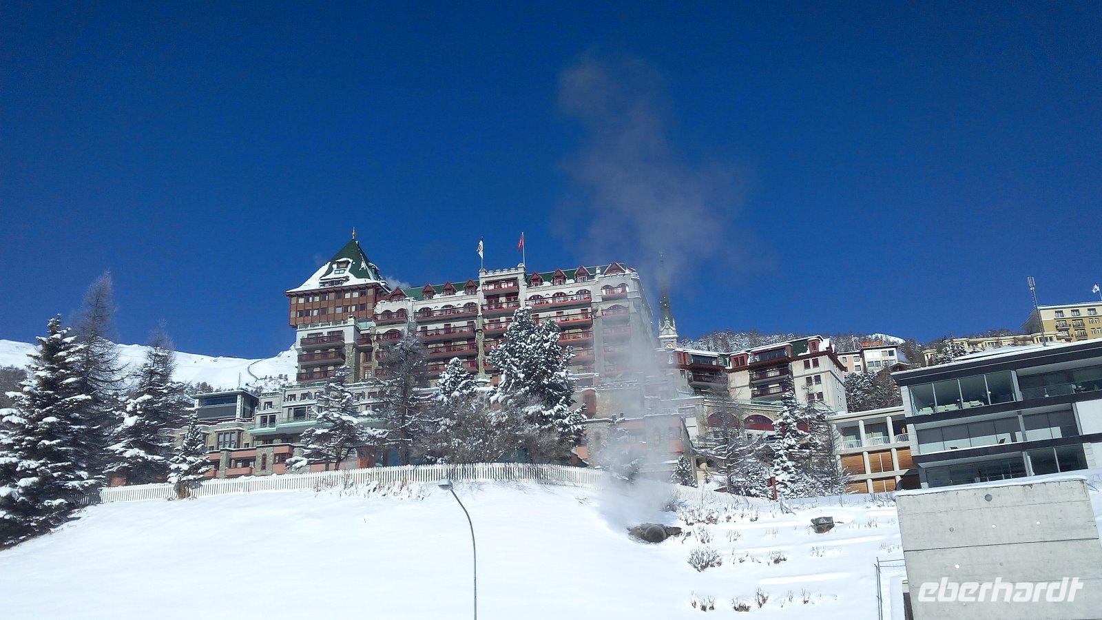 Das internationale Pferderennen, das bereits seit 1907 mit Spektakulärem aufwartet. Bei dieser Sicht müssen wir den See im Foto festhalten. Leider sehen wir heute nur die Vorbereitungen. Ein Rennen findet erst am 14.02. statt. Nachdem wir wieder am Bus sind, fährt Andreas mit uns noch durch den Ort. Wir wollen die Bobbahn noch sehen. Dabei fahren wir am Badrutt's Palace Hotel vorbei. Wie sehen die Boutiquen, den schiefen Turm, das Wahrzeichen des Ortes, der Mauritius Kirche. Danach haben wir auch einen Blick auf die älteste Natur-Bobbahn der Welt. Seit über hundert Jahren wird die Bahn jeden Winter nur aus Wasser und Schnee gefertigt.