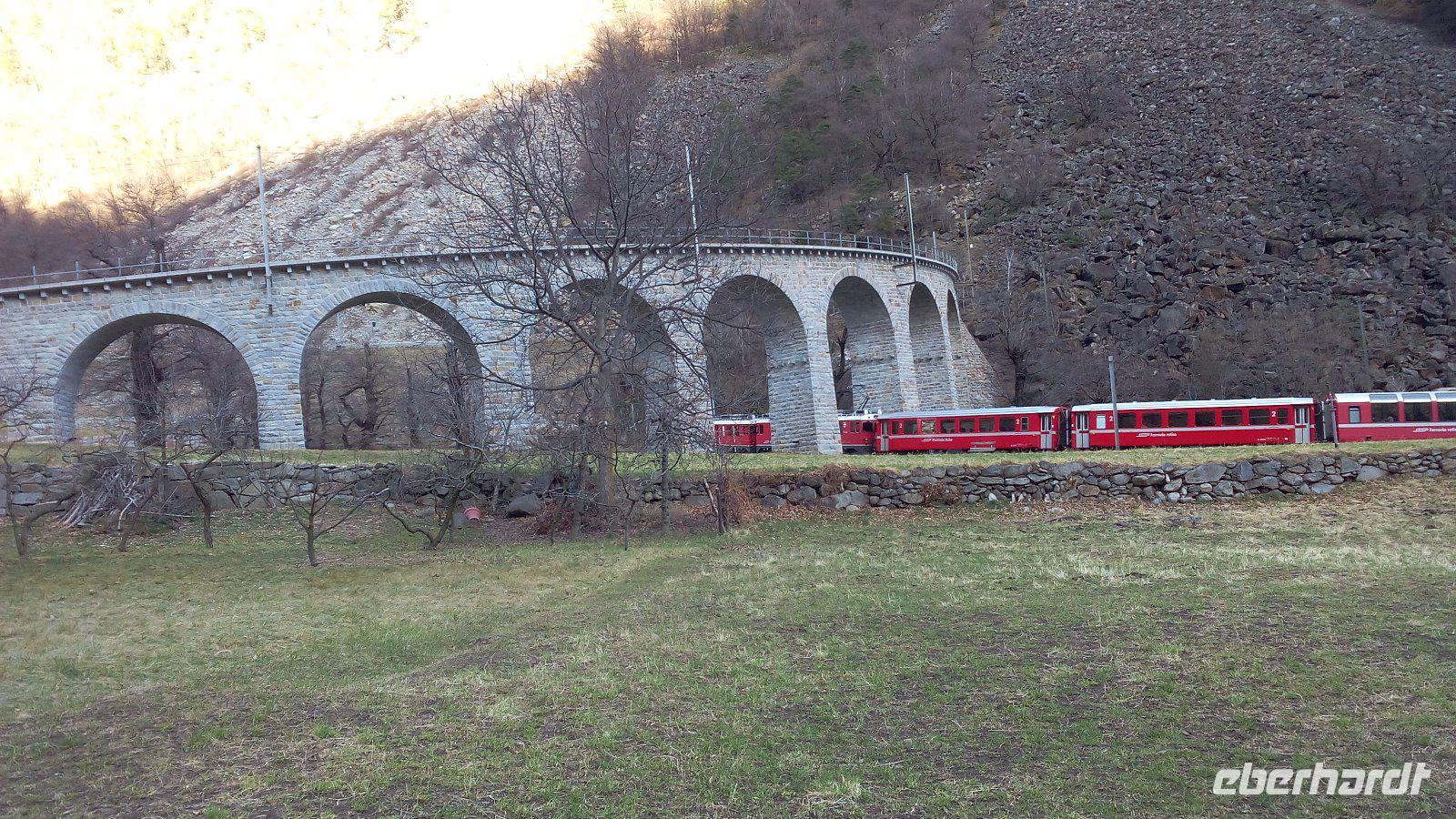 Jetzt müssen wir uns aber sputen, um den Bernina-Express noch rechtzeitig zu erreichen. Der lässt auf sich warten und es bleibt Zeit alte Bekannte zu begrüßen. Mit 15 Minuten Verspätung beginnt unsere Fahrt mit dem Bernina- Express, der höchsten Bahnverbindung, die offen - ohne Scheiteltunnel - über die Alpen führt, nach Tirano. Begeisterung bei allen Gästen, vor allem natürlich bei den Fotografen. In