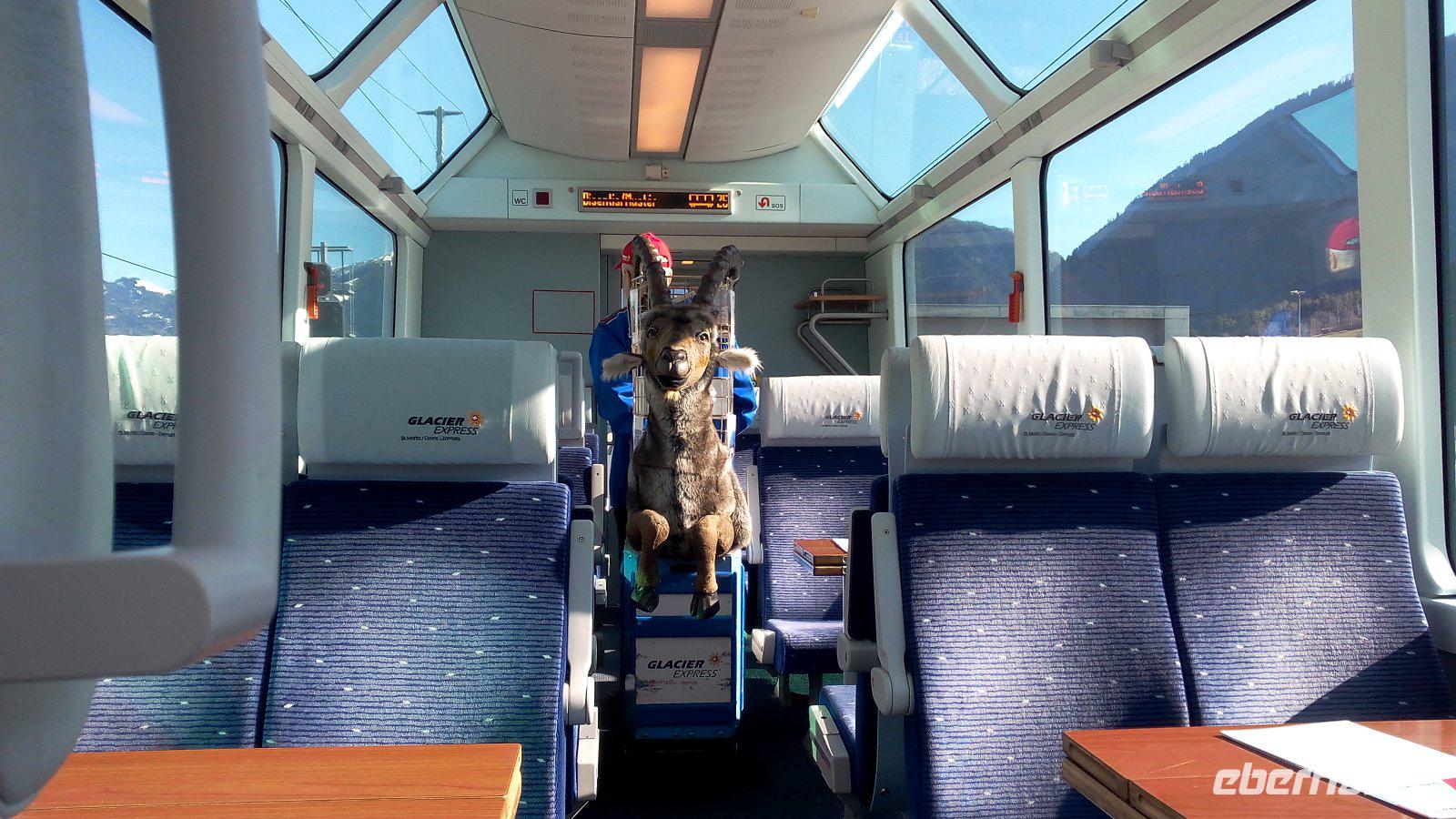 10.00 Uhr treffen wir uns am Bahnhof in Tiefencastel. Der „langsamste Schnellzug der Welt" fährt 10.15 Uhr ein. Eine Reservierung für Eberhardt Gäste zeigt uns unseren Waggon. Die Fotografen wollen natürlich ans Fenster. Aber die Panoramawagen des Glacier Expresses bieten allen Gästen eine allerbeste Aussicht auf die Umgebung. Unsere Panoramafahrt kann beginnen.