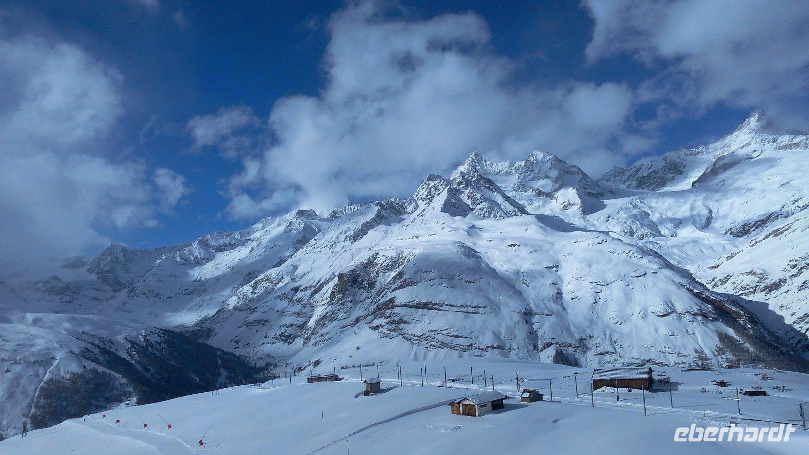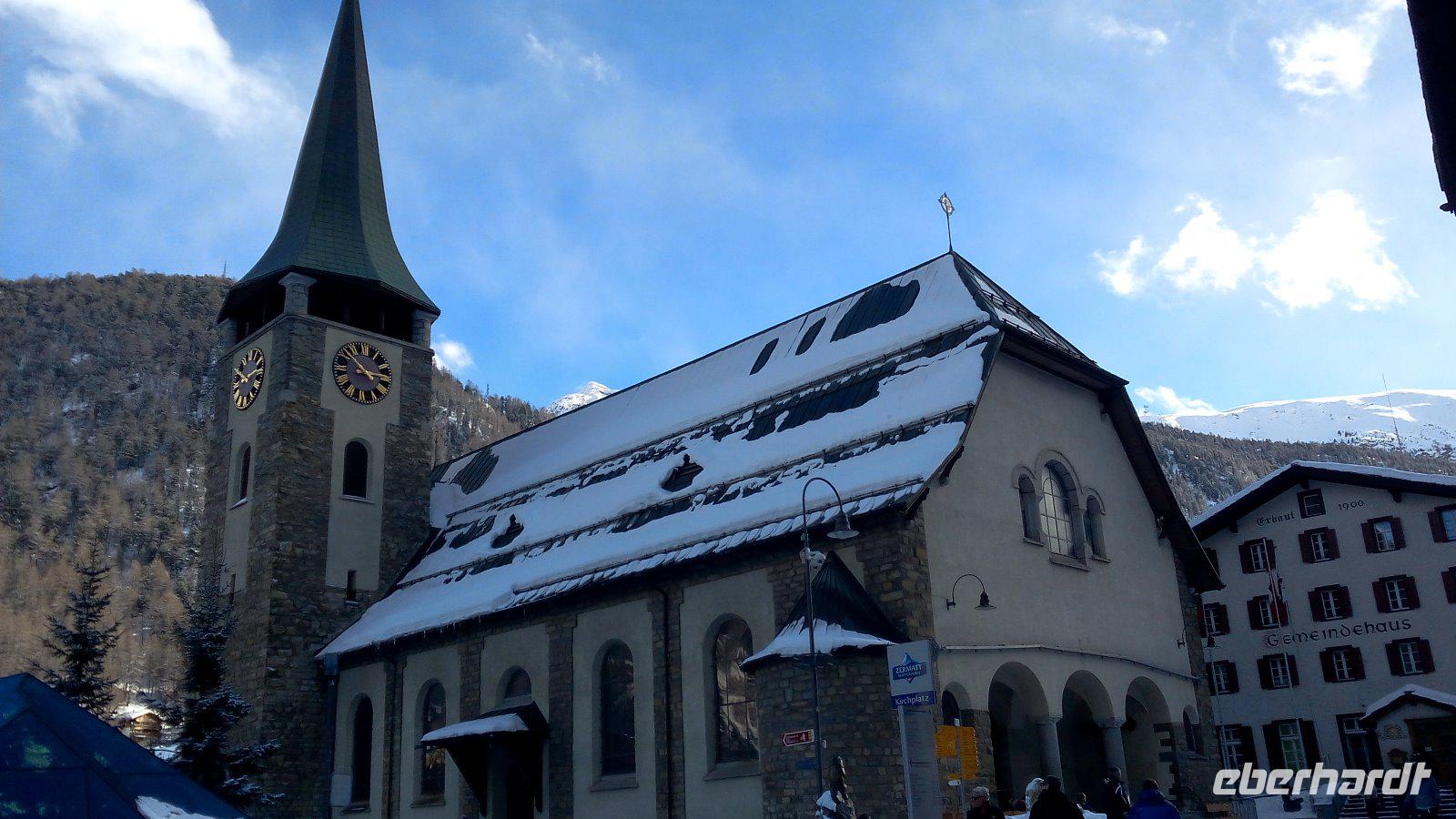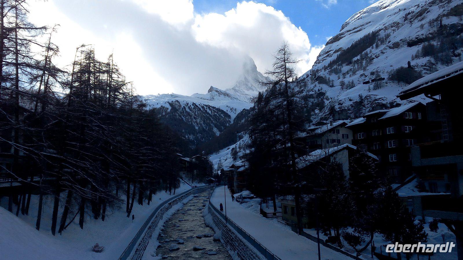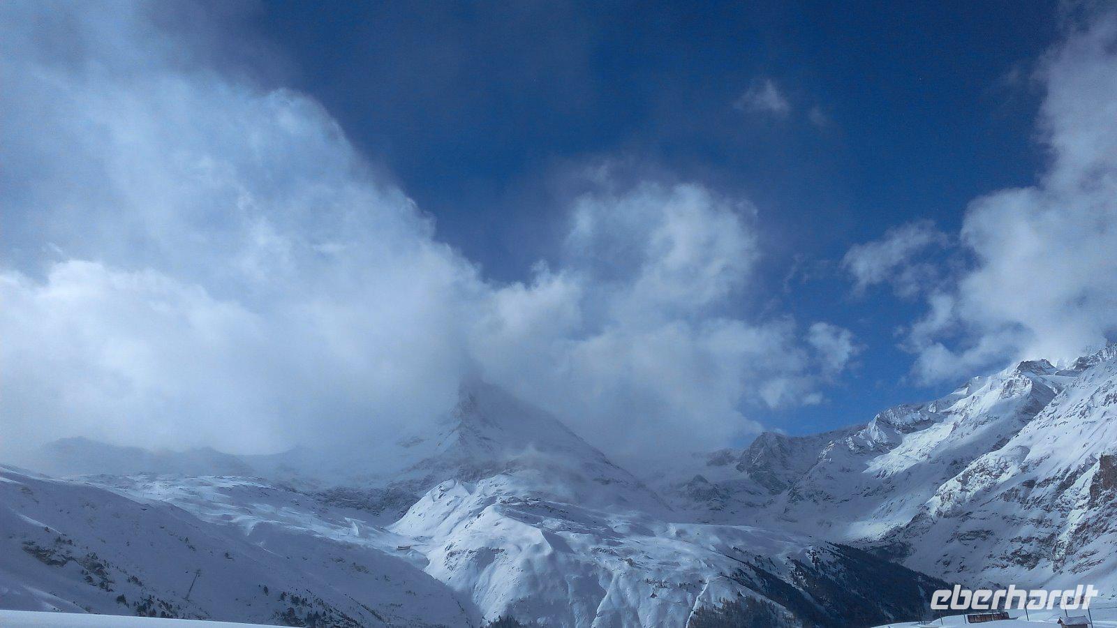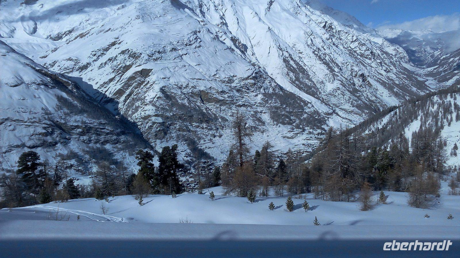 Im Mattertal erkennen wir die kleinen Orte wie z.B. Stalden mit den typischen Walliserhäusern und die mit Steinplatten versehenen Dächer oder auch der Bergsturz von 1991. Die Sicht in die Berge hat sich geändert. Tief liegende Wolken erwarten uns in Täsch. Die Erwartung ist groß, dass sich das Matterhorn heute noch zeigt. Nach 20 Minuten Bahnfahrt von Täsch nach Zermatt stehen wir am Bahnhof der Gornergratbahn. Der überwiegende Teil der Gruppe entscheidet sich für die Fahrt mit der höchsten Zahnradbahn Europas, zum 3130m hohen Gornergrat. Nach rund 40 Minuten Fahrzeit stehen wir am Gornergrat in Wolken, Wind und Schneeflocken. Ich erkläre das vor uns Viertausender "liegen" , die Dufourspitze mit 4634 m die höchste Erhebung in der Schweiz ist, aber mit einem Teil des "Fußes" in Italien steht, und wir diese Spitze im Monte Rosa-Massiv sehen könnten. Geduldig warten wir ca. 1,5 Stunden. Einige von uns sind schon nach Zermatt zurückgefahren, da beginnt die Wolkendecke aufzureisen. Jetzt sehen wir die vielen Viertausender der Schweiz. Auch den Dom mit seinen 4545 Metern, der höchste Berg der Schweiz der vollkommen auf Schweizer Boden steh Der Gornergrat ist zu jeder Jahreszeit schön. Im Winter hat er aber einen besonderen Reiz. Wir haben eine tolle Sicht auf einen Teil der 360 km Pisten in Zermatt und es ist beeindruckend, wie die Wintersportler die Hänge ins Tal wedeln. Jeder von uns nutzt die Zeit so, wie er es sich wünscht. Wir treffen uns erst am Nachmittag am Bahnhof wieder. Bis dahin haben einige auch den Ort erkundet. Vom Bahnhof aus geht es entlang der 600 m langen Bahnhofstraße, das alte Zermatt mit den schönen Häusern und einigen
