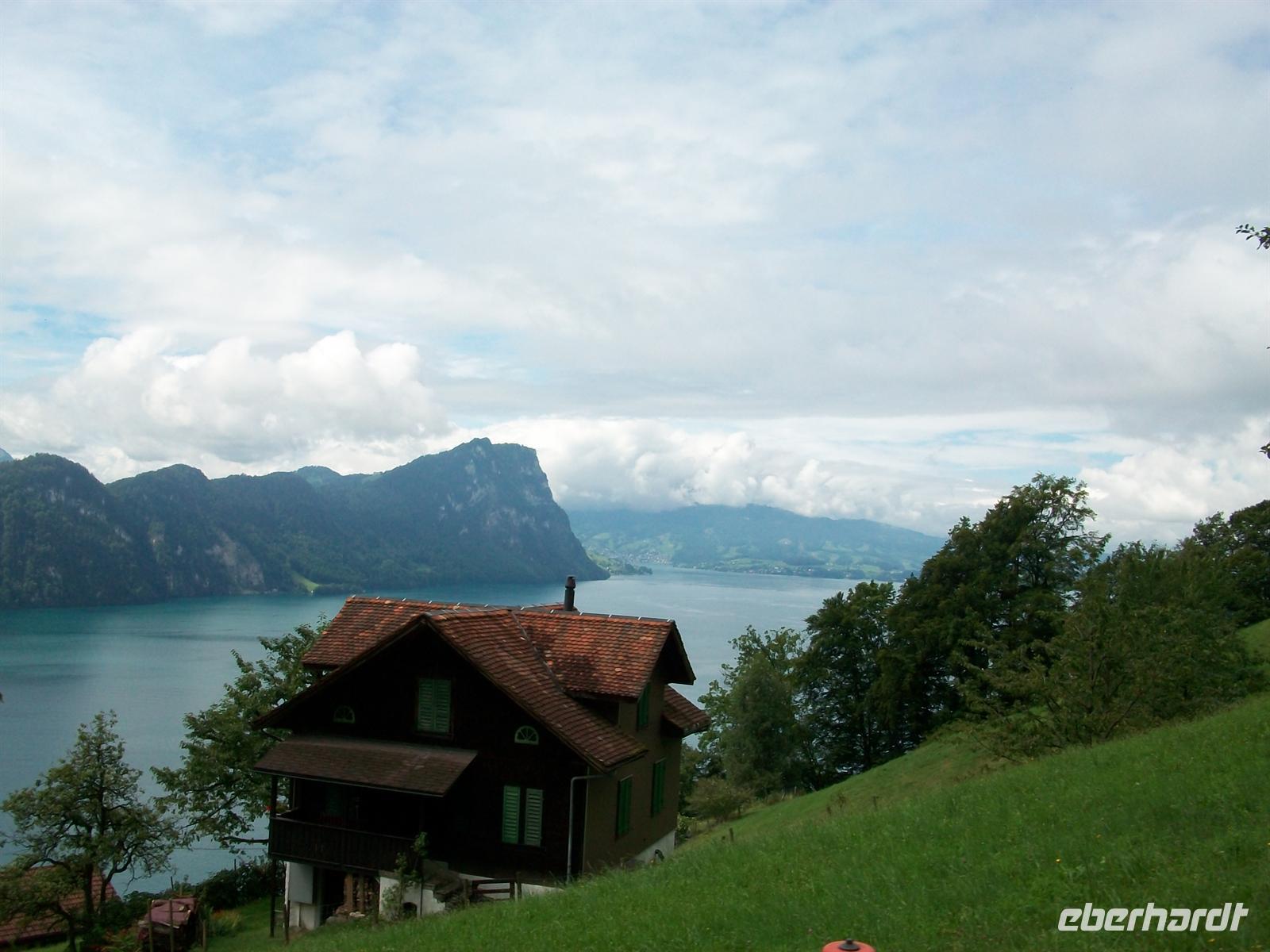 Bevor wir aber den Berg besteigen steht erst einmal eine romantische Dampferfahrt auf dem Vierwaldstätter See auf dem Programm. Nach einer kleinen Stippvisite in Luzern gehen wir erwartungsfroh gegen 11.00 Uhr an Bord. Zehn Minuten später kündet die mächtig Schiffshupe von der baldigen Abfahrt des Bootes; die Leinen werden eigezogen und los geht es. Bald werden die Häuser von Luzern kleiner und die netten Orte am Ufer ziehen langsam vorbei. Entspannt sitzen die Gäste unserer Reisegruppe an Bord und genießen die einstündige Fahrt. Bald haben wir den Hafen von Vitznau erreicht, hier verlassen wir das Schiff und steigen um in einen historischen Wagen der Zahnradbahn die uns hinauf auf die Rigi bringen wird. Schnell haben wir unsere Plätze gefunden, mit einem leichten Ruck geht die Fahrt los. Zu Beginn fahren wir durch die grünen Wiesen die sich den Berg hinaufziehen, sehen die gepflegten Häuser mit dem schönen Blumenschmuck und sind dann wieder zwischen Bäumen unterwegs. Dabei haben wir einen schönen Blick hinunter zum See, der vor unseren Augen immer kleiner wird. Oben vom Berg ziehen Wolken heran die uns urplötzlich den Blick verwehren und wir sind in einem wabernden Gebräu von Wasserdampf unterwegs. Von einem zum anderen Augenblick reißt es wieder auf und nun wird der Blick auf den anderen See frei der von hier oben zu sehen ist: es ist der Zuger See und weit über ihn hinaus können wir ins schöne Land hineinschauen. Bald sind wir oben auf dem Kulm, so heißt die Spitze hier, angelangt. Etwas mehr als 1 800 Meter hoch werden wir bis 15 Uhr Zeit haben die wirklich reizende Gegend über den Wolken zu erkunden.