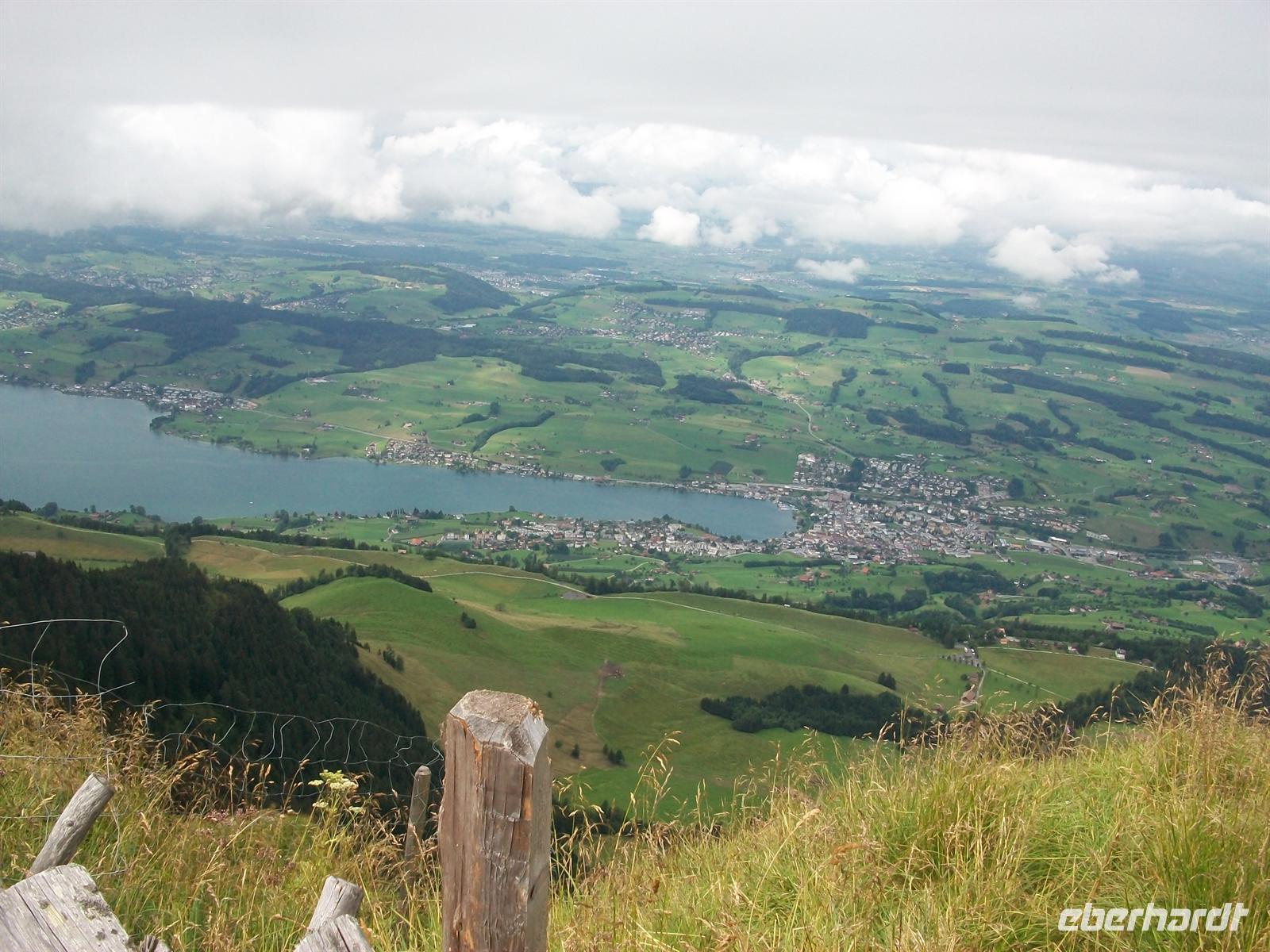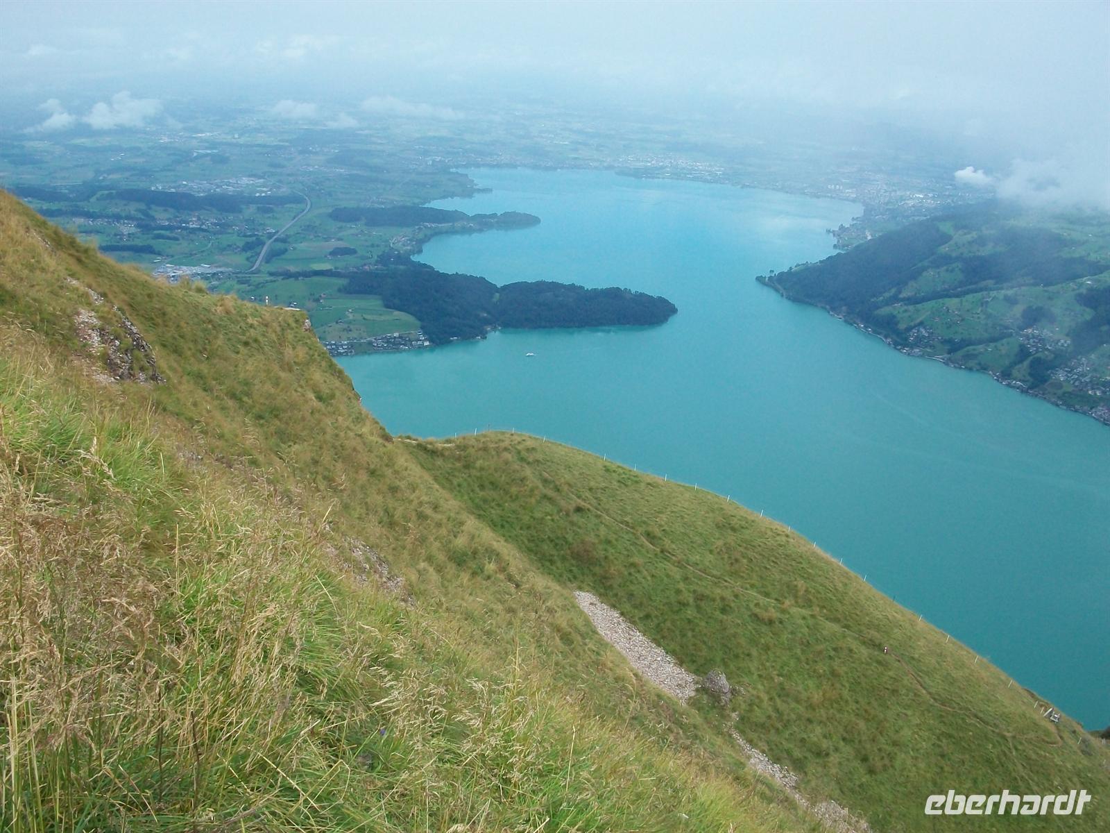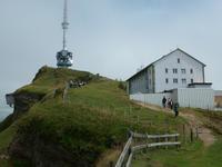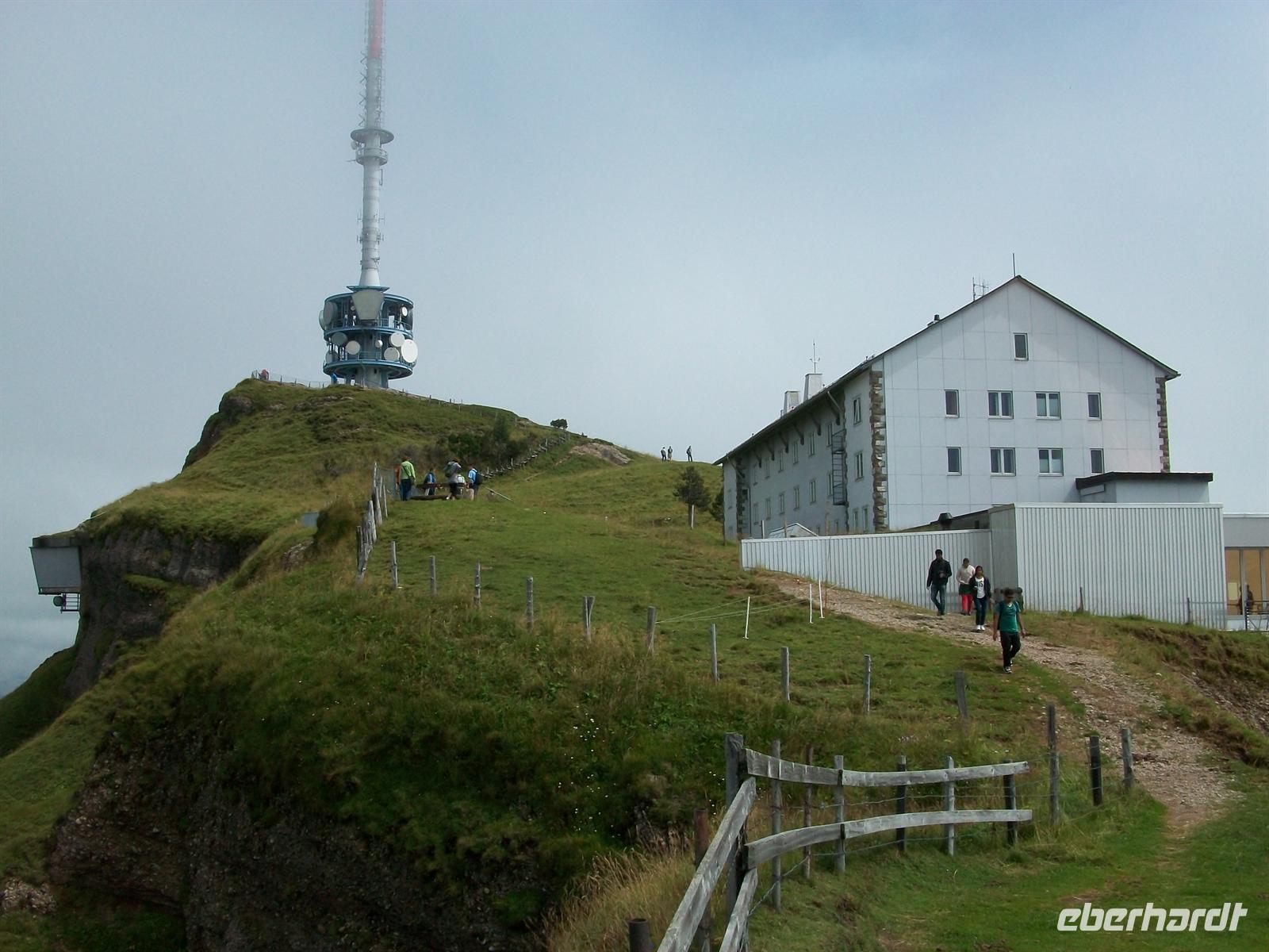 Der Weg führt hinauf in Richtung Sendeturm und von hier hat man einen wirklich überwältigenden Blick hinunter. Wie im Spielzeugland sind die Orte ausgebreitet, dazwischen die Seen und wenn auch in den Wolken, die Erhebungen rund um den Vierwaldstätter See sind gut zu sehen. Im Süden thront das mächtige Gotthardmassiv von dort geht es in die Sonnenstube der Schweiz, ins Tessin. Die Eindrücke dieses königlichen Berges sind wirklich grandios, viel Prominenz hat sich in