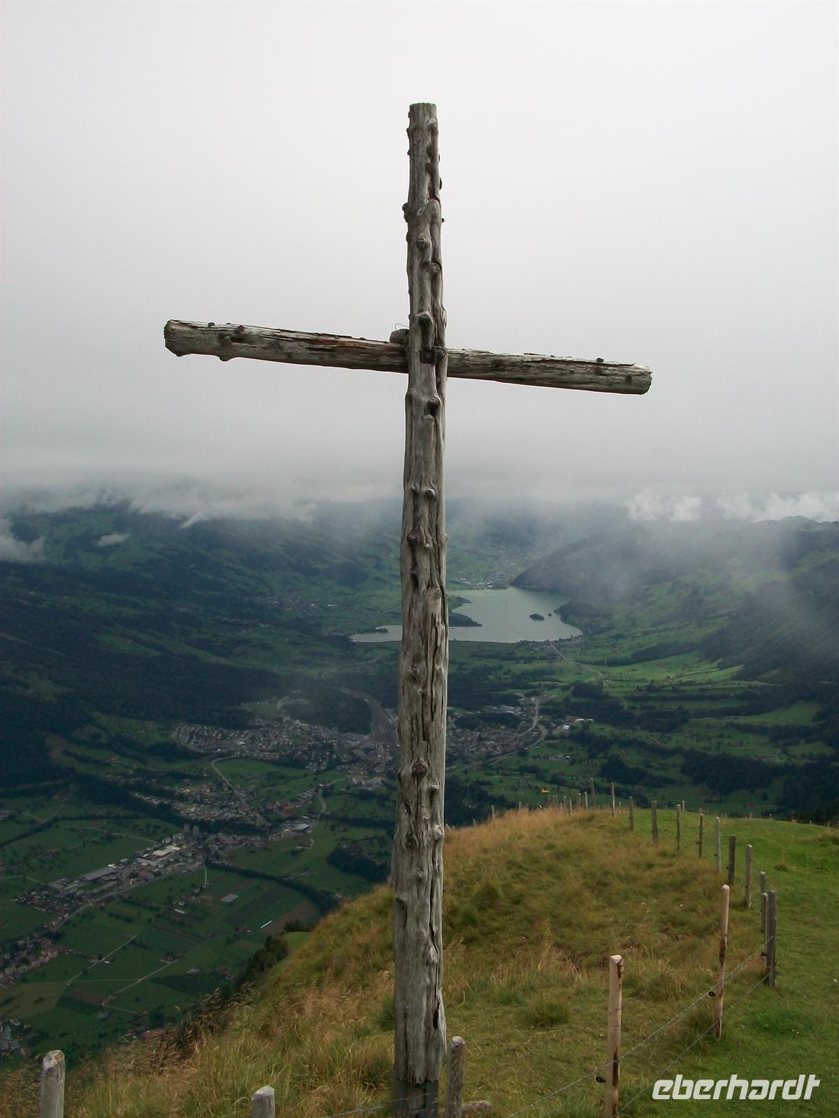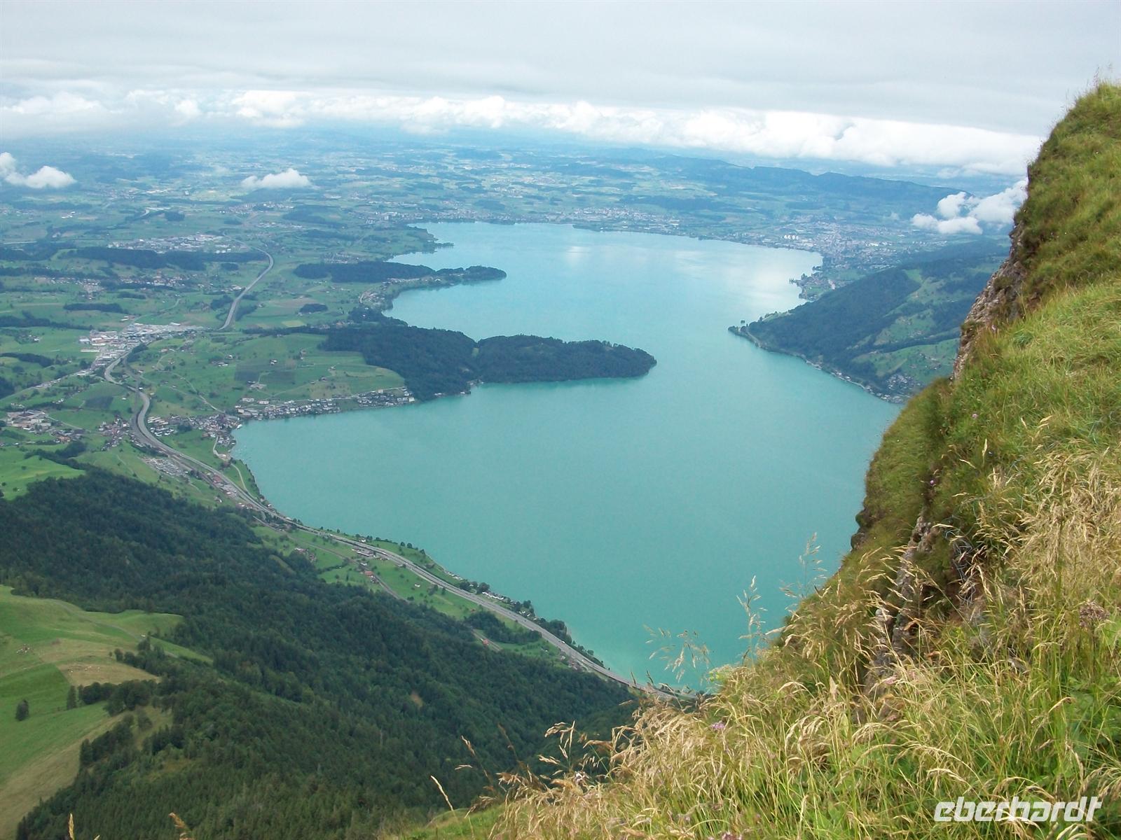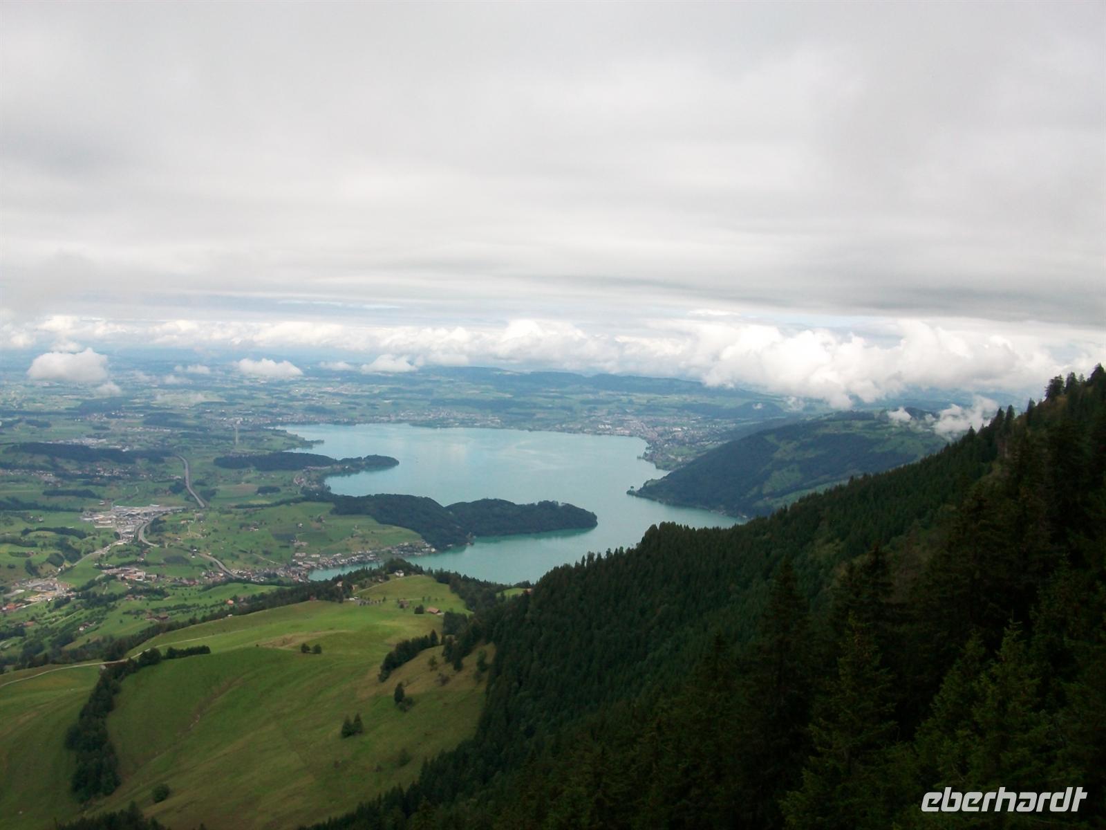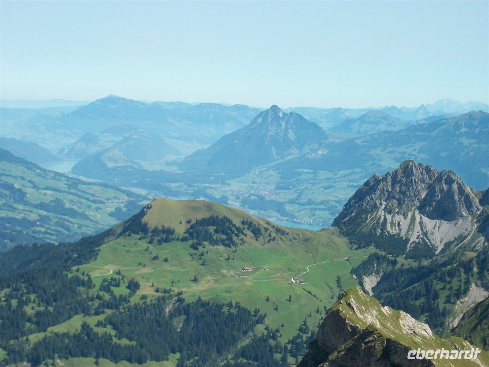Der Weg führt hinauf in Richtung Sendeturm und von hier hat man einen wirklich überwältigenden Blick hinunter. Wie im Spielzeugland sind die Orte ausgebreitet, dazwischen die Seen und wenn auch in den Wolken, die Erhebungen rund um den Vierwaldstätter See sind gut zu sehen. Im Süden thront das mächtige Gotthardmassiv von dort geht es in die Sonnenstube der Schweiz, ins Tessin. Die Eindrücke dieses königlichen Berges sind wirklich grandios, viel Prominenz hat sich in