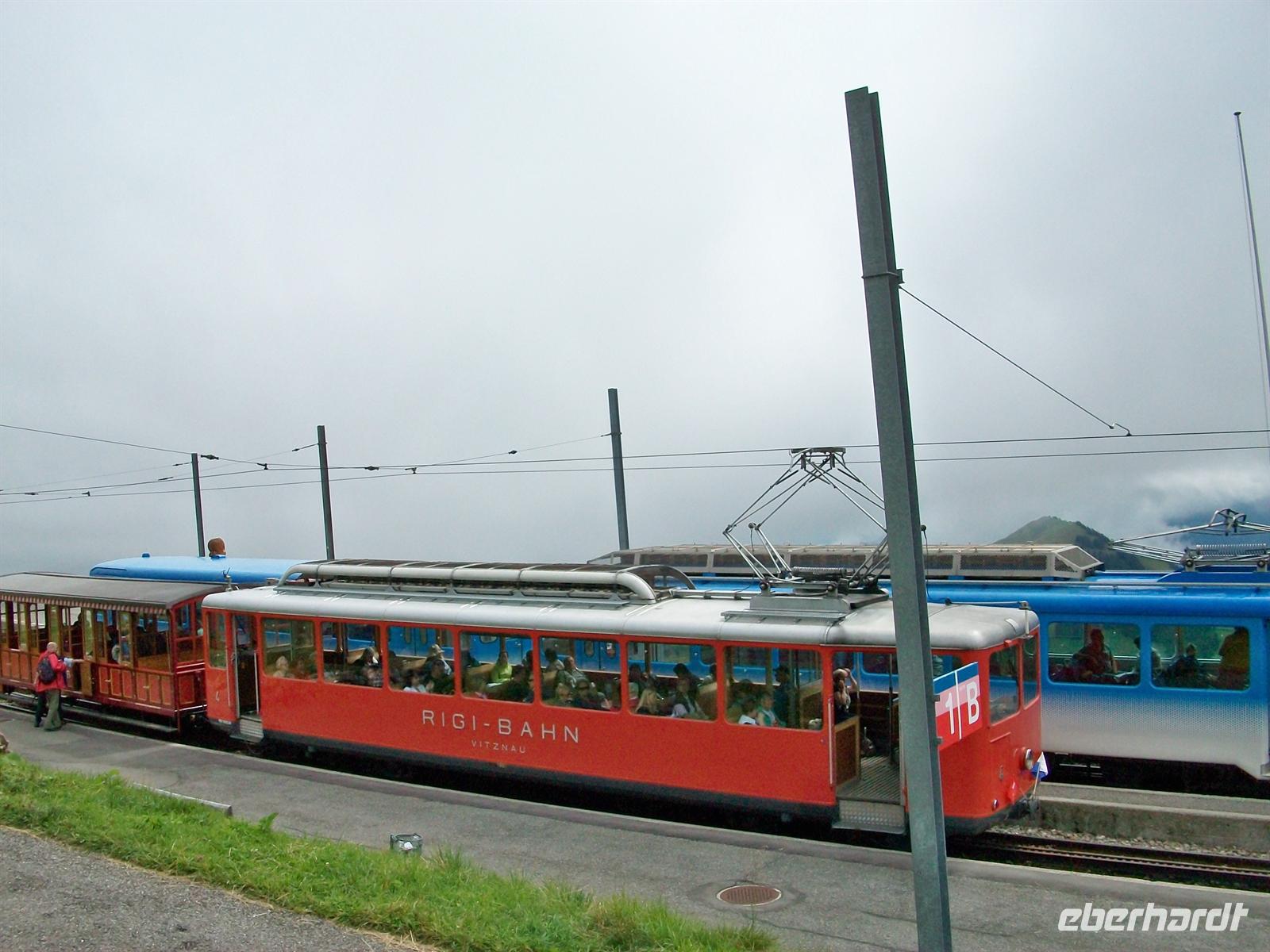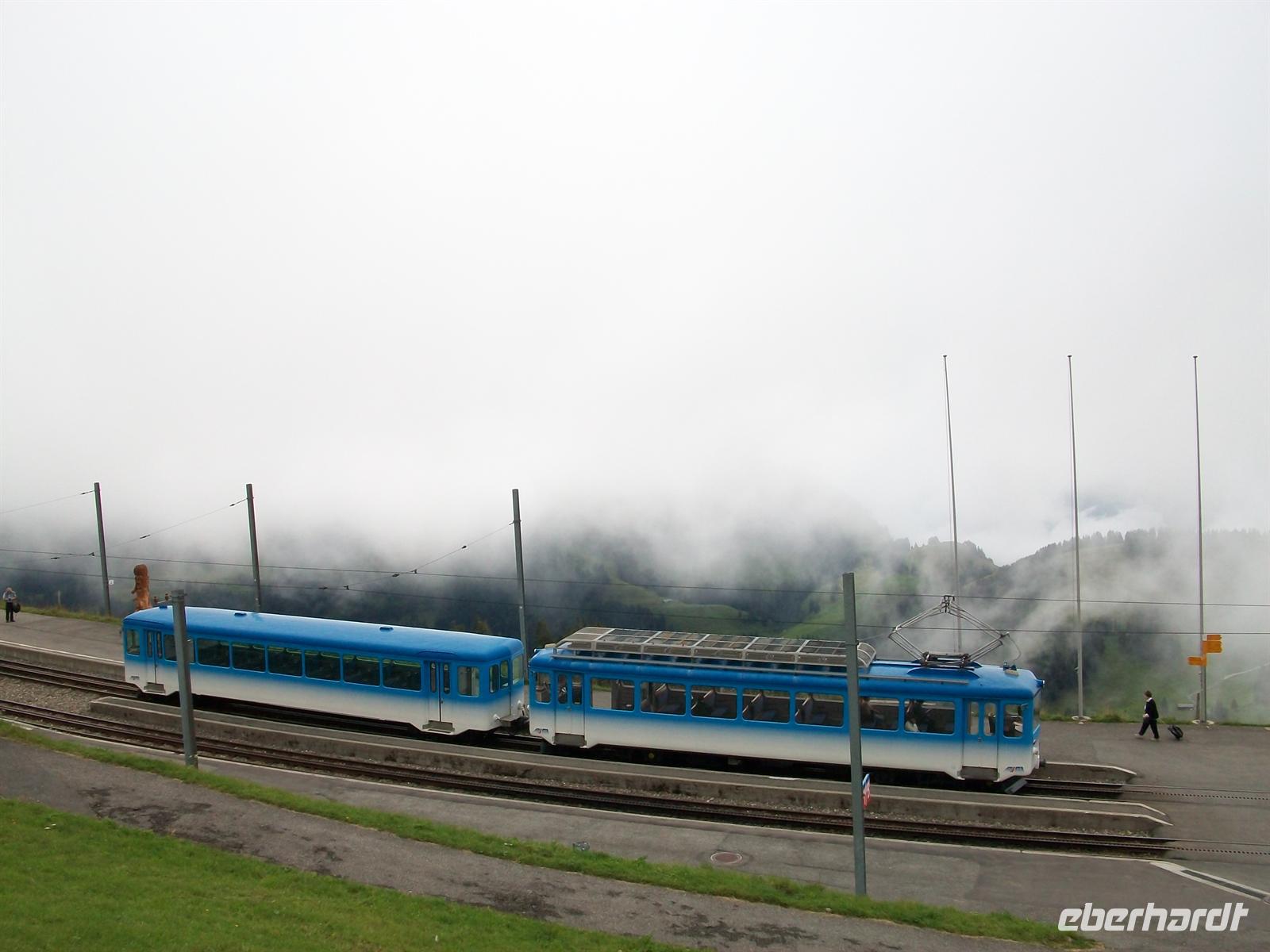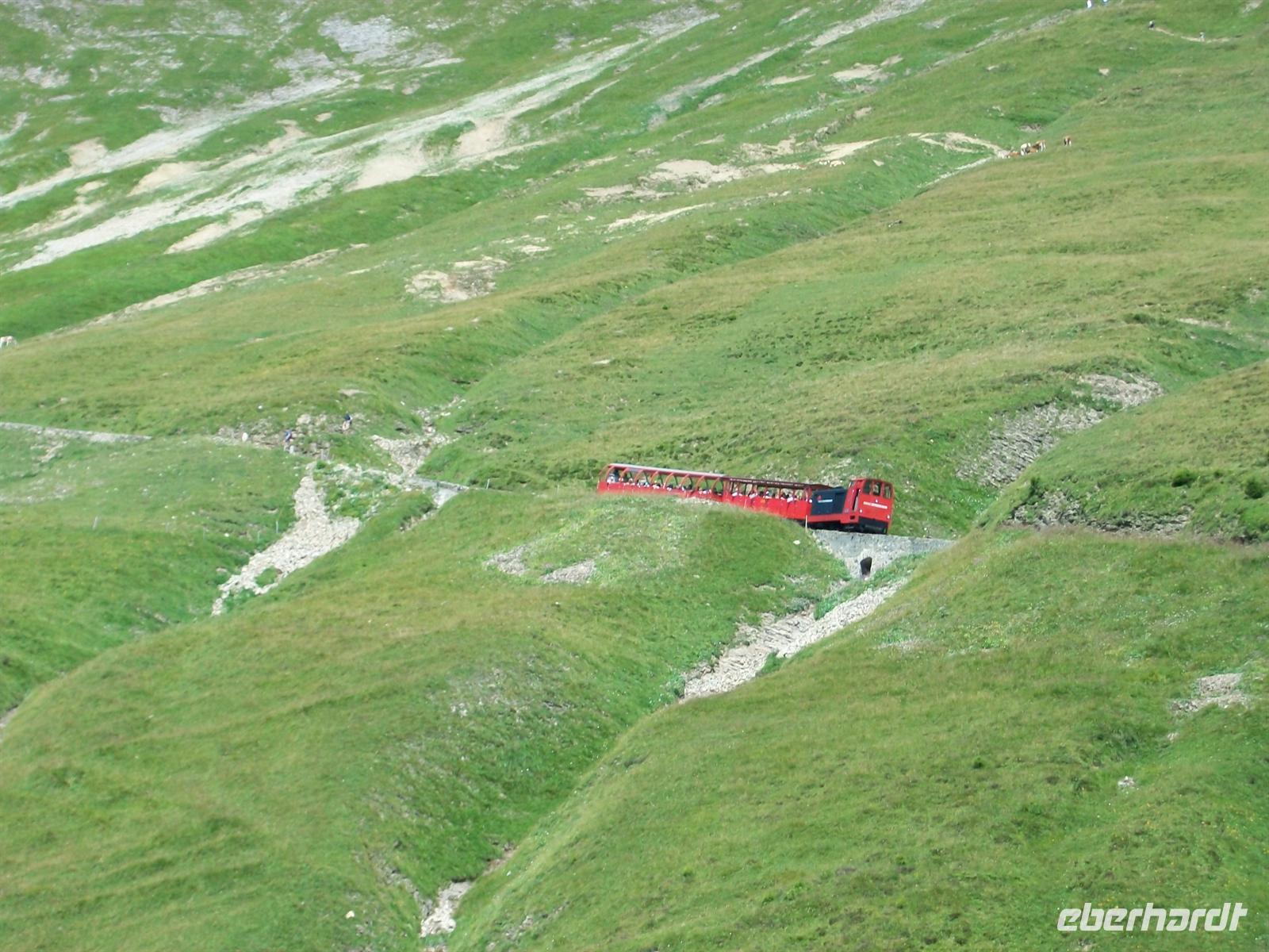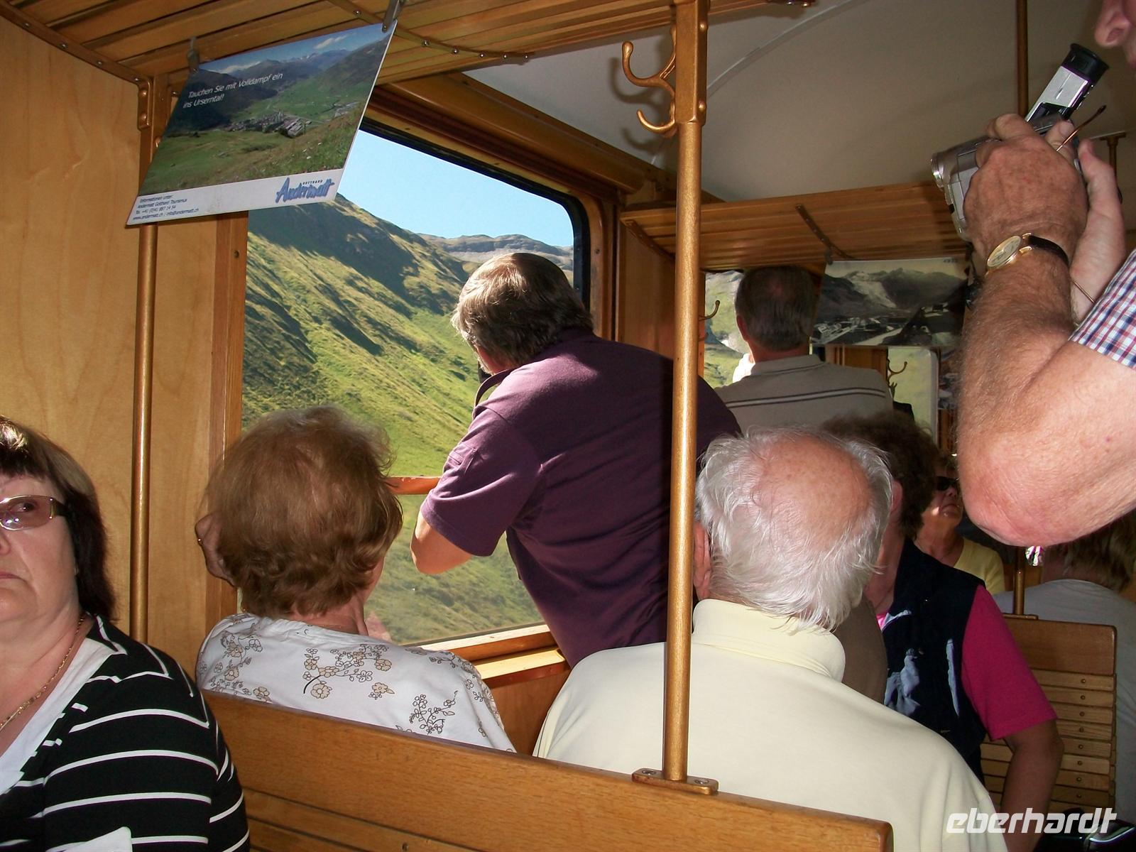 Leicht ruckelnd geht es immer bergauf- bald haben wir die Baumgrenze überschritten und sind nun zwischen den saftig grünen Bergwiesen unterwegs. Wir sehen vor uns einen anderen Zug, wie er sich hinaufschlängelt, begleitet von den ungläubigen Blicken der zahlreichen Kühe die hier weiden. Bald verschwindet dieser Zug vor uns im Kehrtunnel in den wir einige Minuten später auch eintauchen; von hier sind es noch einige Serpentinen und dann sind wir nach gut einstündiger Fahrt oben angelangt.