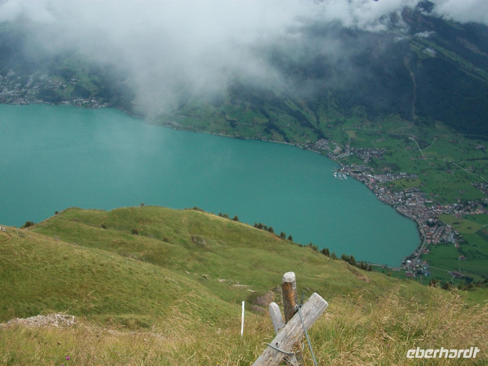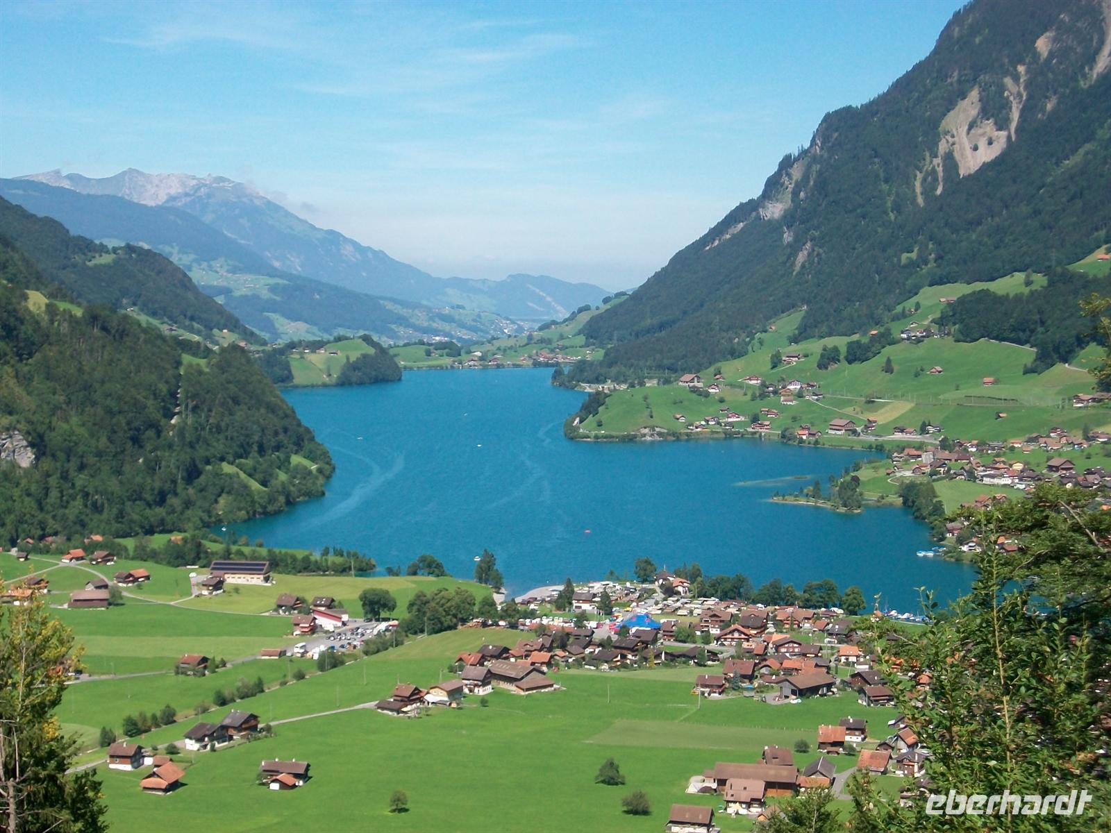 Die Fahrt geht bald weiter und schon an diesem Tag sehen wir einen sehr reizvollen Teil der Schweiz. Vorbei an Bad Ragaz wo Heidi einst lebte, kommen wir bald am ersten Gebirgssee vorbei, es ist der Walensee. Zwischen schroff ansteigenden Bergen liegt er eingebettet wie ein Fjord; hoch über dem Wasserspeigel verläuft unsere Fahrt, im Wasser spiegeln sich die beindruckenden Spitzen der Churfirsten wider.
