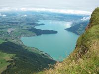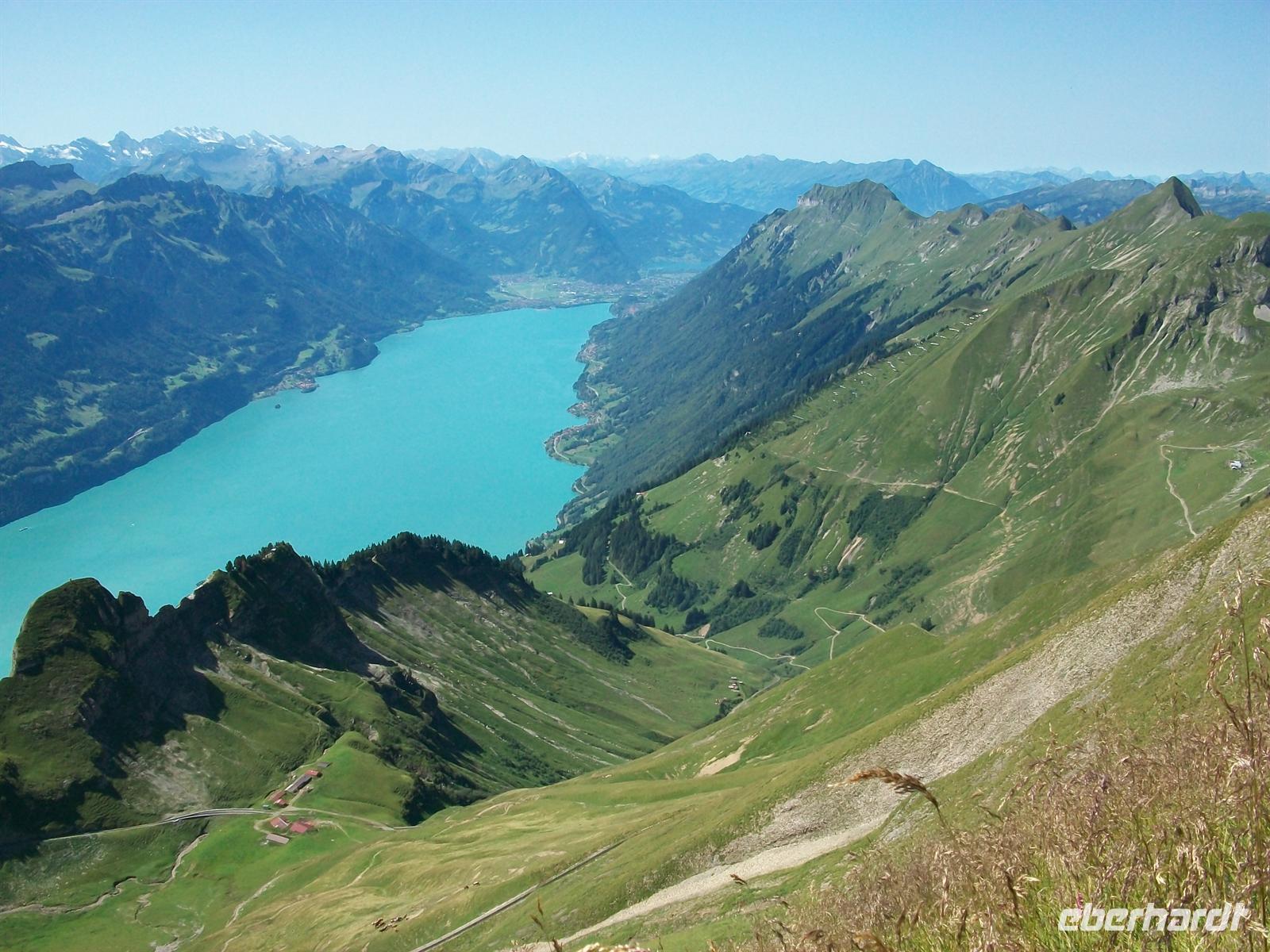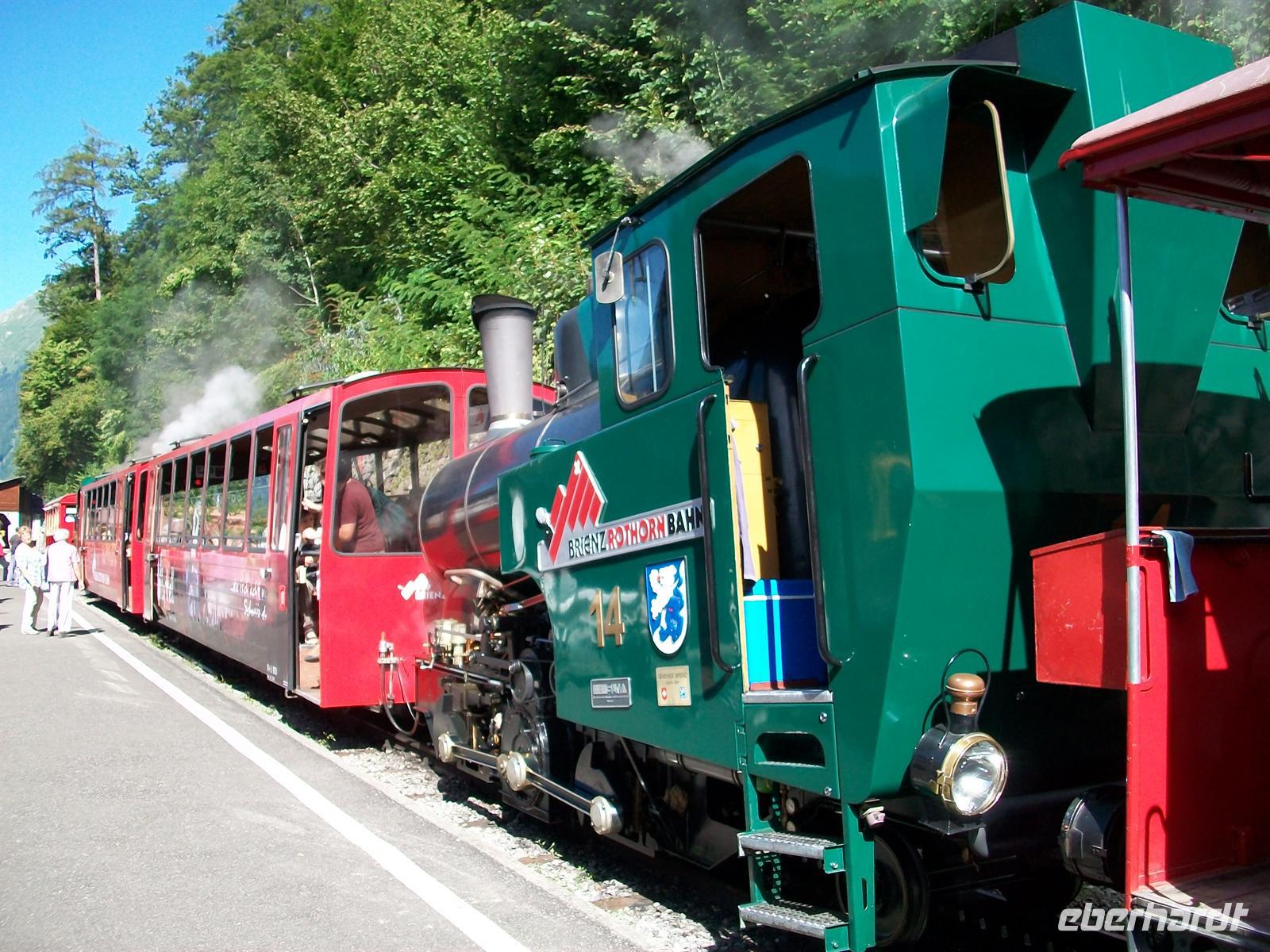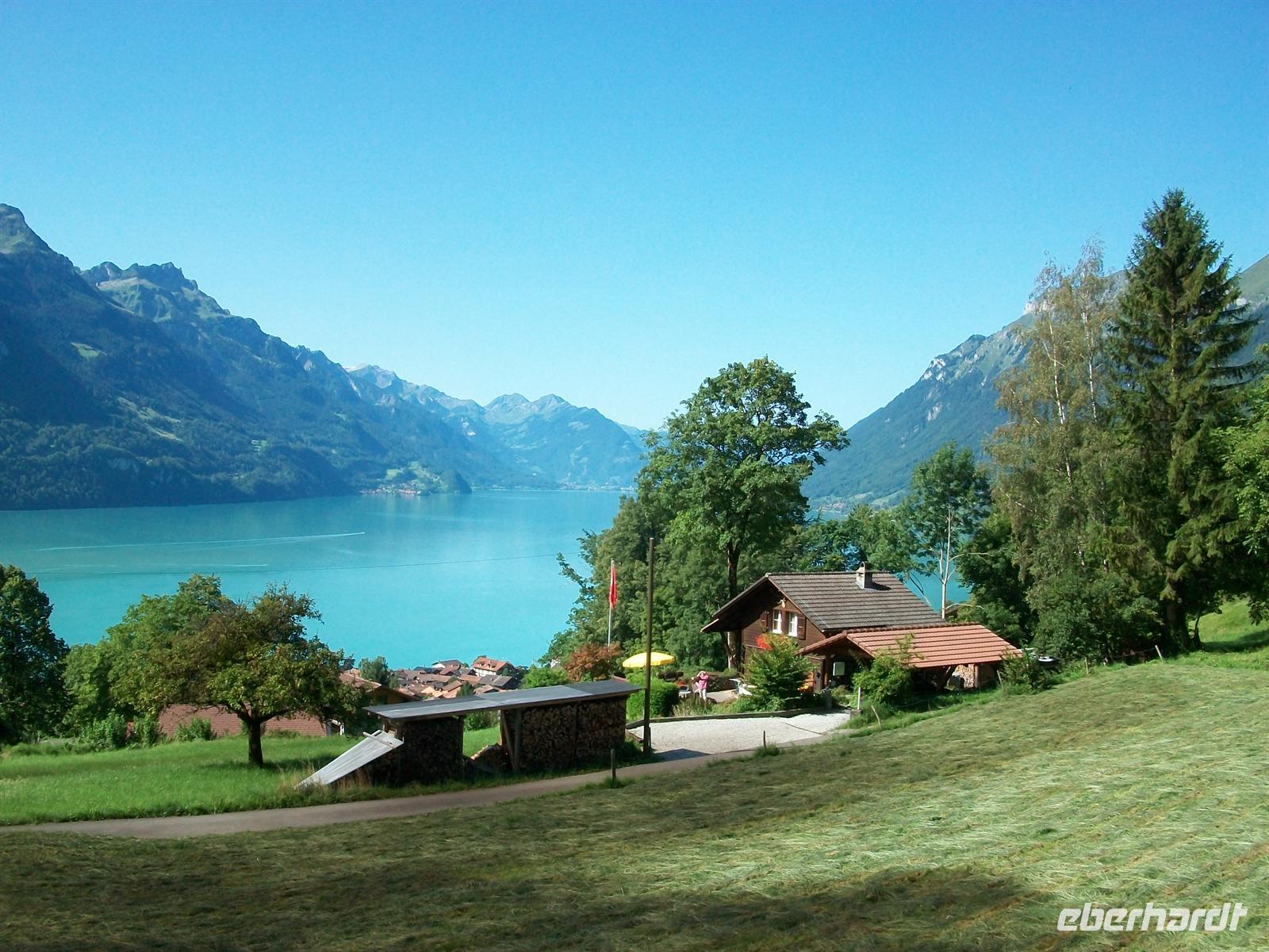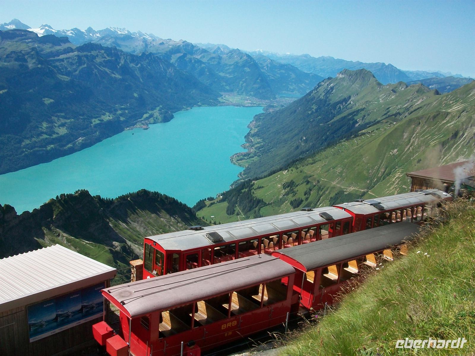 Auch wenn für unsere Gäste genügend Zeit für Erkundungen bleibt, der Abschied fällt doch etwas schwer als wir gegen halb zwei die Talfahrt antreten müssen. Langsam zuckelnd geht es wieder hinunter, tief unter uns ist bald die große Wasserfläche des Brienzer Sees zu sehen, ein Boot klein wie ein Spielzeug, ist nach Interlaken unterwegs und zieht einen Streifen von Kielwasser hinter sich her.