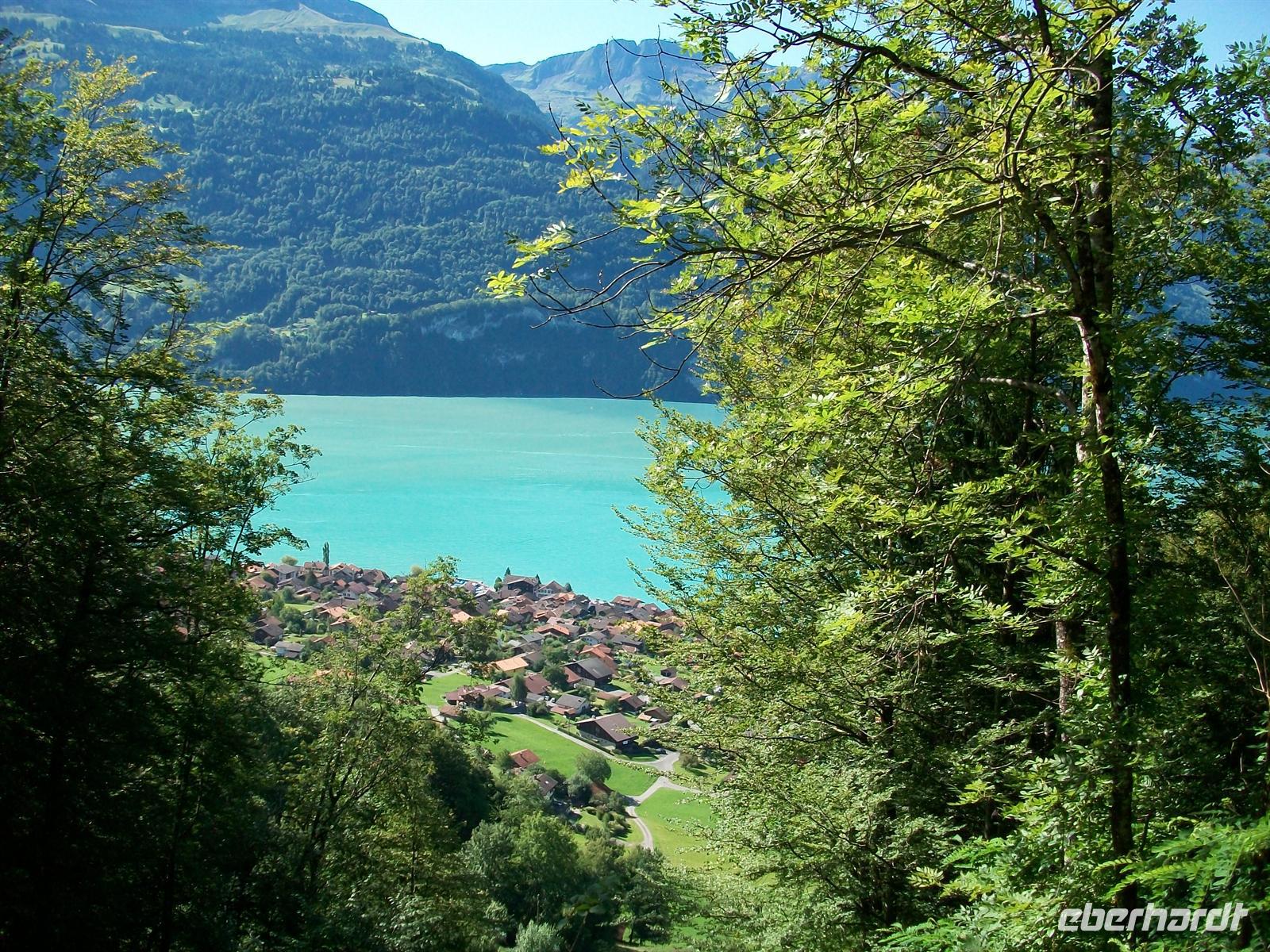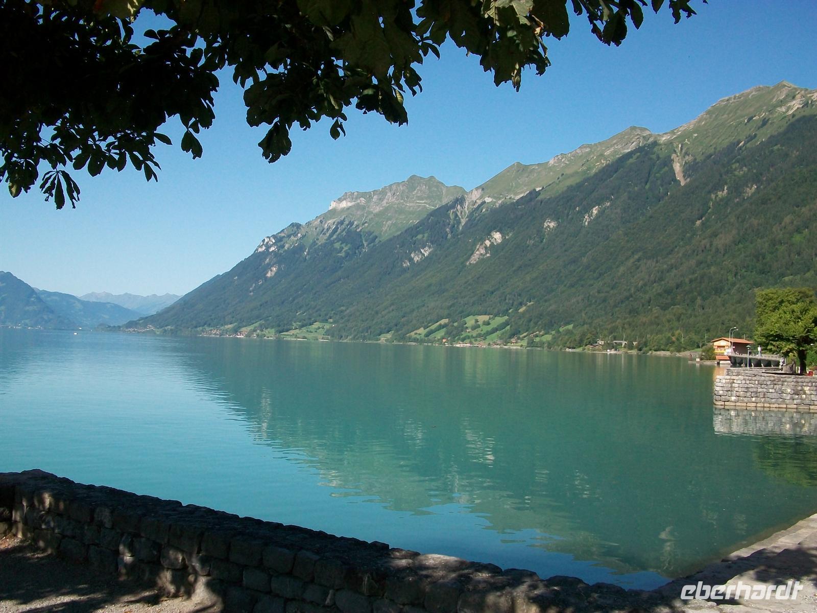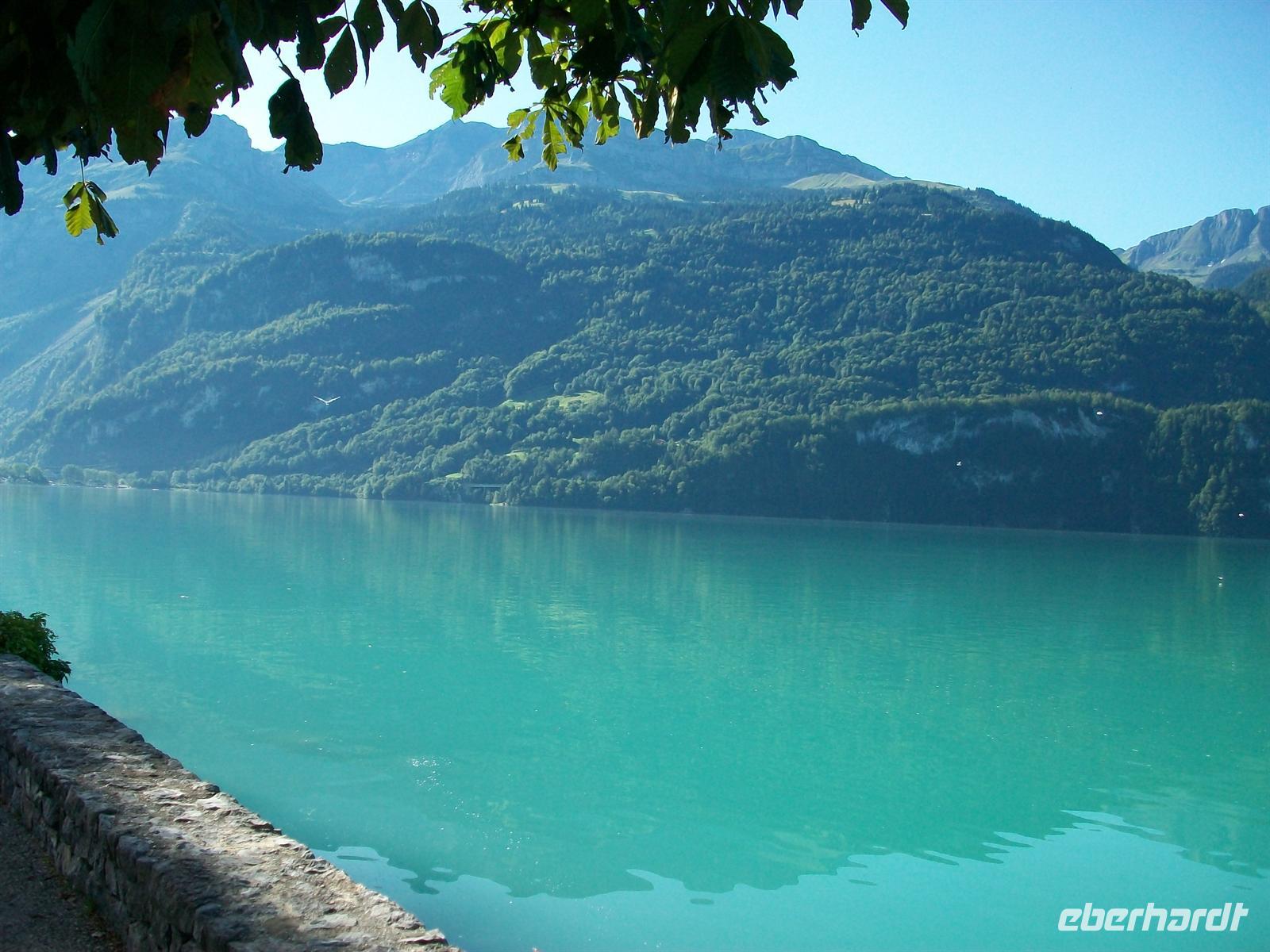 19.8.2012. Die Straße senkt sich ab und der Blick wird frei auf das Tal der Aare. Der grünlich schimmernde Fluss der vom Grimselpass kommt beschreibt hier einen Bogen und mündet in den See ein zu dem uns unsere heutige Fahrt führt. Es ist der Brienzer See, bekannt durch seine schöne Lage und den Ort den wir zuerst besuchen werden.