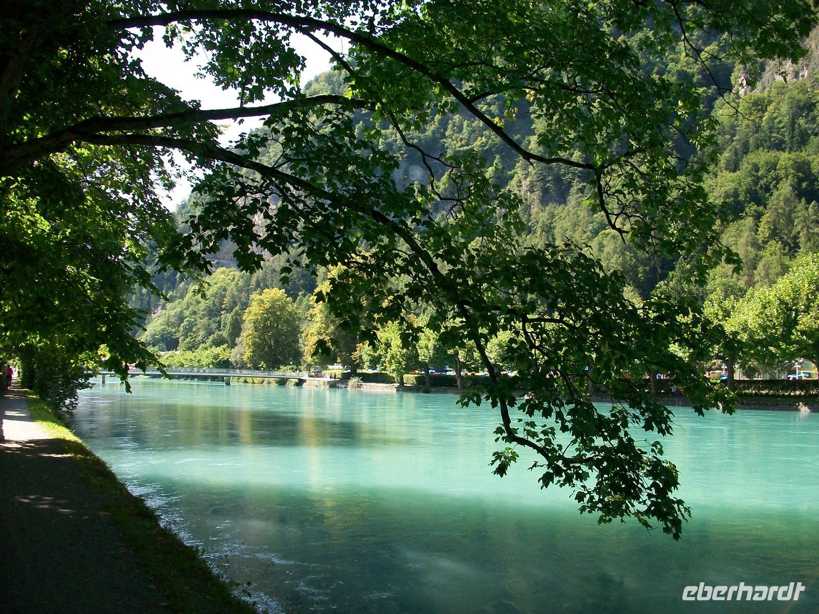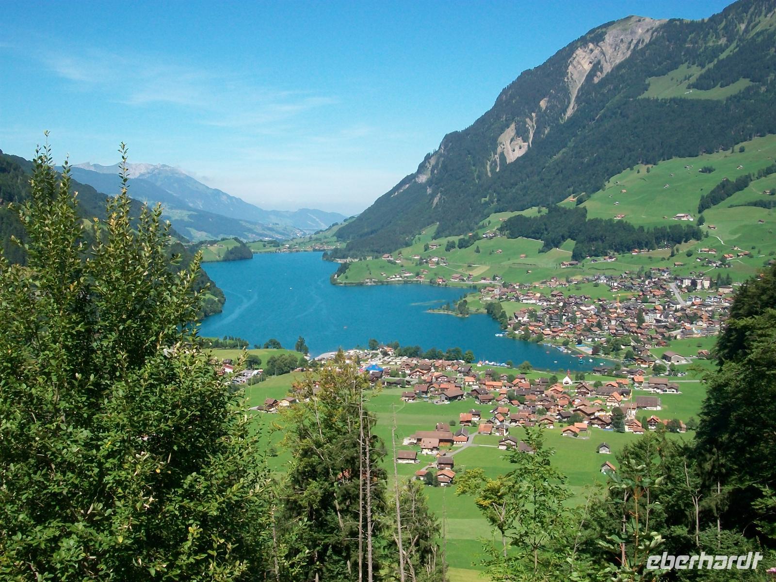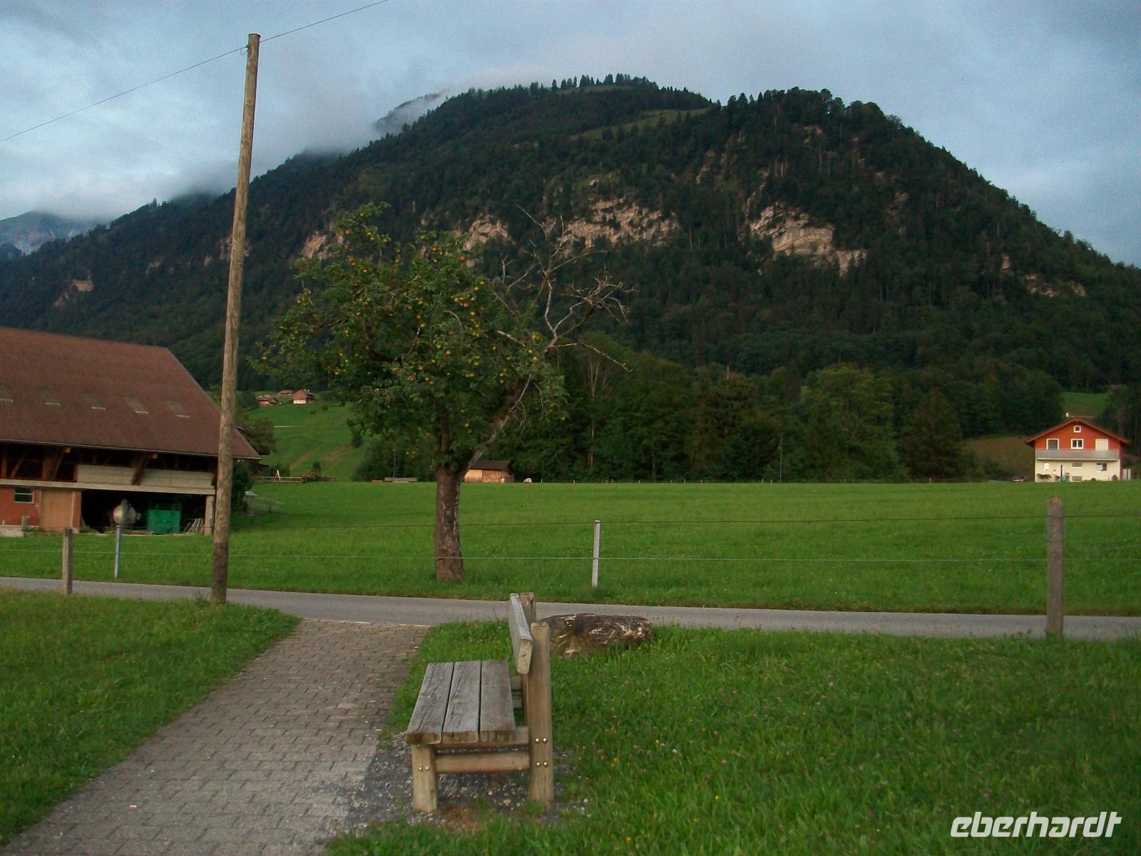 19.8.2012. Die Straße senkt sich ab und der Blick wird frei auf das Tal der Aare. Der grünlich schimmernde Fluss der vom Grimselpass kommt beschreibt hier einen Bogen und mündet in den See ein zu dem uns unsere heutige Fahrt führt. Es ist der Brienzer See, bekannt durch seine schöne Lage und den Ort den wir zuerst besuchen werden.