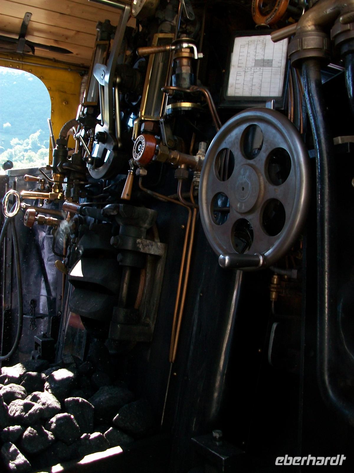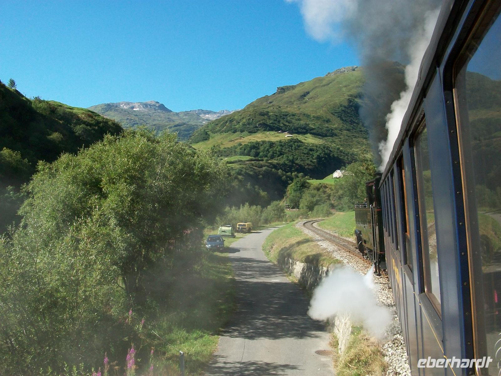 Es ist noch Zeit für einen Kaffee und einem Abstecher im Ort; pünktlich zur Abfahrt sind aber alle Reisegäste angekommen und haben im reservierten Wagen Platz genommen. Die Zeit der Abfahrt rückt näher und genau 10.15 Uhr zückt der Fahrdienstleiter seine Pfeife, der Zug ruckt an und die Fahrt geht los. Die Dampflok prustet und schnauft, die Schornsteine stoßen dunklen Rauch aus und wir haben auf den etwas harten Holzbänken des 19. Jahrhunderts Platz gefunden. Dann müssen wir schnell die Fenster und Türen schließen, die ersten Tunnel nahen und wir fahren mit Dampf! Dennoch dringt der Rauch durch die Ritzen hinein, der typische Geruch der Dampfbahn macht sich breit und als das Tunnelende naht ist es schön die frische Luft von draußen herein zu lassen. Wir fahren entlang eines schönen Tales, der Blick geht nach oben zu den kahlen Bergspitzen und überall ist die schöne Vegetation der Alpenflora zu sehen die zahlreiche Farbtupfer von Blumen vor unseren Blicken ausgebreitet hat. Gemächlich wie zu Uromas Zeiten geht es bergauf, die Lok hat mächtig zu arbeiten und zieht dabei einen langen Schweif dunklen Rauchs hinter sich her.