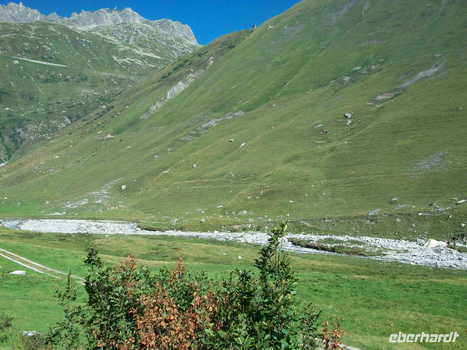 gewonnen. Bald sind wir im Kanton Uri angelangt und erreichen auch hiermit den letzten Zipfel des Vierwaldstätter Sees. Bald treten die Berge ganz nah an die Straße heran, wir sind in der geheimnisvollen Schöllenenschlucht unterwegs. Die Berge verwehren den Sonnenstrahlen den Weg ins Tal, im düsteren und geheimnisvollen Zwielicht des Morgens geht es bergauf, vorbei an der Teufelsbrücke und mehreren Wasserfällen weitet sich das Tal bei Andermatt und die Sonne bekommt wieder ihre Chance. Als wir in Realp anlangen hat sich über uns ein strahlend blauer Himmel ausgebreitet und die Sonne gibt sich heute richtige Mühe ihr Wegbleiben von gestern wieder gut zu machen.