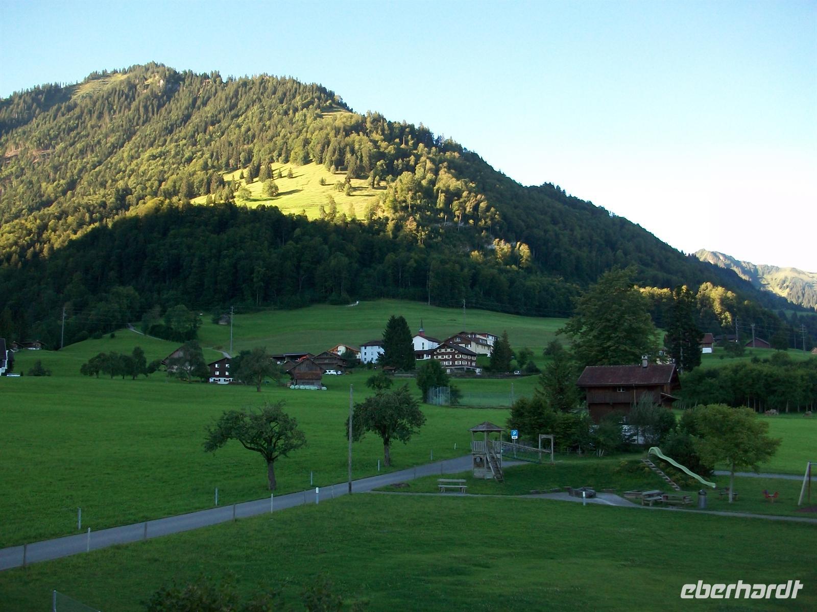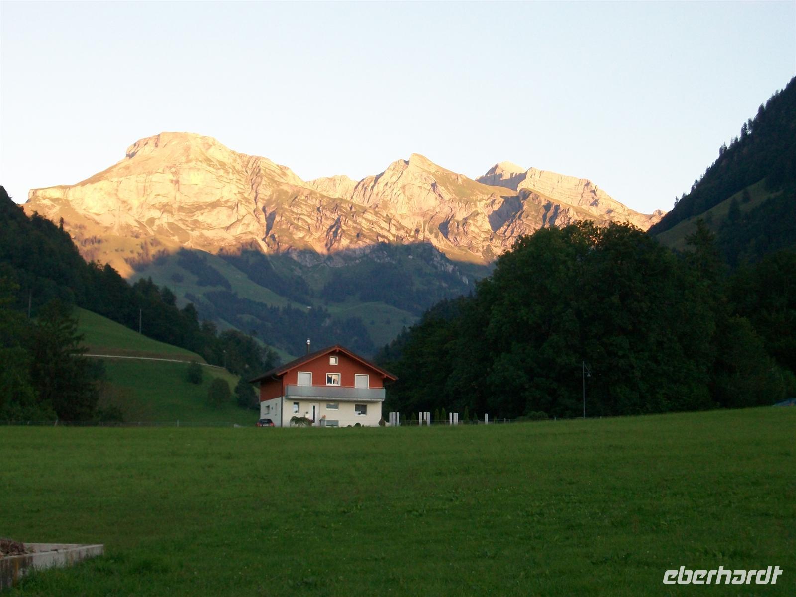 Nach diesem angenehmen Ruhepunkt dieses Tages treffen wir uns alle am Schwanenplatz wieder und eine gute halbe Stunde kommen wir oben in Flüeli Ranft an wo es nicht so heiß ist, ein kühles Lüftchen sorgt hier für etwas Abkühlung. Später, nach dem Abendessen, genießen wir noch den malerischen Blick von der Terrasse des Hotels in Richtung der Berge, kurz vor Sonnenuntergang können wir an den Bergen im Melchtal noch ein schönes Alpenglühen sehen. Lassen wir den schönen Tag mit diesen Impressionen ausklingen und freuen wir uns auf morgen!