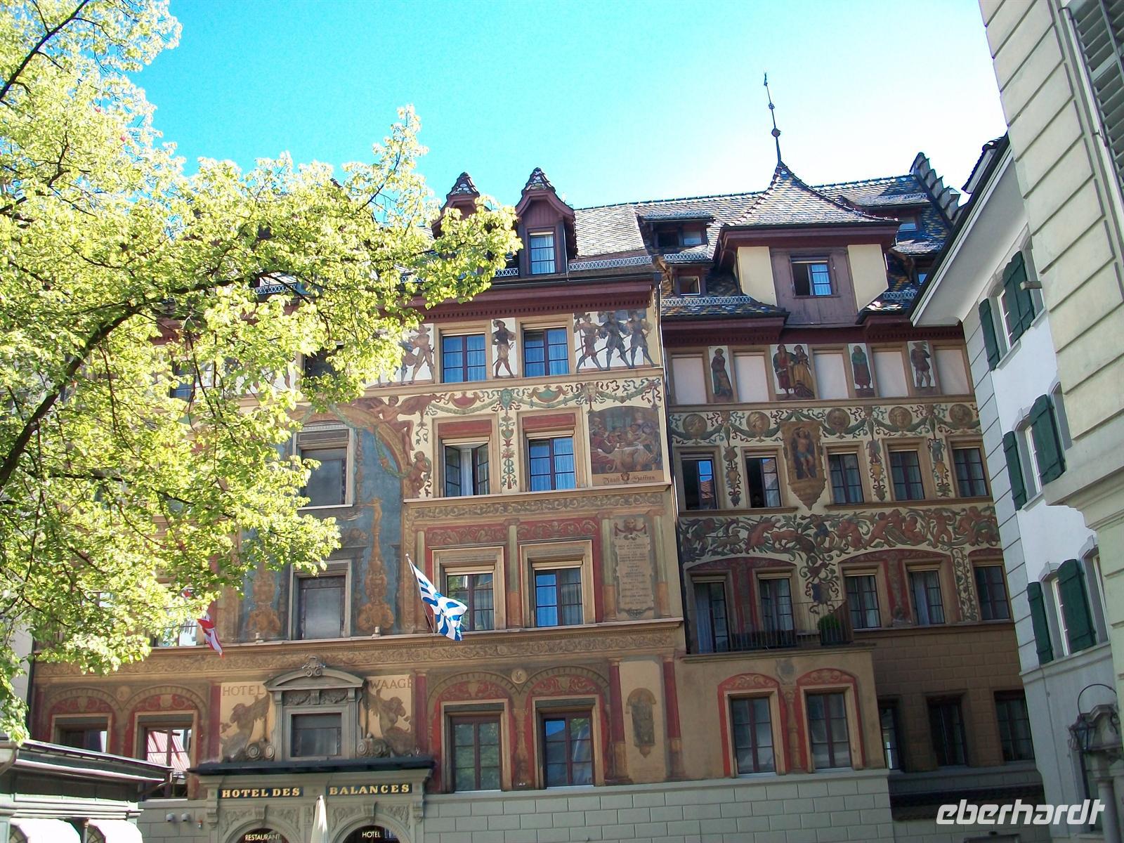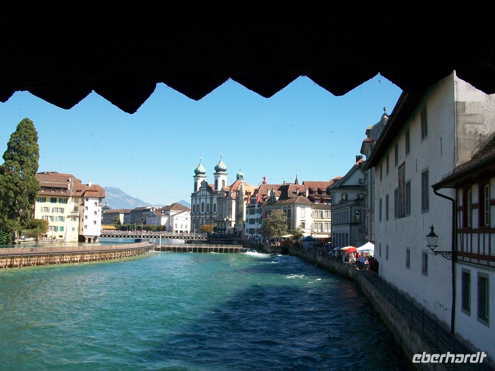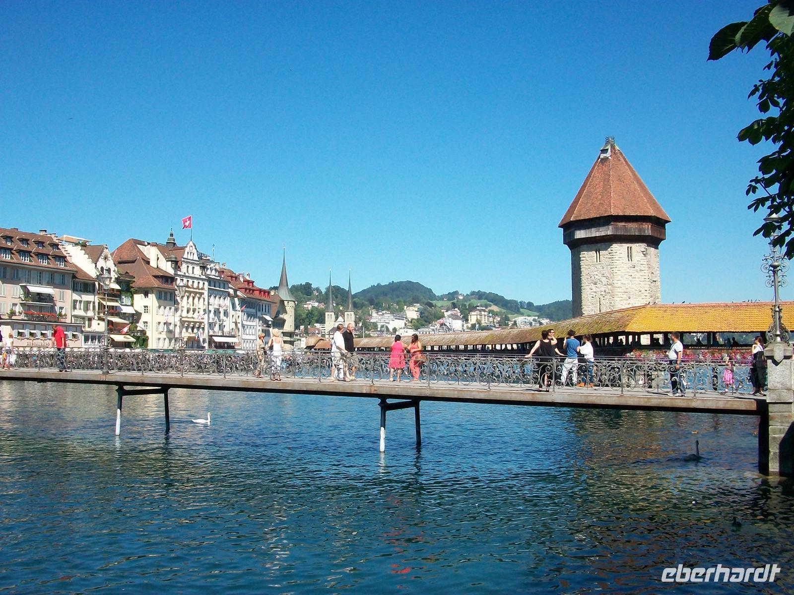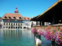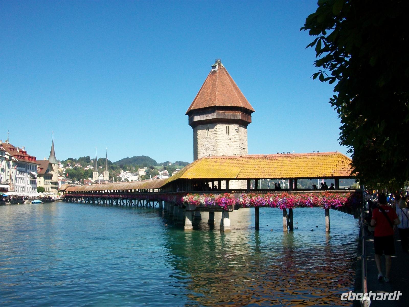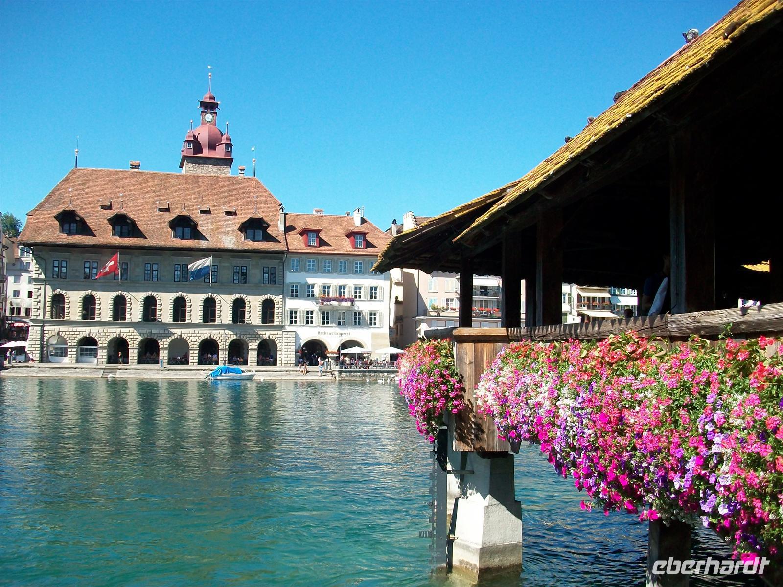 Gemächlich fahren wir mit diesem kleinen Zug durch die Fußgängerzone, dabei bekommen wir wissenswerte Erklärungen über kleine Kopfhörer. Luzern hat eine lange und interessante Geschichte aufzuweisen und hinter den gepflegten Fassaden der schönen Bürgerhäuser verbirgt sich so manches Geheimnis. Dann überqueren wir die Rheuss und sehen links die hölzerne Spreuerbrücke. In ihrem Dachstuhl befindet sich ein etwas morbider Totentanzzyklus der im Anschluss von unseren Gästen besucht werden kann. Etwas später sind wir dann in ganz engen Gässchen unterwegs um gleich darauf im Trubel des Hauptbahnhofs das moderne Luzern zu erkunden. Dann geht es erneut über den Fluss und von hier ist der Blick auf die blumengeschmückte Kapellbrücke besonders schön.