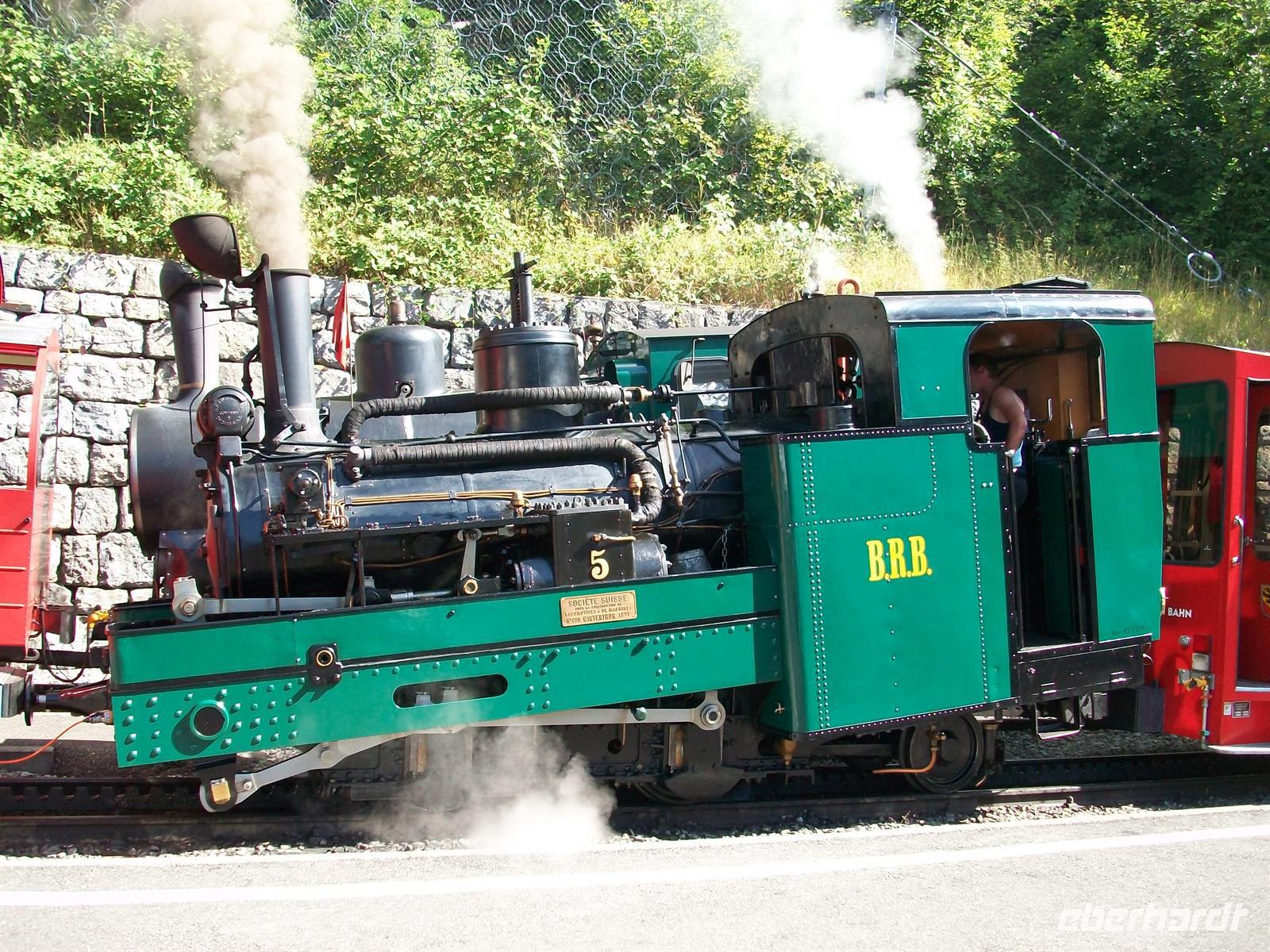 Kurz nach halb elf hat sich unsere Reisegruppe an der Talstation der Rothornbahn versammelt. Der Zug ist schon zusammengestellt der uns nun hinauf bringen wird. Mächtig dampfen die Schornsteine der Lok, der typische Geruch kitzelt unsere Nasen. In einem historischen Wagen haben wir Platz genommen, die Lok stößt einen schrillen Pfiff aus und mit einem Ruck geht die gemächliche Fahrt hinauf. Diese Bahn führt mithilfe der Zahnstange immer bergauf; zuerst durch Wiesen und malerischen Häusern entlang, dann kommt der erste Tunnel. Das schnaubende Geräusch der Lok wird von den Tunnelwänden zurückgeworfen und als es ganz dunkel wird sehen wir stiebende Funken, sie werden von den Schornsteinen der Lok ausgestoßen, prallen an den