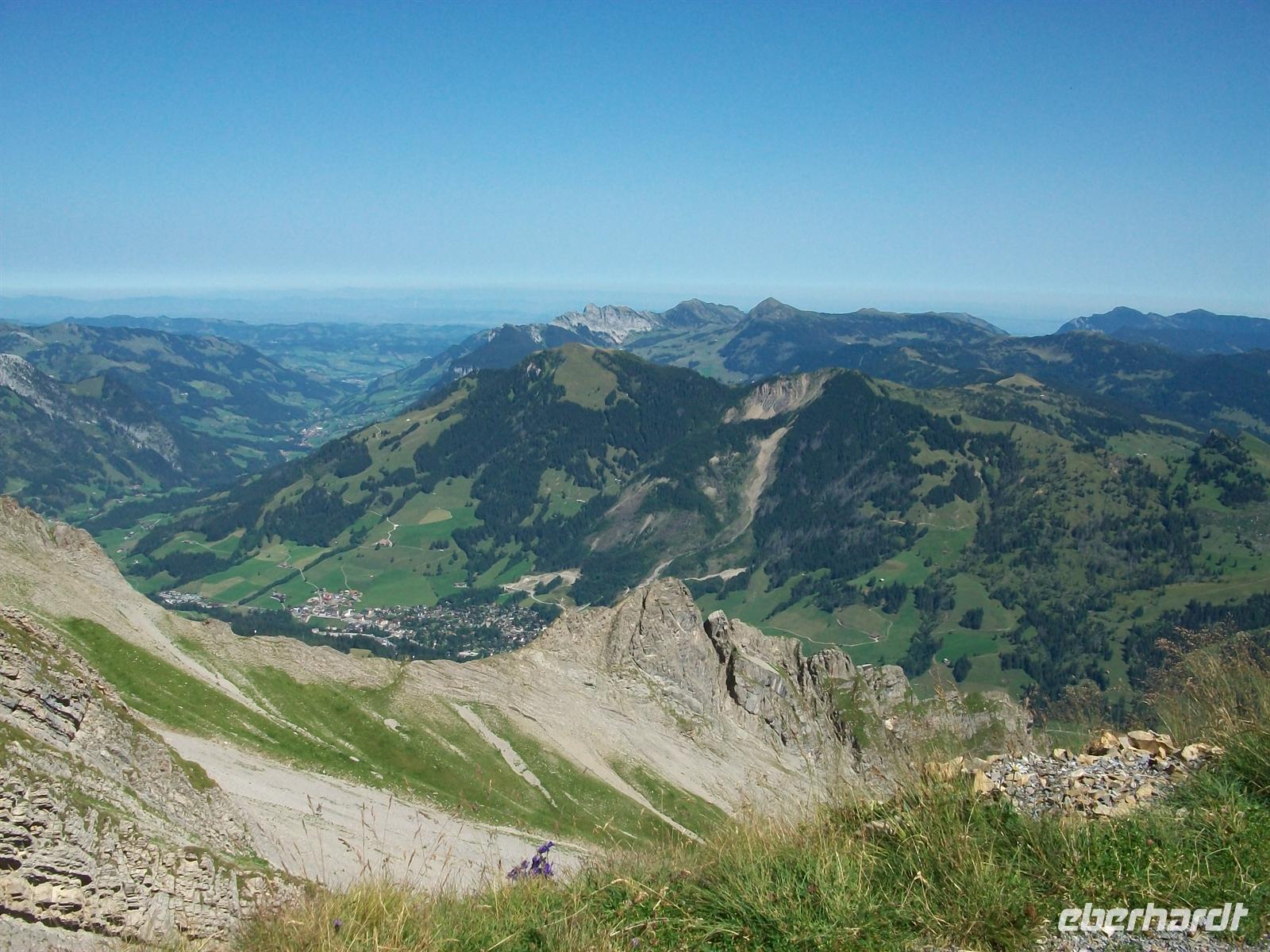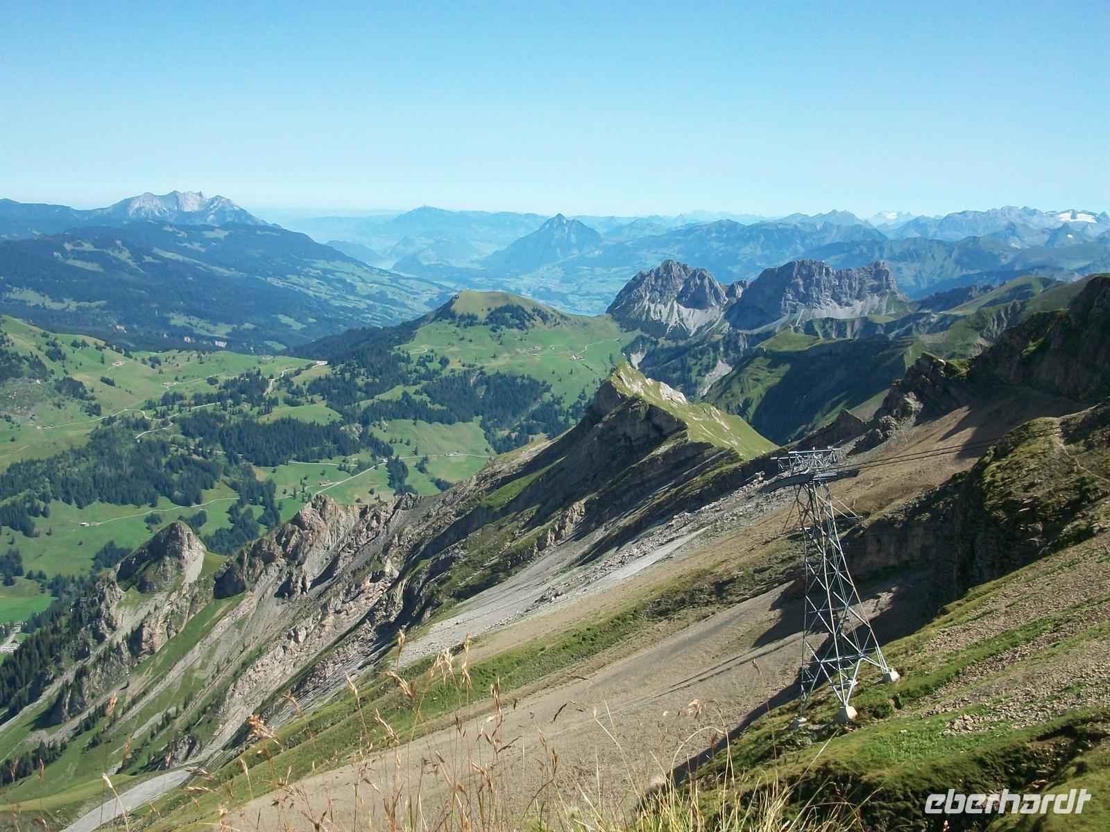 Was sich hier oben, in über 2 000 Metern unserem Auge darbietet ist einfach nicht zu beschreiben. Kein Wölkchen trübt den blauen Himmel von dem eine Sonne herablacht und uns selbst in dieser Höhe mit ihren Strahlen erwärmt. Vor uns die Erhebungen der Berner Berge, Blickfang sind die im ewigen Eis glitzernden Erhebungen von Eiger, Mönch und Jungfrau und all die anderen Spitzen dieser imposanten Bergkette. Wenn wir zurückblicken sehen wir die Berge bei Luzern, den Pilatus, das Stanserhorn und etwas im Dunst die Rigi- es ist einfach wundervoll und das Auge mag sich kaum satt sehen an dieser grandiosen Bergwelt die in einen leicht blauen Schimmer gehüllt ist.