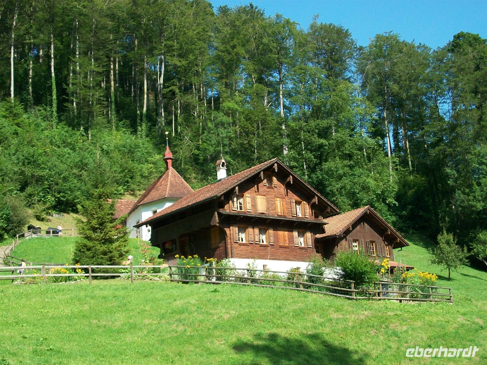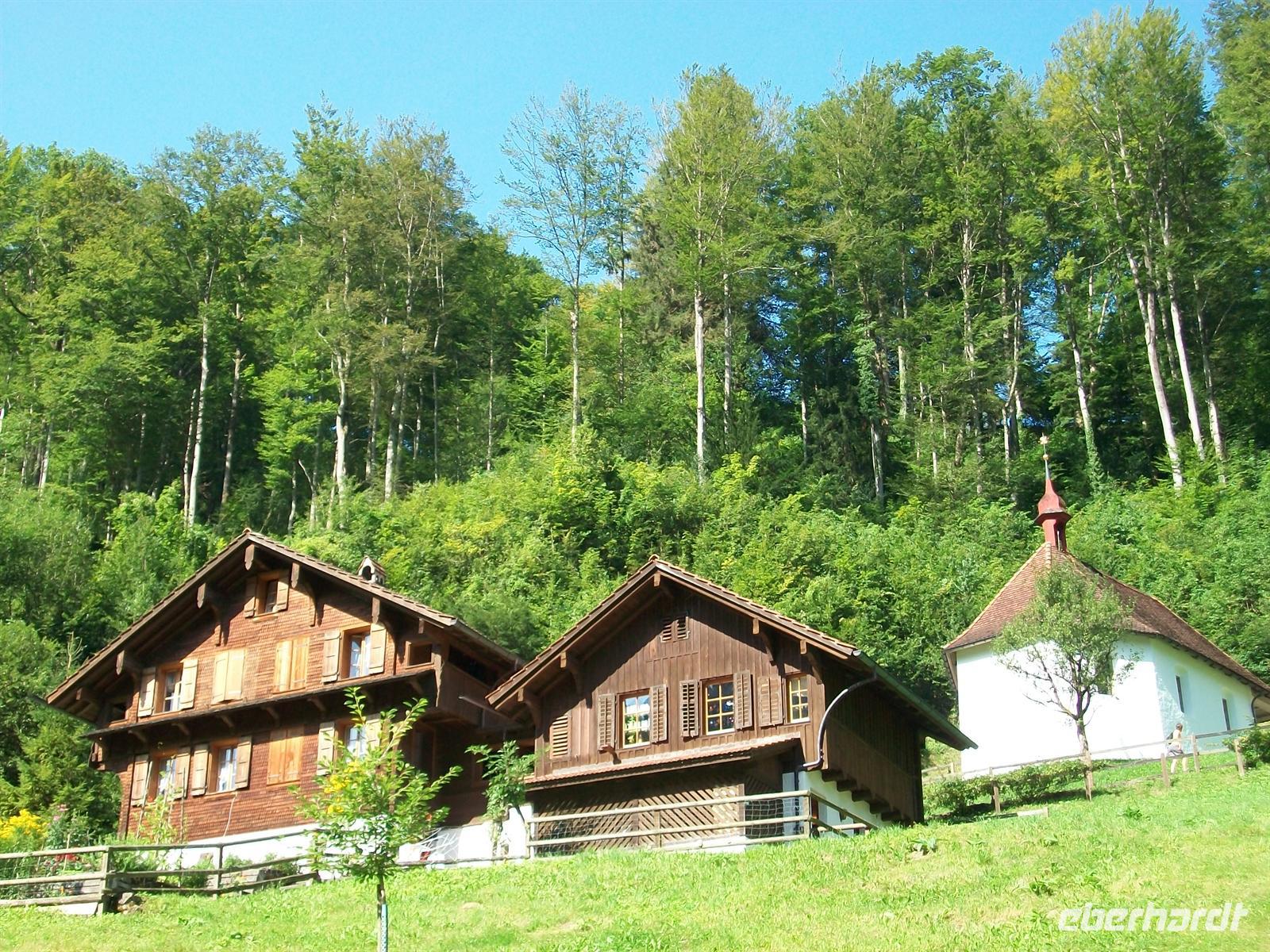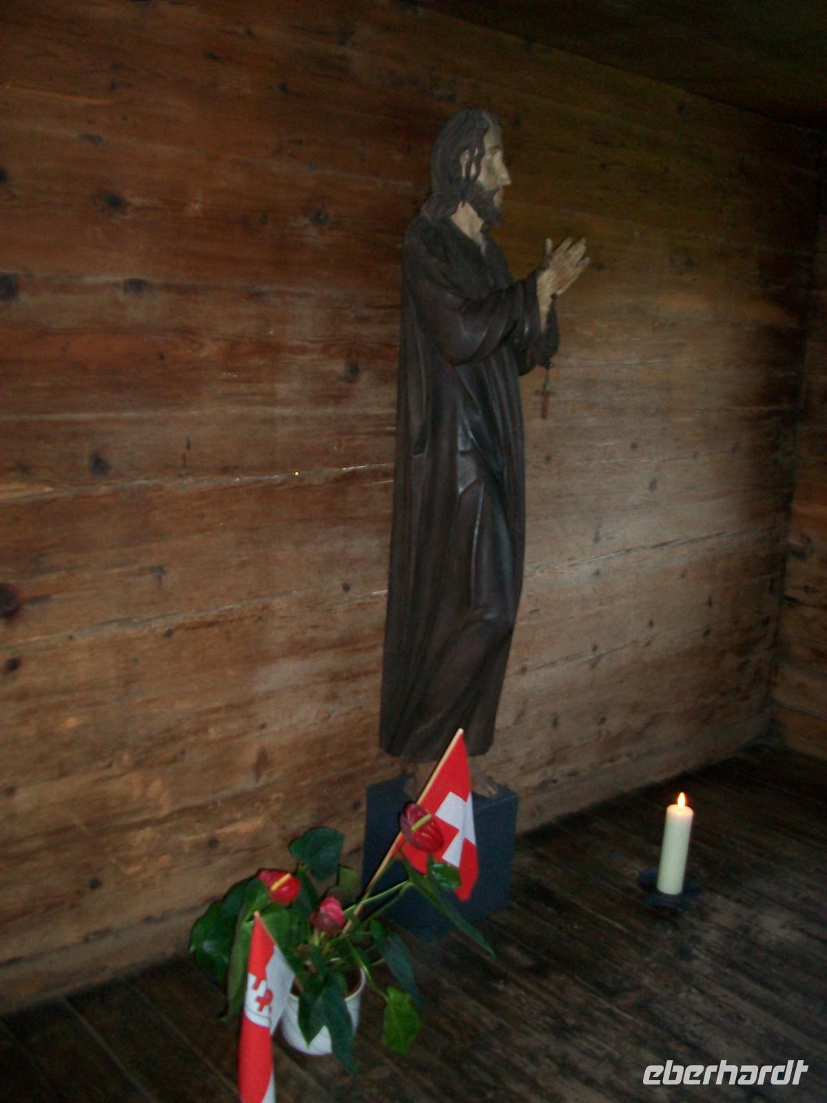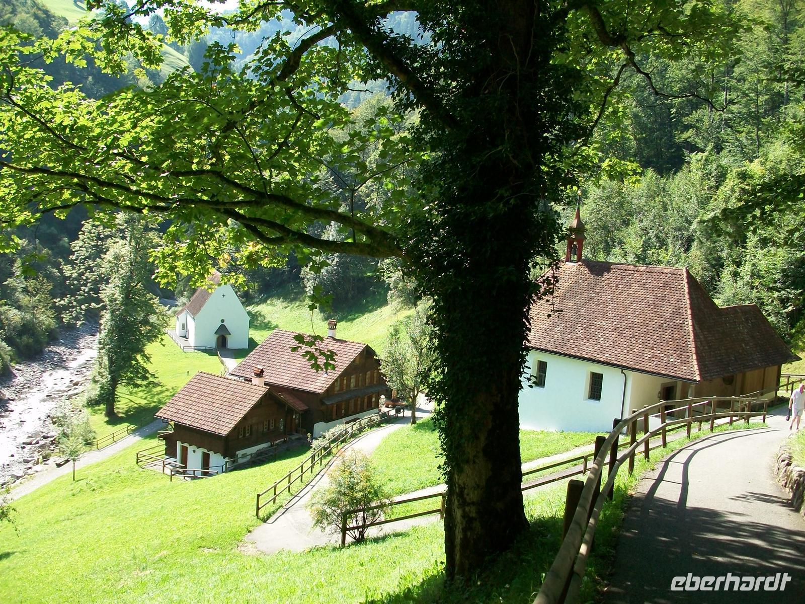 Diese Erzählung berührt uns doch, mit diesem Wissen ausgestattet sind wir nun auf dem Weg den letzten Punkt unserer Wanderung aufzusuchen: die Einsiedelei von Klaus, einfach Ranft genannt. Der Weg führt und abwärts ins Melchtal. Bald sind wir im Schatten der Bäume untergetaucht von unten hören wir das Rauschen des kleinen Flusses und sehen auch die wenigen Gebäude. Die Einsiedelei ist ein einfaches Holzhaus, das Leben von Klaus war ein sehr asketisches. Die letzten zwanzig Jahres seines Lebens verbrachte er hier; wir sehen die kleine Holzöffnung in der Wand von der aus er so manchen guten Rat erteilte und durch seine Empfehlungen gar einen Krieg verhinderte. Diese Einsiedelei ist das Zentrum der Wallfahrer heute und viele haben hier zu Bruder Klaus gebetet. Viele Votivtafeln mit dem Dank an ihn zeugen von seiner Hilfe.