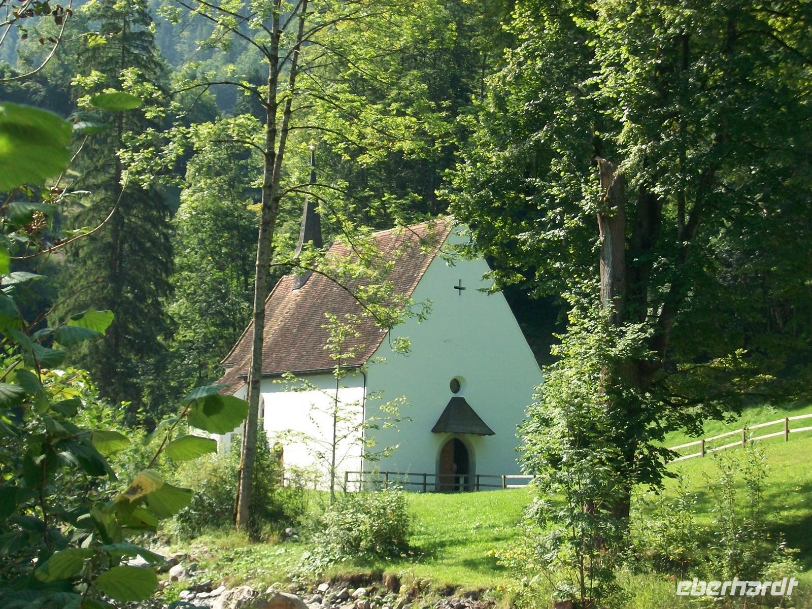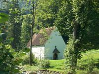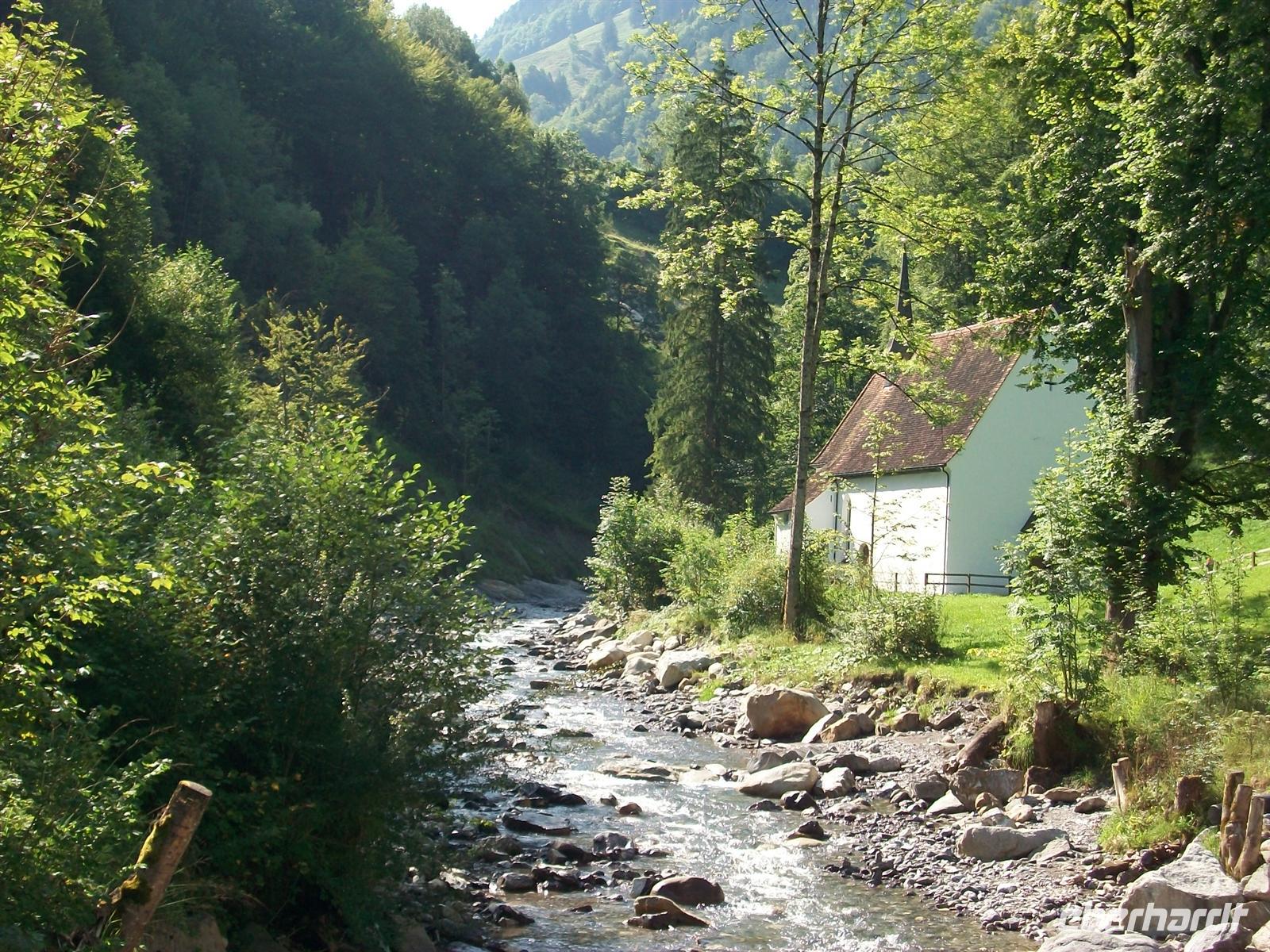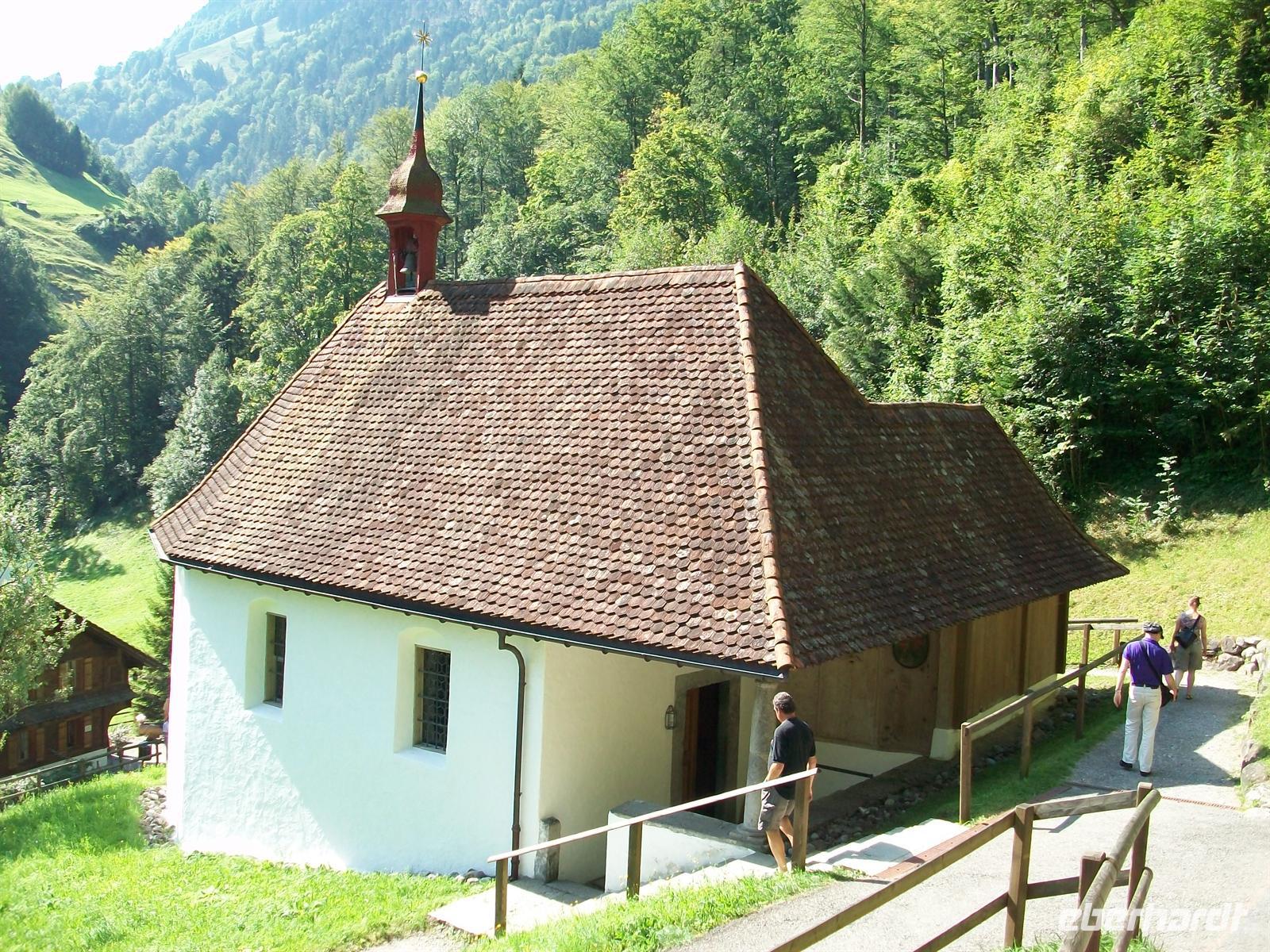 Diese Erzählung berührt uns doch, mit diesem Wissen ausgestattet sind wir nun auf dem Weg den letzten Punkt unserer Wanderung aufzusuchen: die Einsiedelei von Klaus, einfach Ranft genannt. Der Weg führt und abwärts ins Melchtal. Bald sind wir im Schatten der Bäume untergetaucht von unten hören wir das Rauschen des kleinen Flusses und sehen auch die wenigen Gebäude. Die Einsiedelei ist ein einfaches Holzhaus, das Leben von Klaus war ein sehr asketisches. Die letzten zwanzig Jahres seines Lebens verbrachte er hier; wir sehen die kleine Holzöffnung in der Wand von der aus er so manchen guten Rat erteilte und durch seine Empfehlungen gar einen Krieg verhinderte. Diese Einsiedelei ist das Zentrum der Wallfahrer heute und viele haben hier zu Bruder Klaus gebetet. Viele Votivtafeln mit dem Dank an ihn zeugen von seiner Hilfe.