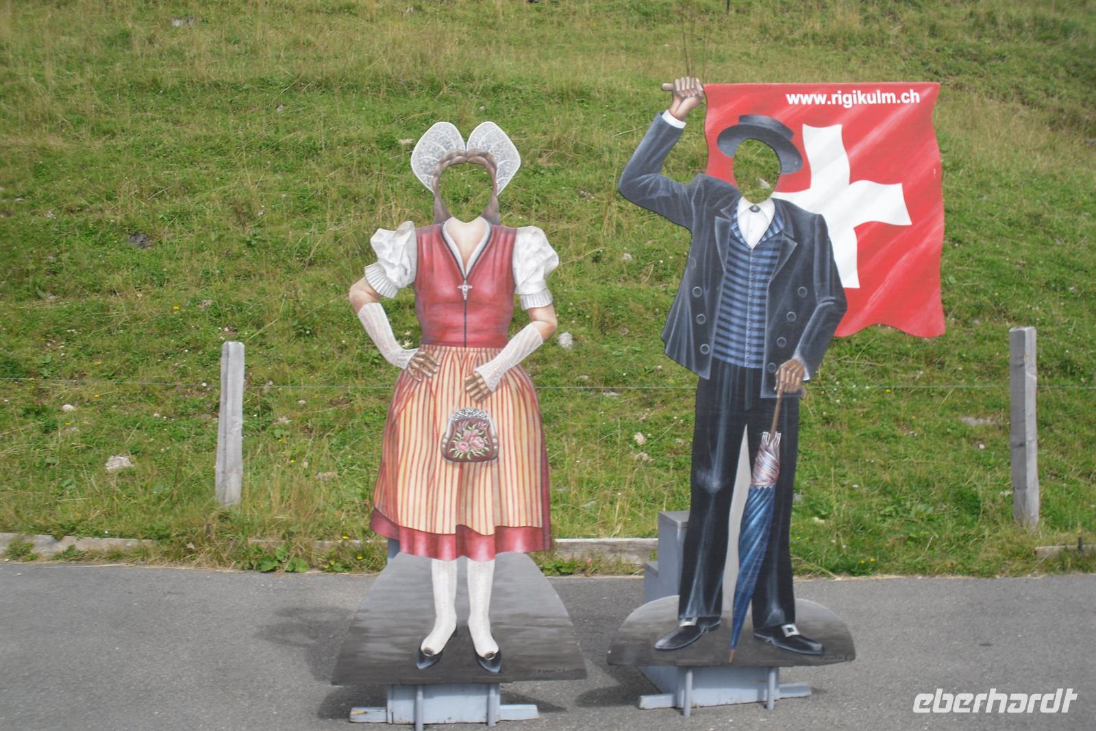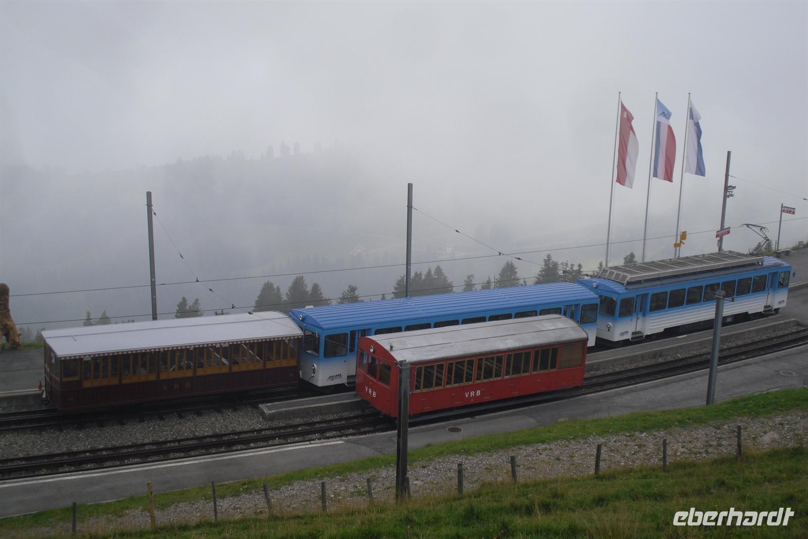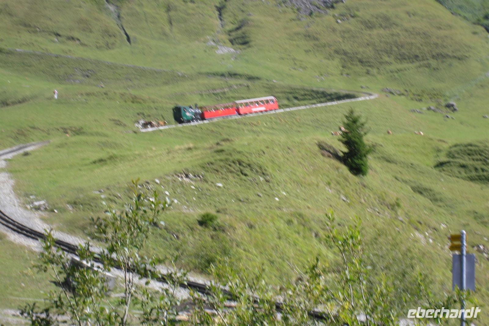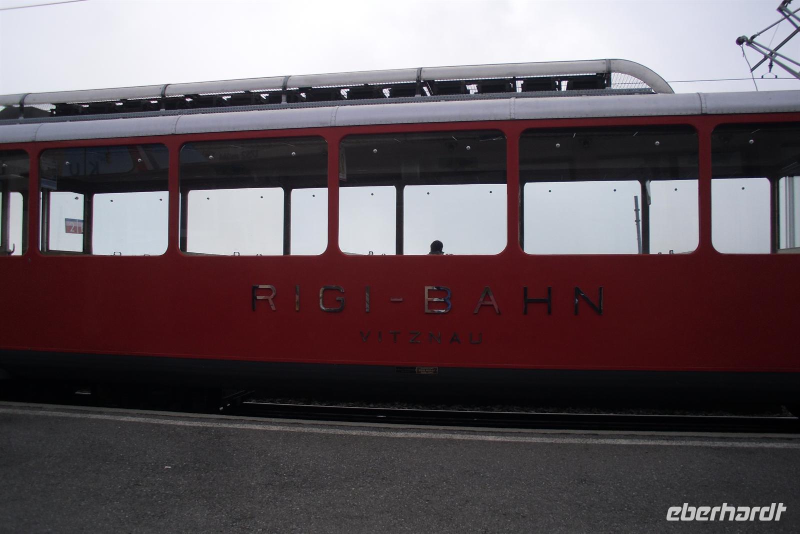 Es handelt sich hier um ein Salon-Seitenrad-Dampfschiff für zwei Klassen. Der 1901 von den Gebr. Sulzer, Winterthur, erbaute Dampfer ist übrigens der älteste Raddampfer der Schweiz und gilt heute als eines der Flakschiffe der Schifffahrtsgesellschaft des Vierwaldstättersees. Schade war nur, das wir diese herrliche 1-stündige Fahrt leider bei nicht so optimalen Wetter erleben konnten, aber da konnte ja zum Glück niemand etwas dafür! Unser Bus mitsamt unserem Buschauffeur Ingo erwarte uns letztendlich in Vitznau und von hier aus ging es über Küssnacht auf direktem Wege entlang des Zugersees nach Goldau. Der Bahnhof in Goldau war schließlich unser Ausgangspunkt zur Bahnfahrt auf die Rigi. Die Rigi ist übrigens ein Bergmassiv zwischen dem Vierwaldstättersee, dem Zugersee und dem Lauerzersee. Höchster Gipfel ist mit einer Höhe von knapp 1800 Metern über dem Meer die Rigi-Kulm, ein beliebtes Ausflugsziel. Der Berg wir oft auch als "Königin der Berge" bezeichnet. Die Ingenieure Riggenbach und Zschokke bauten die zahnradbetriebene Arth-Rigi-Bahn. Diese konnte am 4. Juni 1875 den Betrieb aufnehmen. Bereits 1907 folgte die Eröffnung des elektrischen Betriebes auf der Bergstrecke Goldau-Kulm. Diese Umstellung war eine echte Pionierleistung, denn die Arth-Rigi-Bahn war die erste normalspurige Zahnradbahn der Schweiz, die auf elektrische Traktion umstellte. Wir benötigten für die reichlich 8 Kilometer lange Strecke etwa 40 Minuten. Am frühen Nachmittag erreichten wir schließlich Rigi-Kulm - entgegen unserer Erwartungen ohne Regen und mit teilweise etwas Sicht auf die umliegenden Berge!