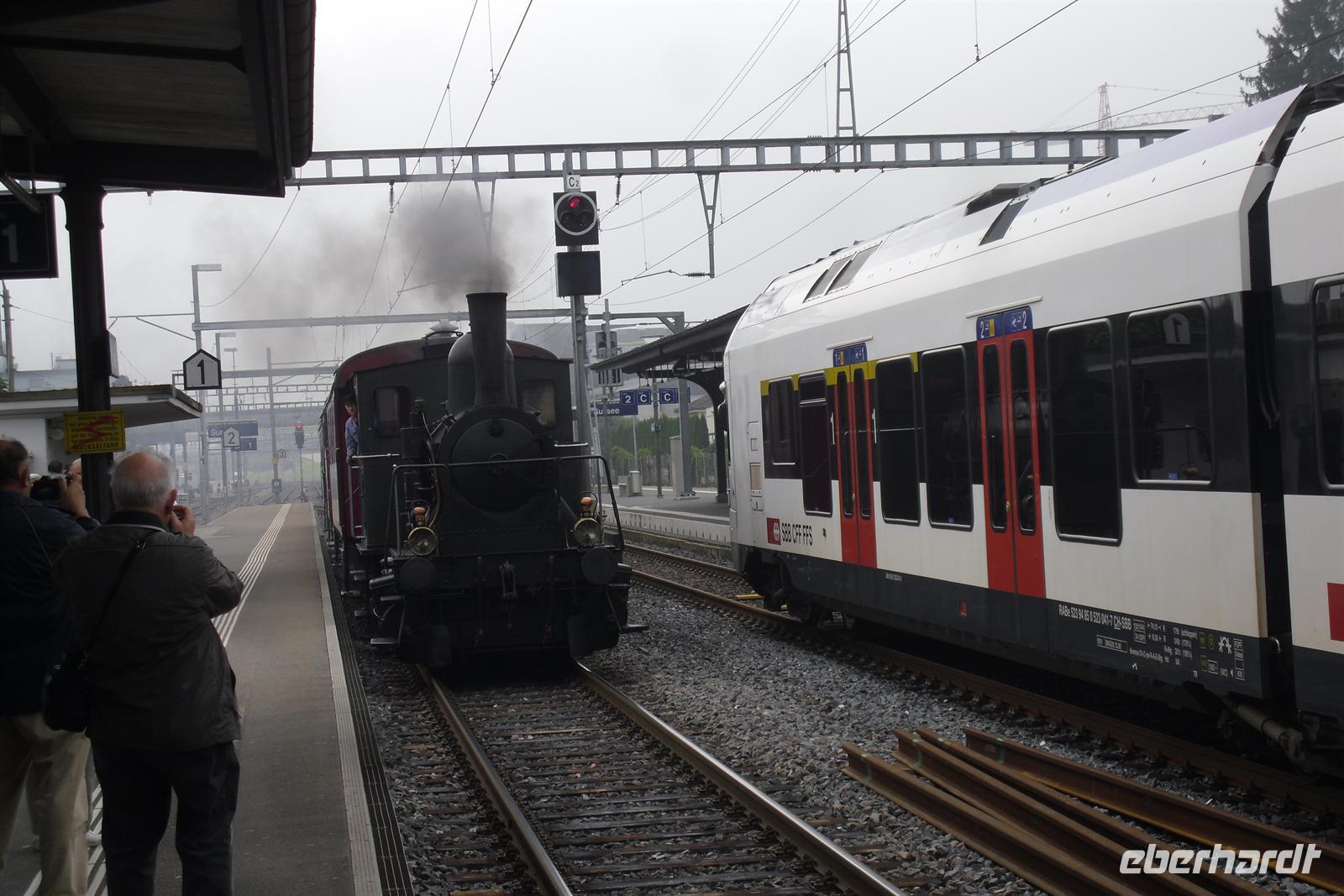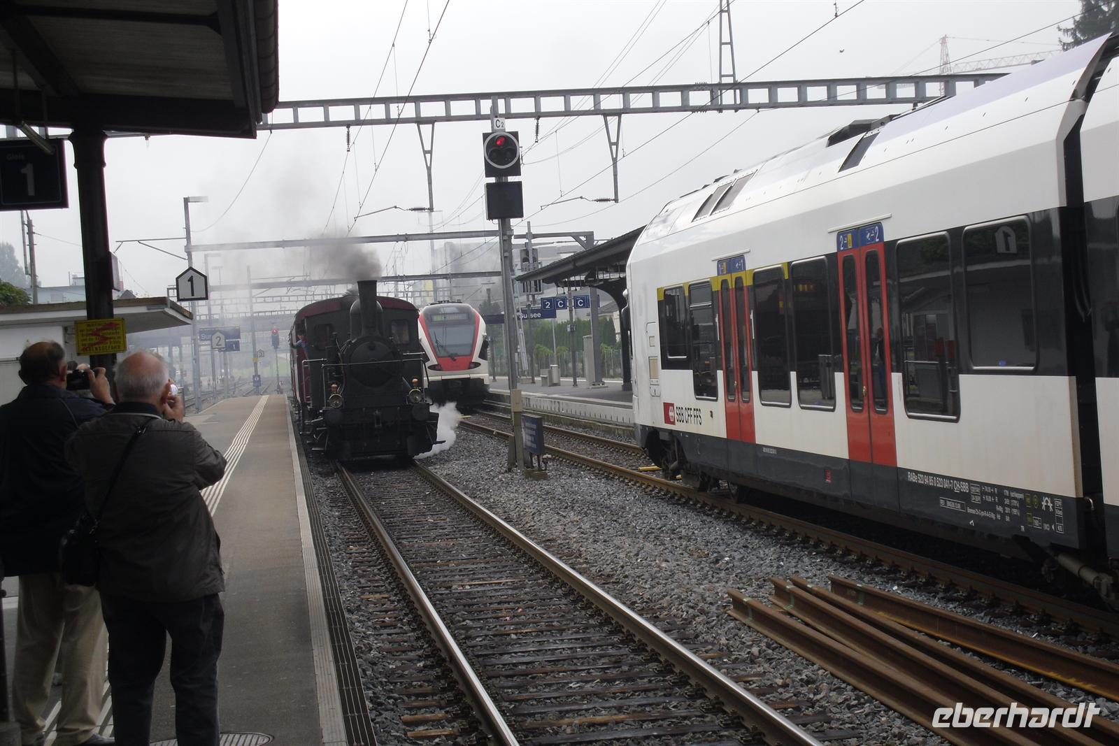 Sie gilt in der Geschichte der Schweiz als Höhepunkt des Konfliktes zwischen den Habsburgern und den Eidgenossen. Der Bahnhof in Sursee war unser Ausgangspunkt zur Fahrt mit der Sursee-Triengen-Bahn. Diese Bahn wurde am 23. November 1912 in Betrieb genommen und wurde - in der Schweiz eine Besonderheit - nie elektrifiziert. Diese 8,9 Kilometer lange Strecke führte uns von Sursee durch das Surental bis Triengen. Die Fahrt war zwar leider sehr kurz, aber intensiv. Wir fühlten uns von Anfang an wohl in den nostalgischen Wagen - noch dazu kam, dass wir exzellent bewirtet wurden. Es gab Weißwein und Orangensaft - die Stimmung war prima! Die Fahrt endete nach etwa vierzig Minuten am Bahnhof von Triengen, wo wir sogar noch die Möglichkeit hatten, in den Lokschuppen rein zu schauen - da schlugen die Herzen der Bahnromantiker höher! Unser Bus erwartete uns am Bahnhof in Triengen und von dort aus setzten wir nach einer kleinen Mittagspause unsere Fahrt in Richtung Luzern fort. Auf der Autobahn ereilte uns dann ein Mega-Stau, so dass wir ca. 1,5 Stunden kaum vom Fleck kamen!