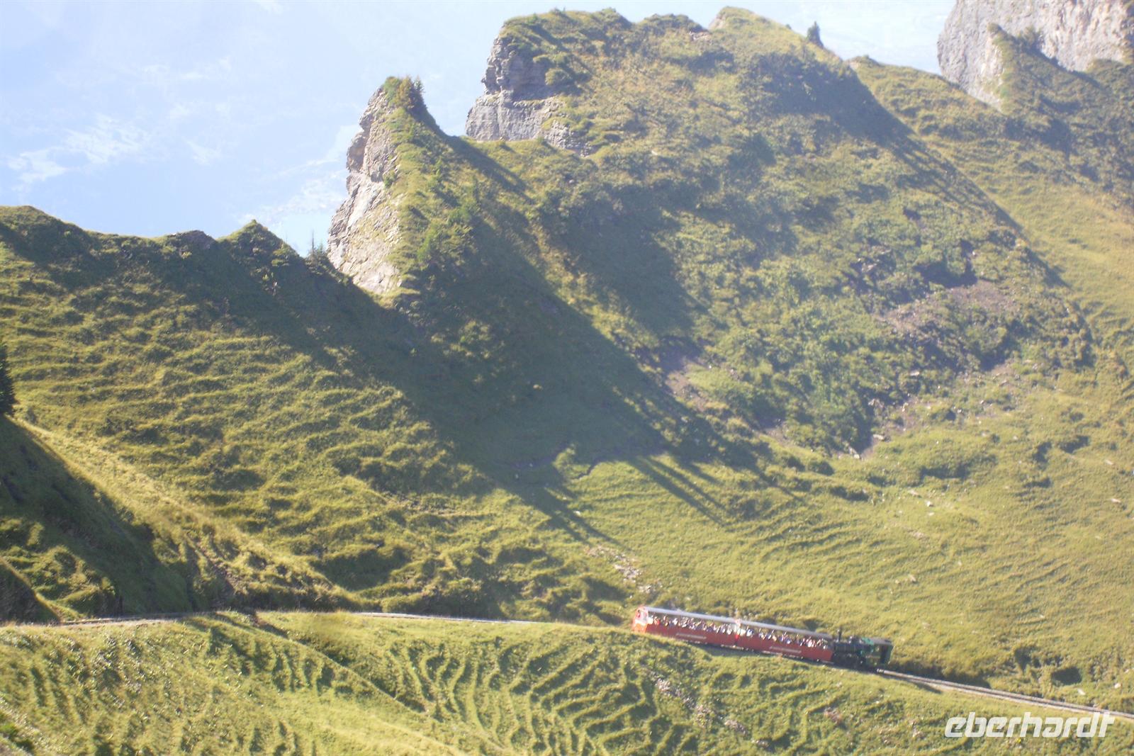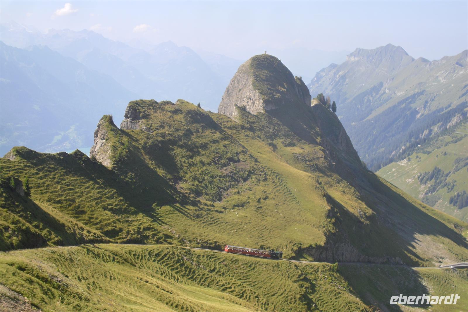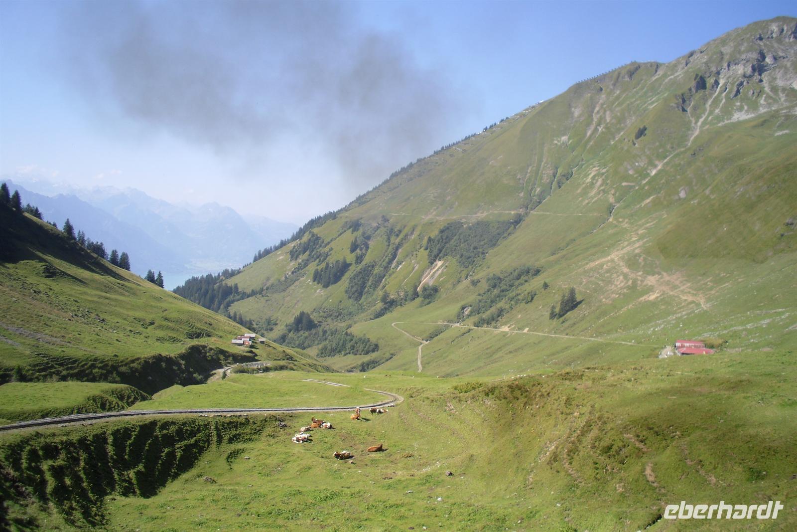 Die Zahnradstrecke mit Dampfbetrieb wurde bereits 1892 eröffnet und überwindet die etwa 7,5 Kilometer lange Strecke in 55 Minuten. Von der auf 2252 Meter hoch gelegenen Gipfelstation hatten wir dann noch einen kurzen Weg zum 2270 Meter hohen Rothorn-Kulm. Bei guter Sicht hat man von hier eine großartige Aussicht über die Appenzeller, Urner, Engelberger, Berner und Walliser Alpen - wir hatten Glück, der Wettergott meinte es gut mit uns! Wir hatten einen grandiosen Blick in die Region von Eiger, Mönch und Jungfrau. Am Nachmittag setzten wir unsere Fahrt von Brienz aus schließlich entlang des Brienzer fort. Nach einem kurzen Aufenthalt in Interlaken fuhren wir über den Brünigpass zurück nach Flüeli-Ranft.