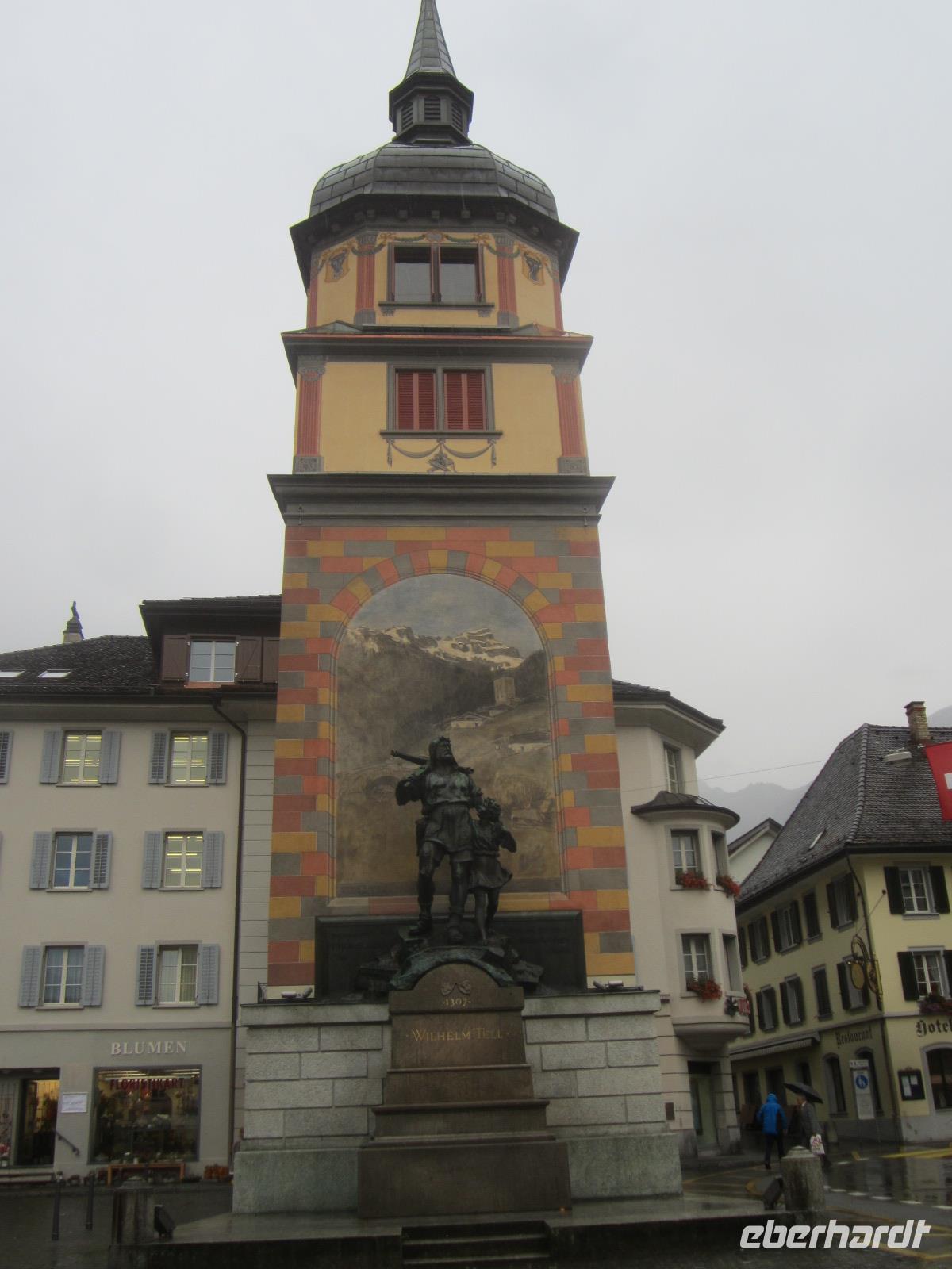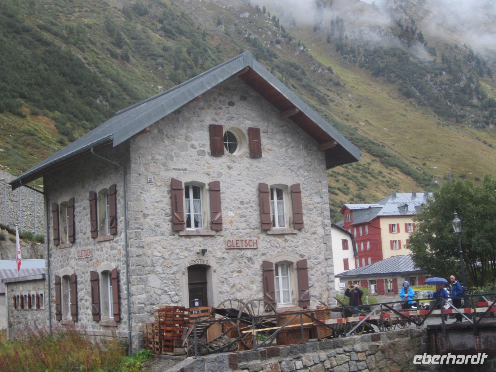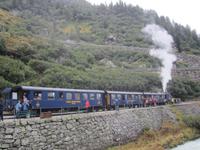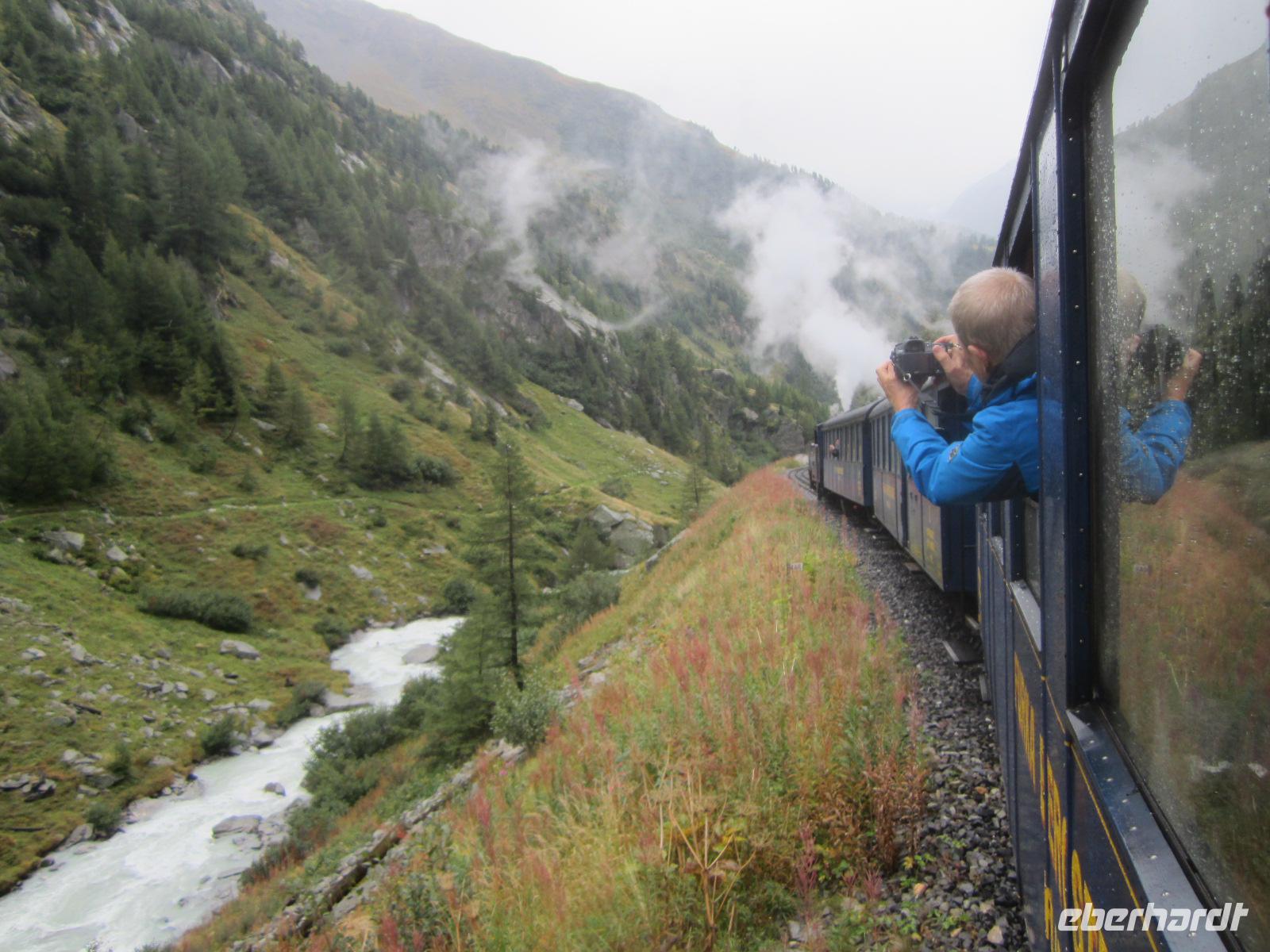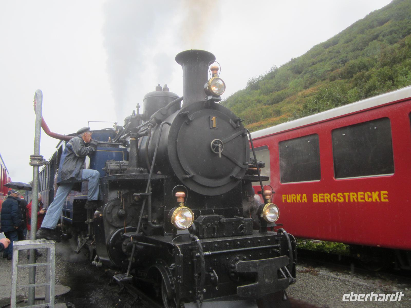 Entlang der Autobahn fahren wir nach Altdorf. Trotz Regen stoppen wir am "Türmli" dem Wilhelm Tell Denkmal. Weiter fahren wir entlang der alten Gotthardstrecke durch die Schöllenschlucht über die Teufelsbrücke nach Andermatt und weiter nach Realp. Die Dampfbahnfans und Fotografen benötigen Zeit in Realp und die haben wir geplant. Eine halbe Stunde vor Abfahrt sind wir am Bahnhof. In der Furka-Dampfbahn haben wir reservierte Plätze. Interessant ist nicht nur der Bahnhof und die Bahn, sondern die Gespräche mit dem Personal. Die ehrenamtlichen Mitarbeiter (Fronis) sind auch während der Fahrt interessante Bahnbegleiter. Dankbar äußern sie sich zu den vielen deutschen ehrenamtlichen Mitarbeitern. (11 ausländische Sektionen sollen es sein, die die Furkabahn unterstützen.) Unsere Fahrt beginnt pünktlich 10.15 Uhr. Besondere Erlebnisse sind die Tunnelfahrten. Schnelles Fensterschließen ist notwendig! Aber auch die Pausen unterwegs versprechen gute Fotos z.B. beim Wasserfassen an der Station Tiefenbach. Am