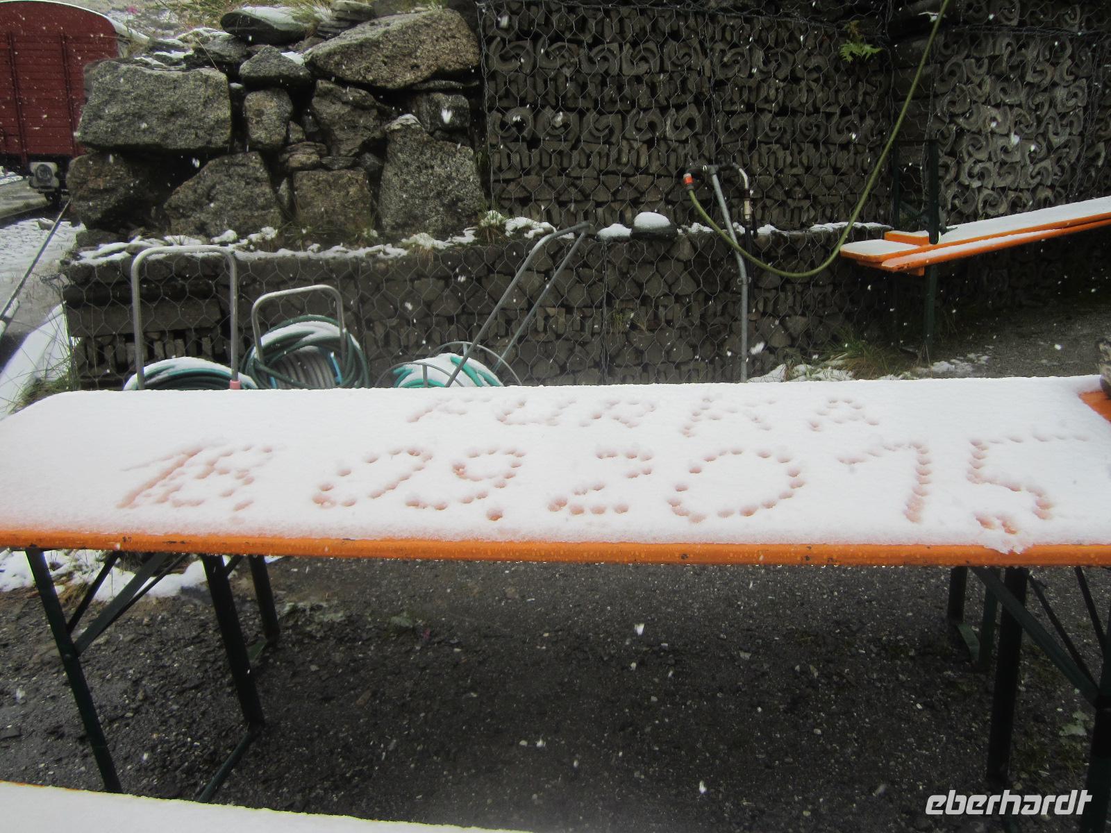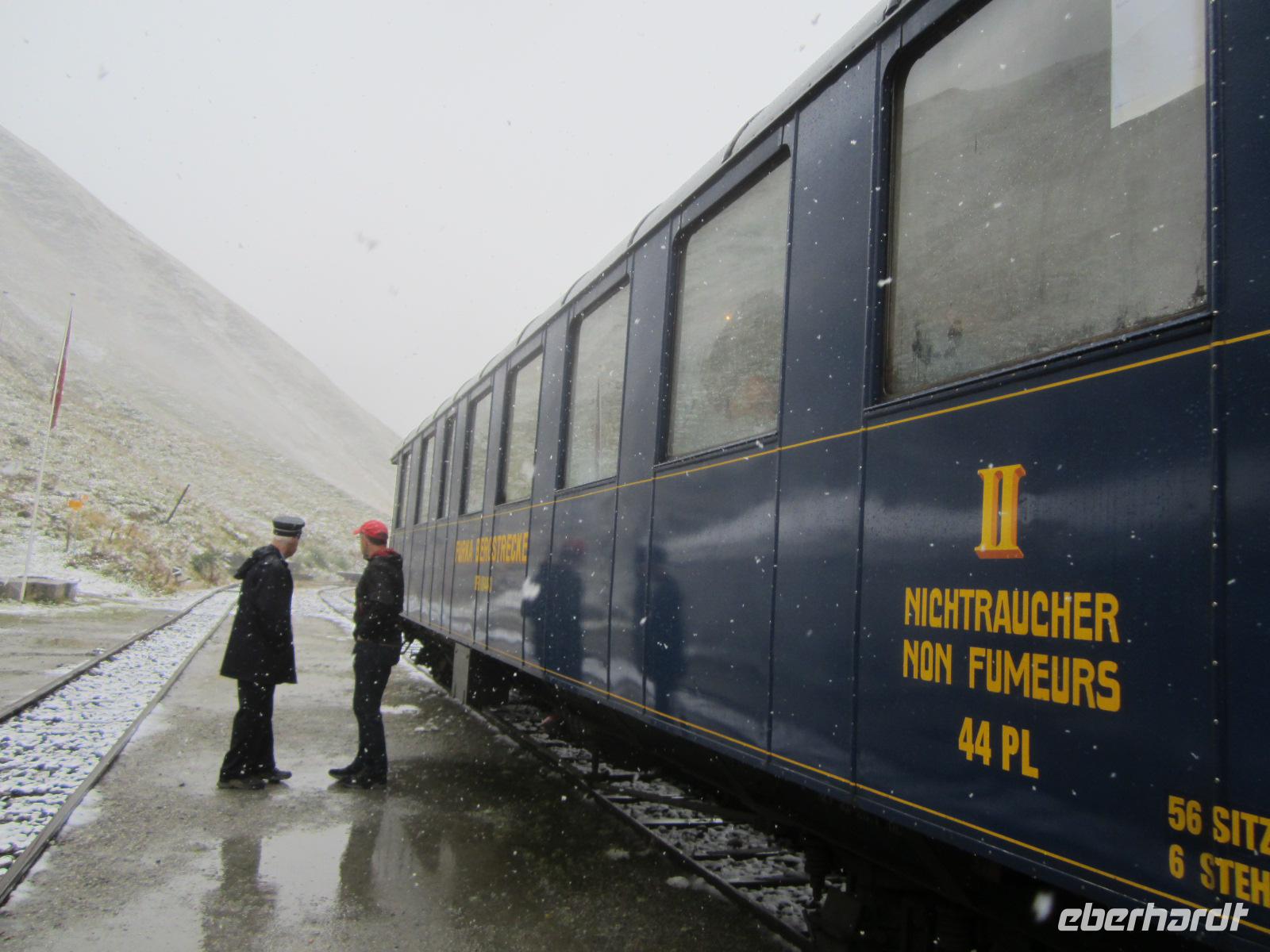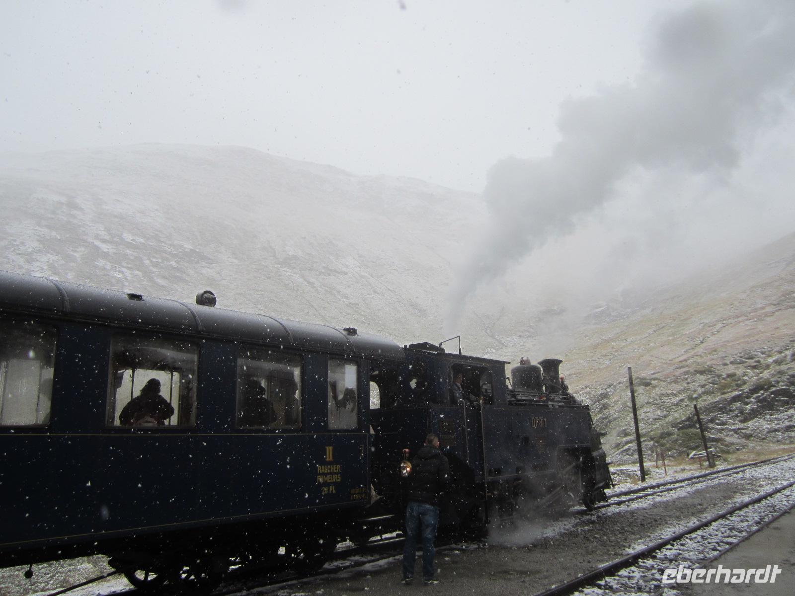 werden wir nicht nur mit Schnee sondern auch mit einen Aperto überrascht. Zum Wohl und auf eine gute Fahrt. Nach dem Durchqueren des Tunnels haben wir nur einen kurzen Blick auf die Furka-Passstraße. Der Rhonegletscher, der sich 1900 noch bis nach Gletsch zog ist während unserer Fahrt mit der Bahn nicht zu erkennen. Die Strecke Gletsch bis Oberwald wurde für die Dampfbahn erst 2010 eröffnet und in Oberwald angekommen wartet schon Reiner auf uns. Zurück fahren wir mit dem Bus über den Furkapass wir haben noch eine Überraschung für die Dampfbahnenfans. Wir sind eingeladen zu einer Depotführung der Furka-Dampfbahn. Ein Erlebnis der besonderen Art. Es regnet weiter und wir fahren zurück ins Hotel entlang der Schöllenschlucht und der Autobahn wieder nach Flüeli Ranft.