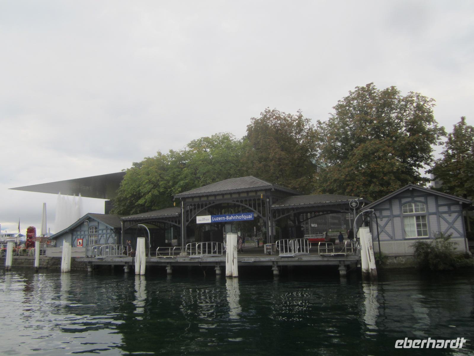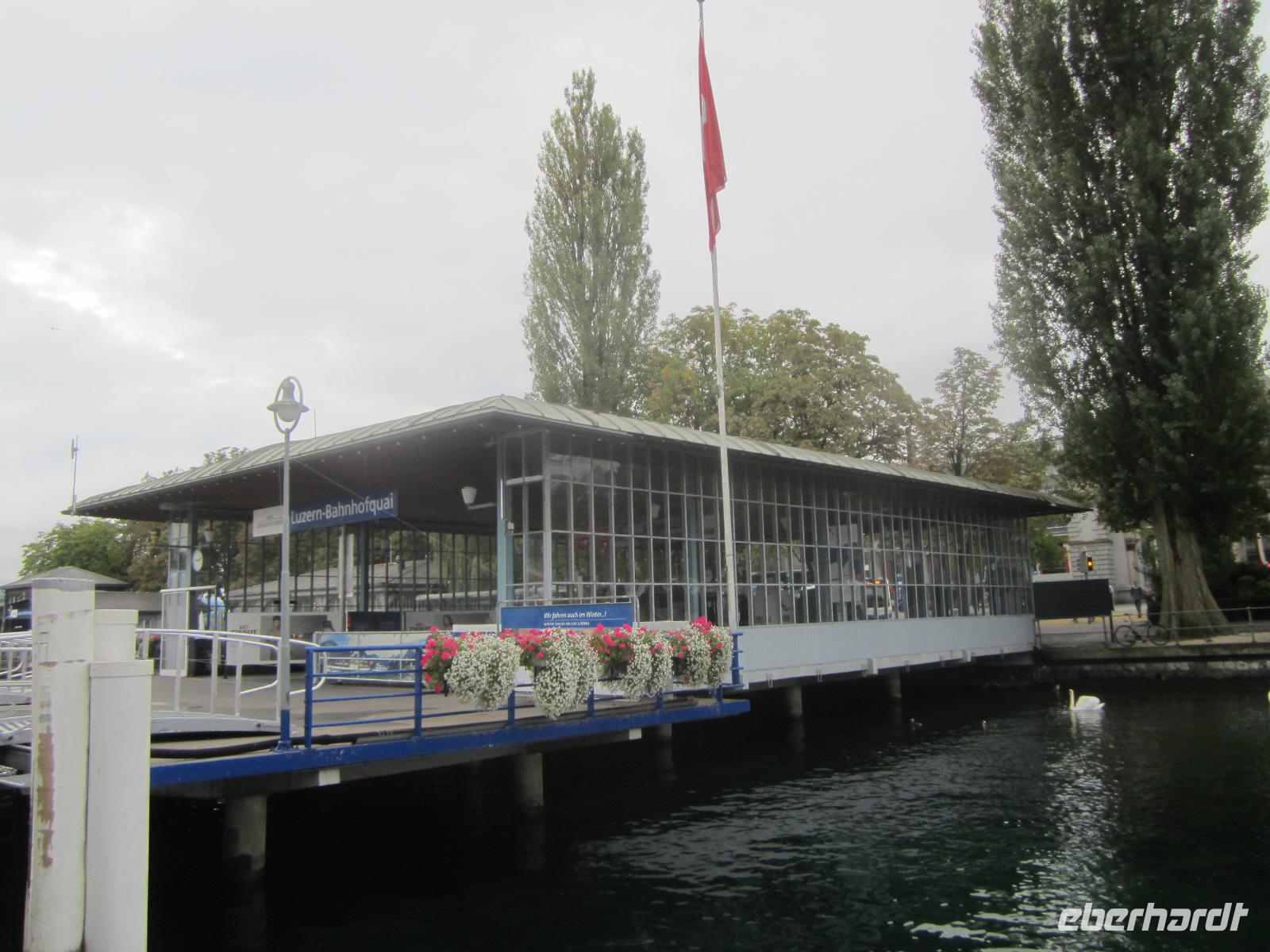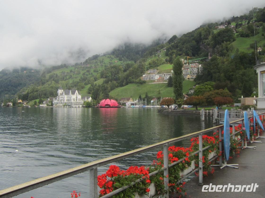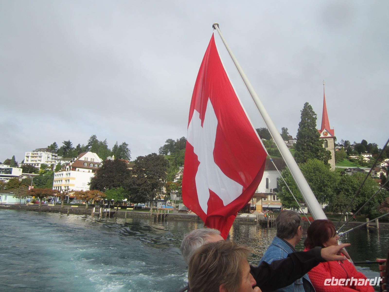 Wir haben einen schönen Blick auf die Pilatusbahn,die zum Hausberg von Luzern fährt, bevor wir in die Stadt fahren. Unser Bus parkt auf den Parkplatz Inseli hinter dem Kultur-und Kongress- Zentrum von Luzern. Wir spazieren zur Brücke 1 gegenüber dem Bahnhof um mit dem Raddampfer "Uri" nach Vitznau zu schippern. Dieses Dampfschiff wurde 1901 von den Gebr. Sulzer in Winterthur gebaut und ist der älteste Raddampfer der Schweiz. Weitere 4 Raddampfer gehören zur Flotte. Erinnern möchte ich an dieser Stelle, das die «Stadt Luzern», 1928 von den Gebr. Sachsenberg in Rosslau a/Elbe erbaut wurde und das letzte für einen Schweizer See gebaute Dampfschiff ist.